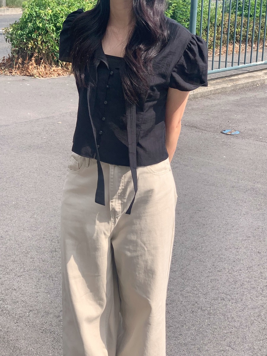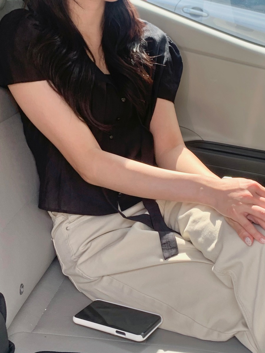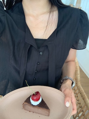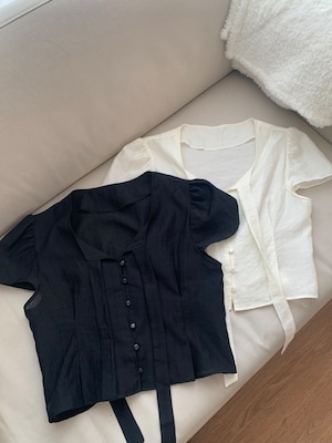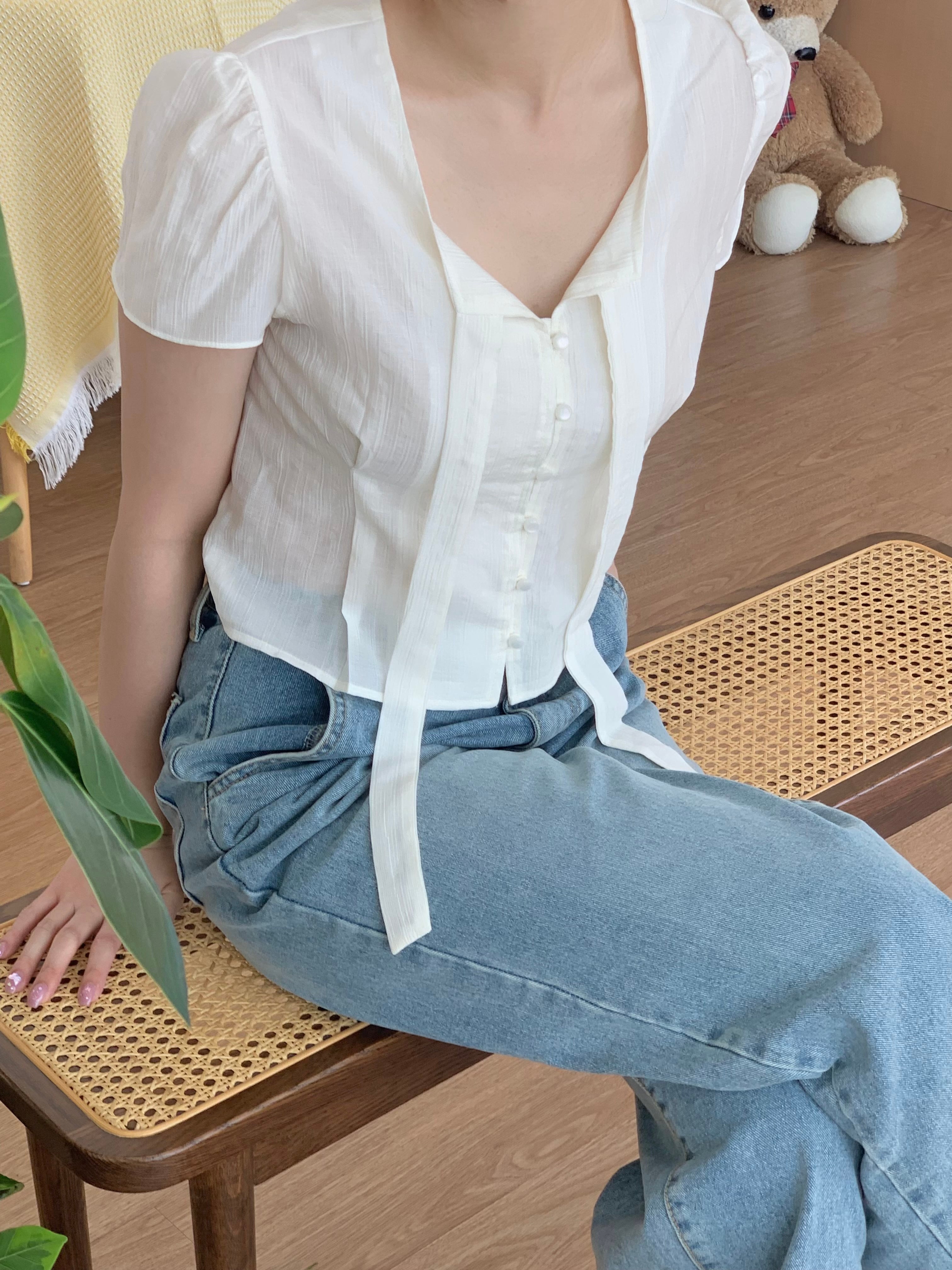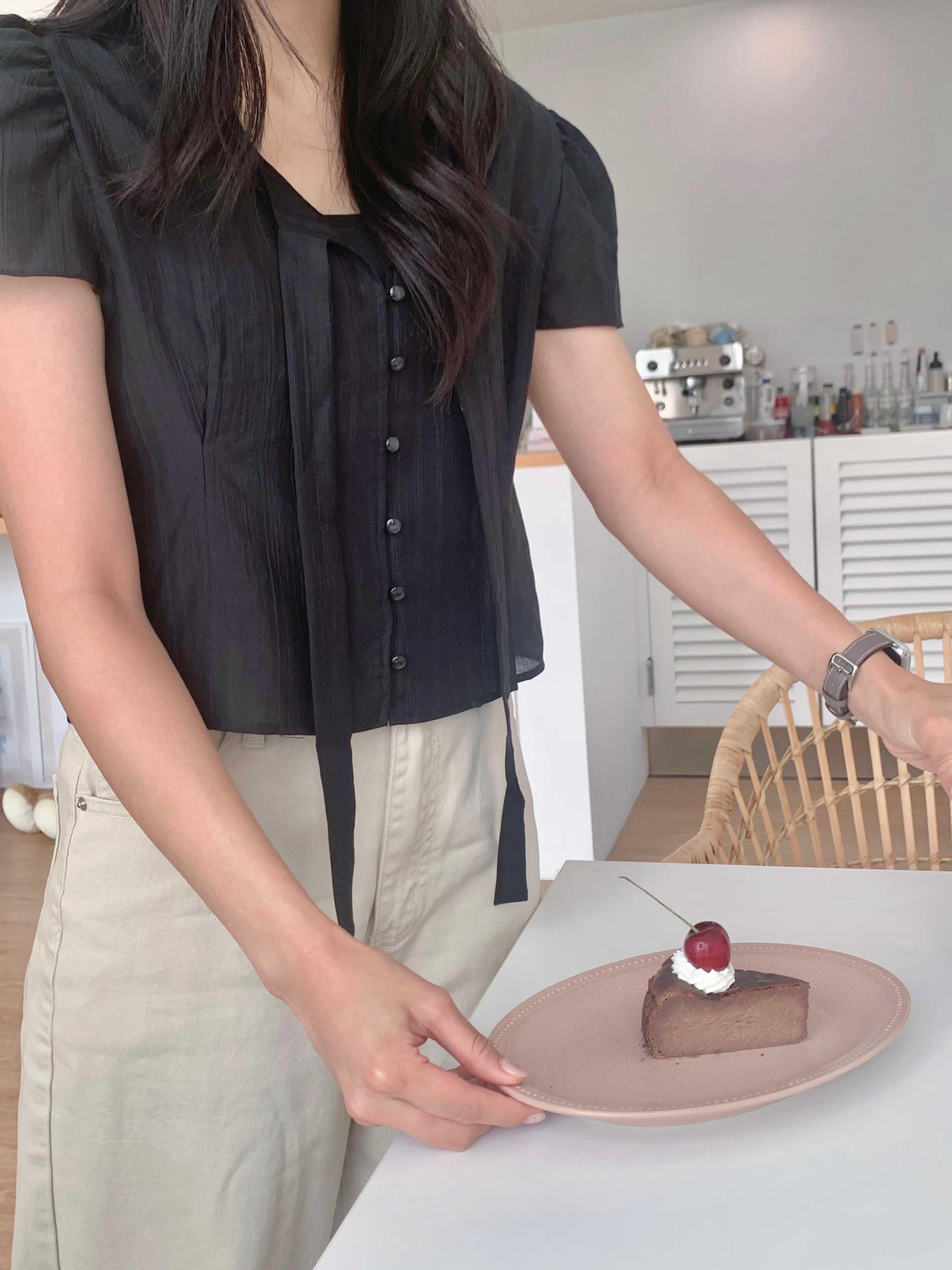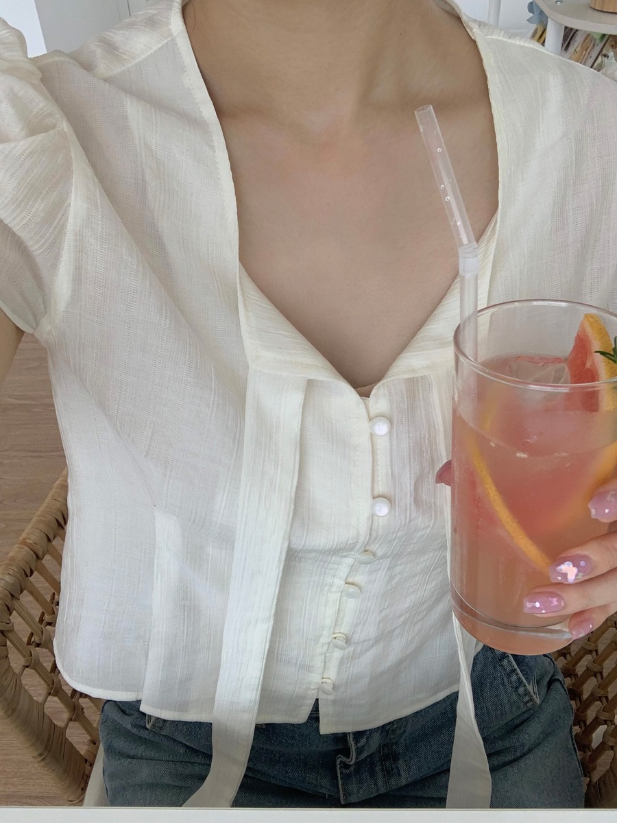 ナチュラルな上品さが魅力のブラウス。柔らかく軽やかな素材感で着心地も抜群。ふんわりとした袖がフェミニンさを引き立てつつ、気になる腕周りをさりげなくカバーしてくれます。バック部分にはウエストラインを引き締めるスモックゴム仕様でくびれを綺麗に引き締めてくれます。リボンで変化がつけられるネックストリングとフロントのボタンが大人可愛いアクセントになり、やや短めのセミクロップド丈で脚長効果も!どの体型の方にもおすすめできるシルエット。カジュアルにもきれいめにも合わせやすく、デイリーからオフィスコーデにも幅広く活躍する一枚です。