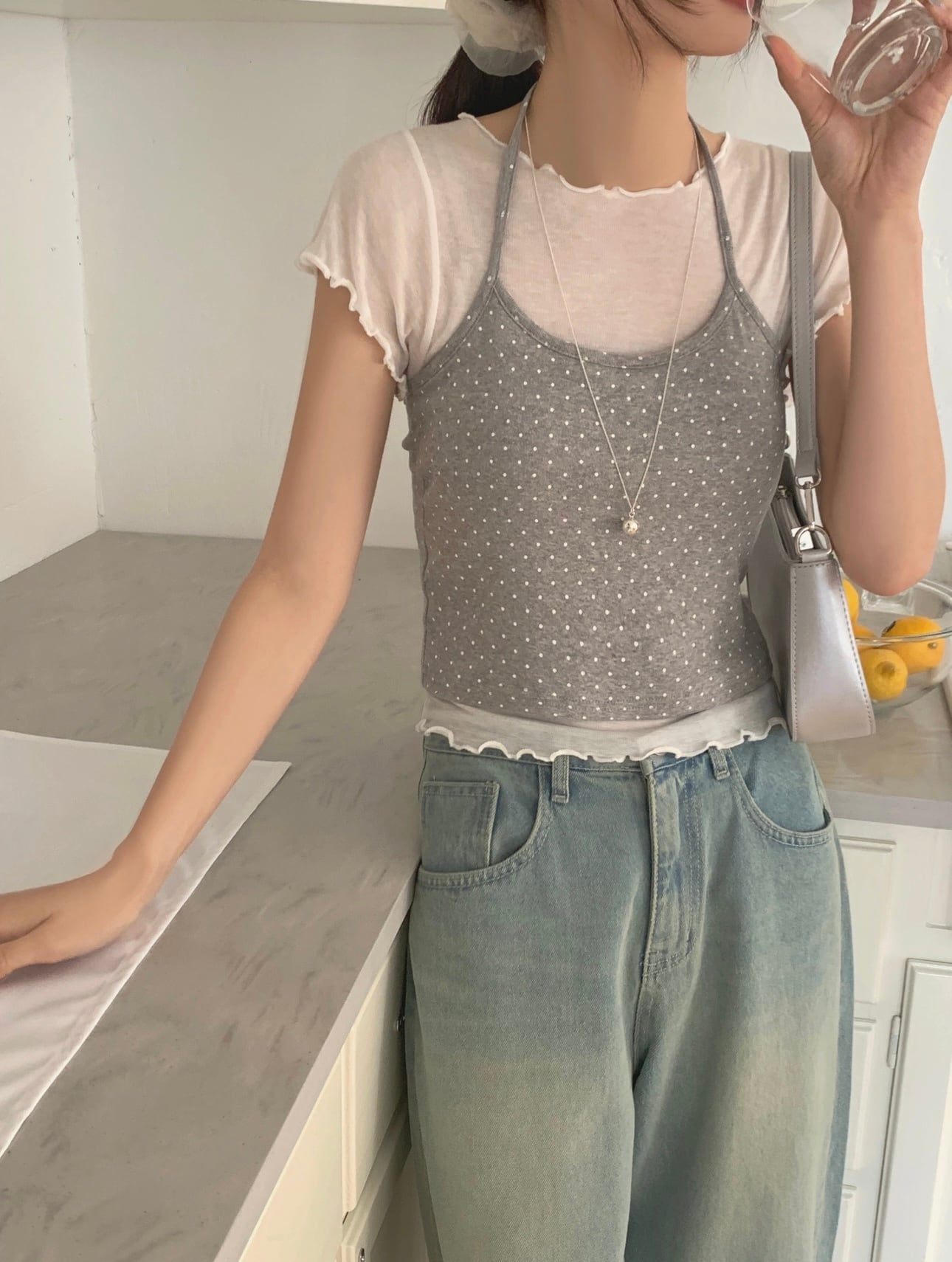 ガーリーからカジュアルまで活用度満点のドットホルターキャミソール。ネックラインを包むホルターネックデザインで全体的にスリムなフィットです。カップ付きなので1枚でさらっと着用でき、ウエストラインもすっきりと見えるデザイン。ドット柄の見た目の可愛さがインナーとしてもレイヤードしてもおしゃれに着こなせるトレンドアイテムになっています。minengで発売中の【Sheer Halter Blouse】とレイヤードしたり、人気アイテム【RotiPunching Cardigan】のインナーとして合わせても相性抜群です!夏には涼しい印象を与え、レイヤードすることでオールシーズン着用いただけるアイテムになっているかと思うので今から長くご活用いただけるアイテムになっています。