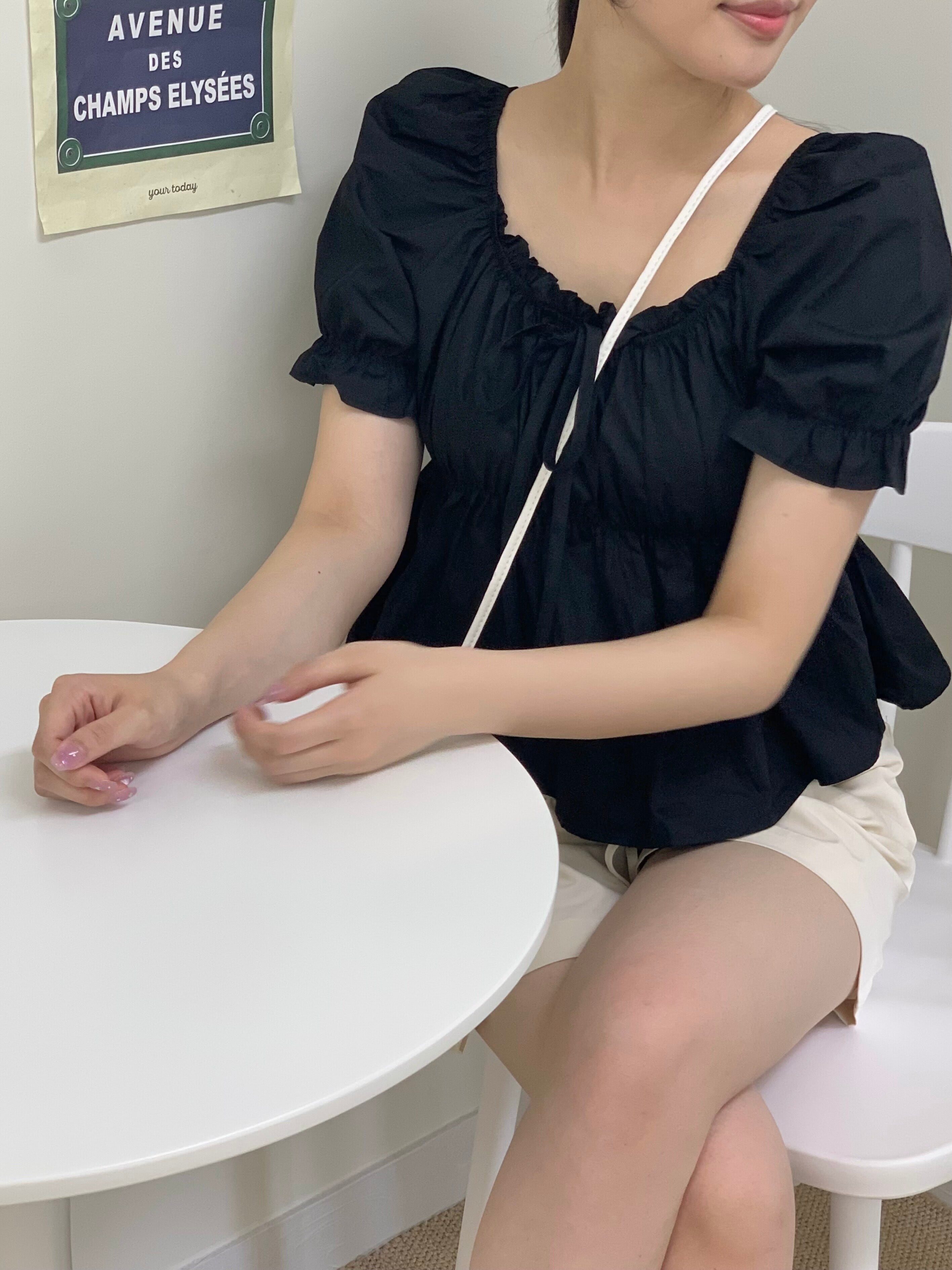 ラブリーなムードをぎゅっと詰め込んだブラウス。鎖骨が綺麗に見えるスクエアネックにフリルディテールで女性らしさ、デコルテ周りもすっきりと。パフ袖のデザインでふんわりとしたボリューム感のあるシルエットが可愛らしく、五分丈ショルダーでバンディングディテールのためオフショルの着こなしも可能。フロントリボンストラップは結び方次第で雰囲気も変えることができます。立体感がボディラインをふんわり包みこんでくれてフェミニンな印象に。柔らかな質感と軽い厚みで涼しく着用できるブラウスです。