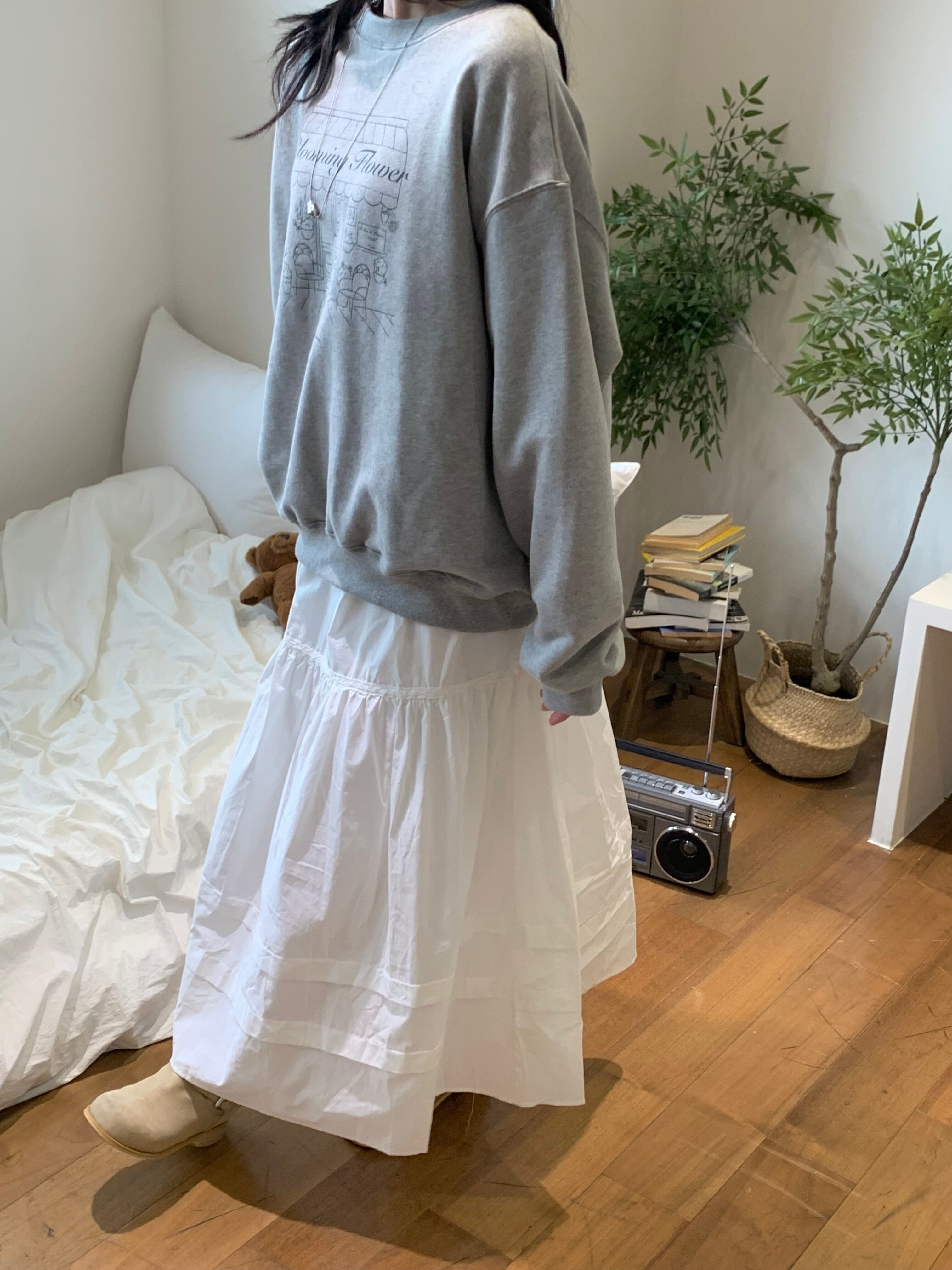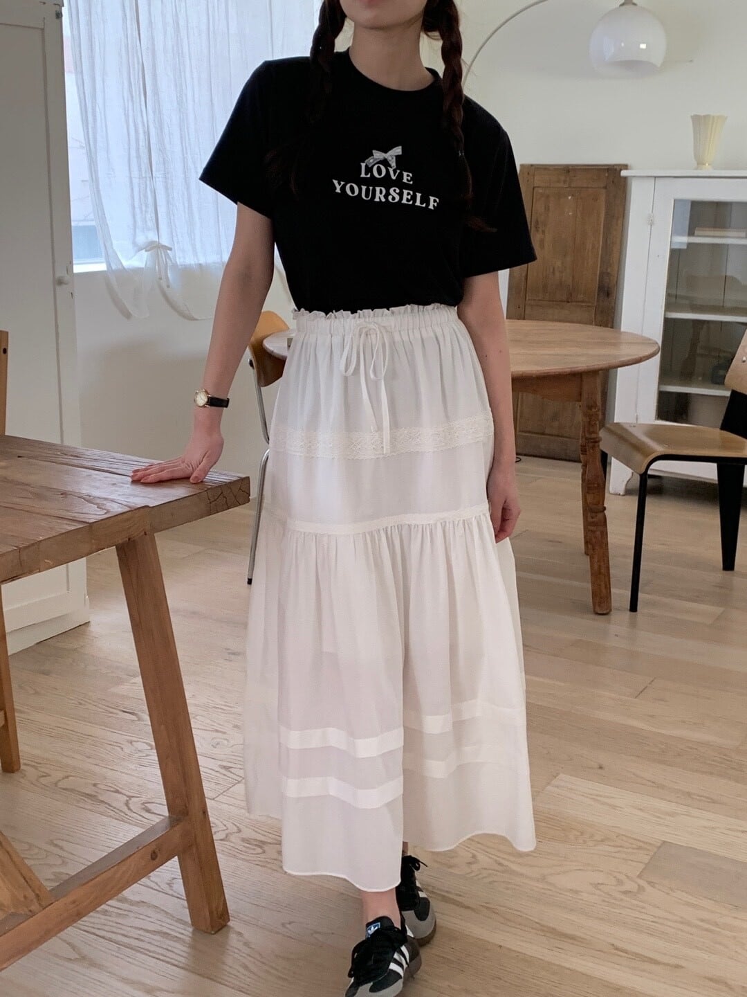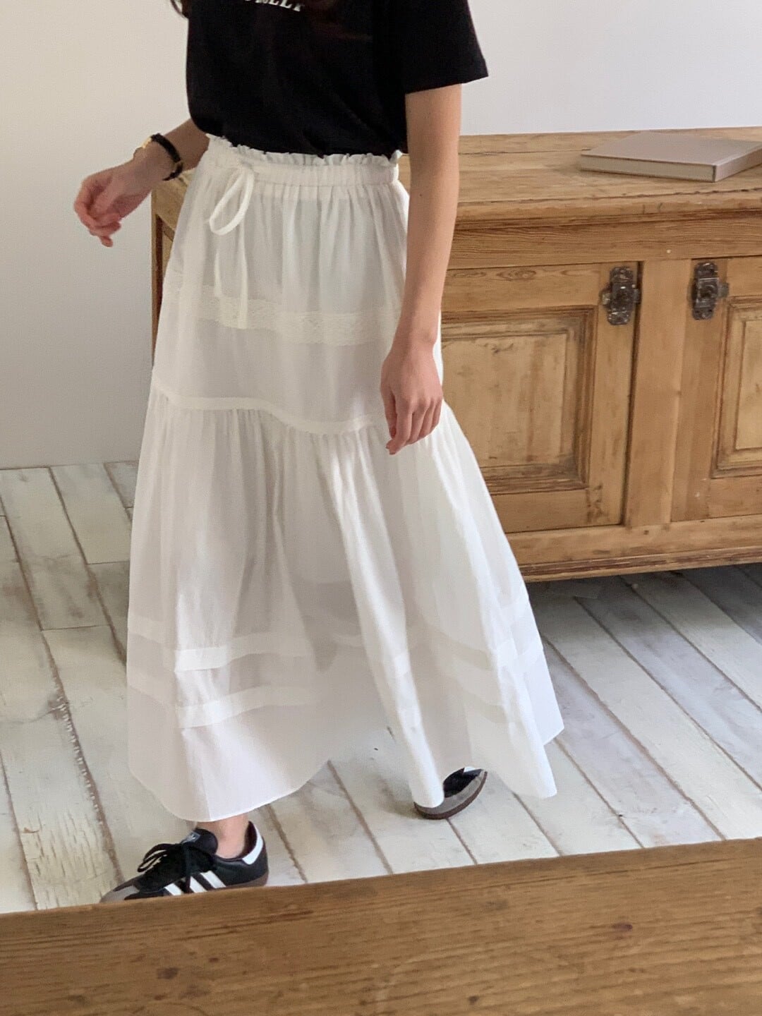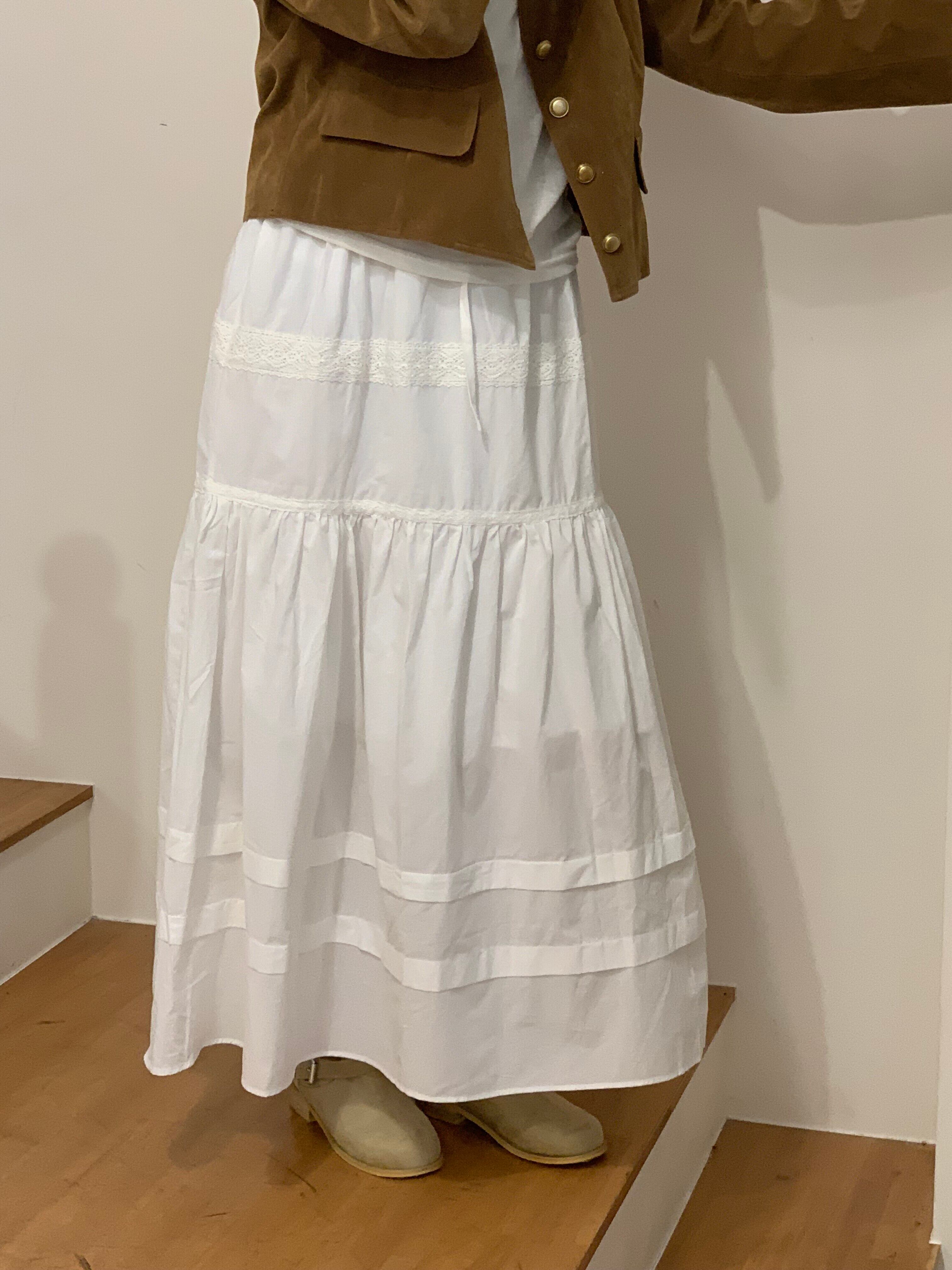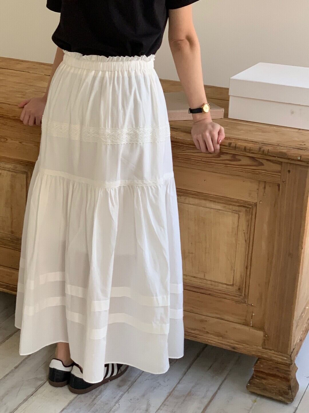 軽やかなコットン素材で仕立てたホワイトロングスカート。ウエストはゴム仕様でリラックス感がありつつ、レースと切替デザインが女性らしいニュアンスに。歩くたびにふんわり広がるシルエットで、カジュアルからきれいめまで幅広く活躍。シンプルなTシャツを合わせればデイリーに。合わせるトップスによって様々なコーディネートが可能。ロングシーズン活躍する一着になっています。