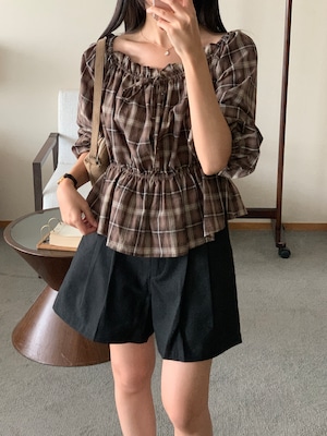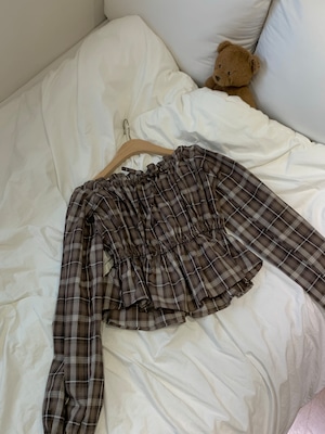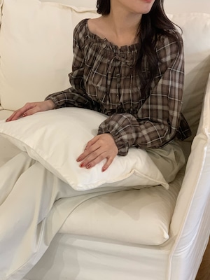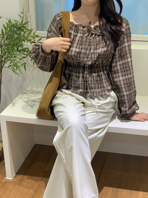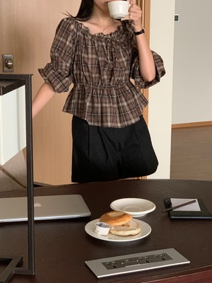シーズンムードを高めてくれる落ち着いたブラウンカラーのチェック柄のブラウス。
