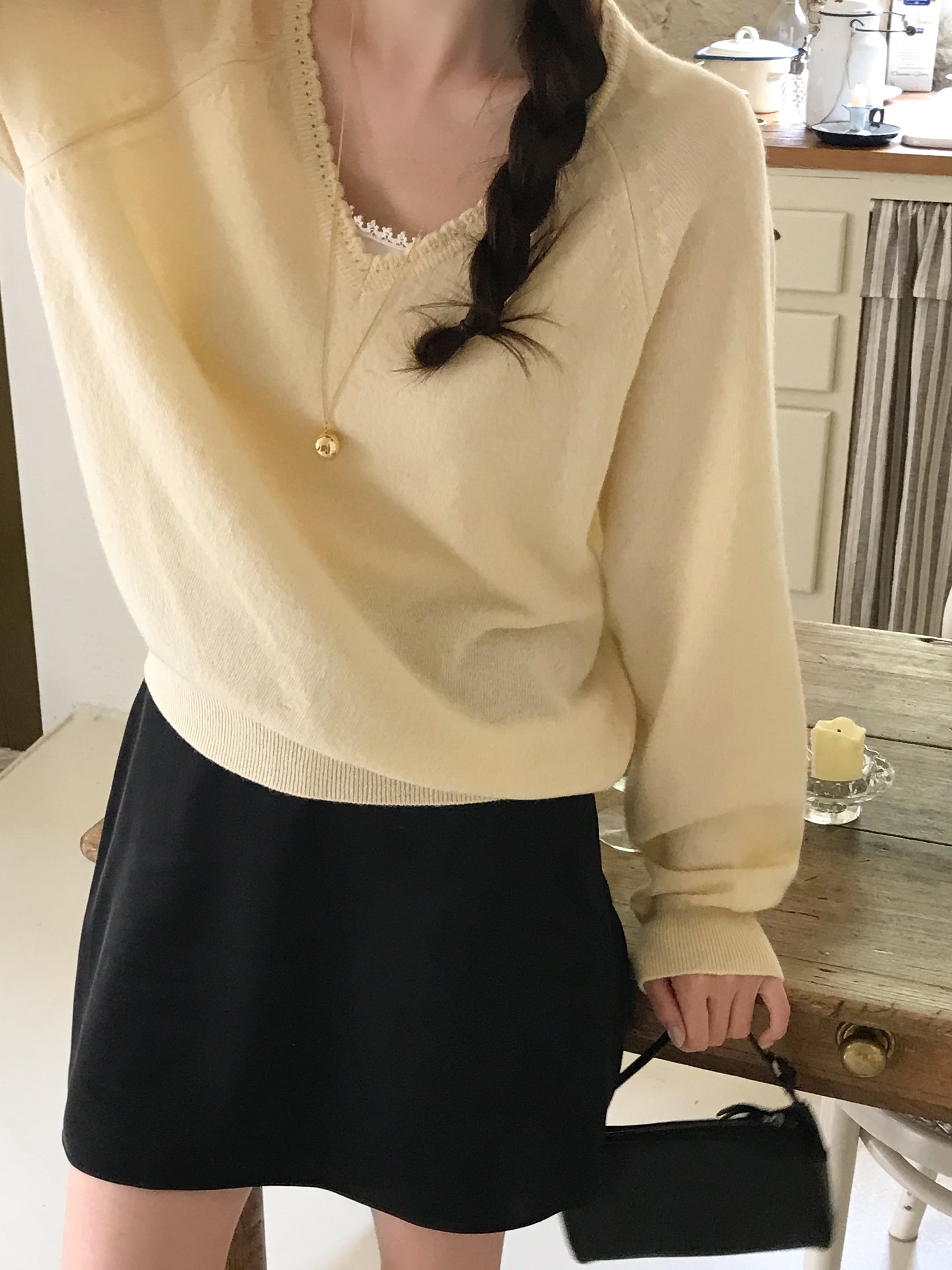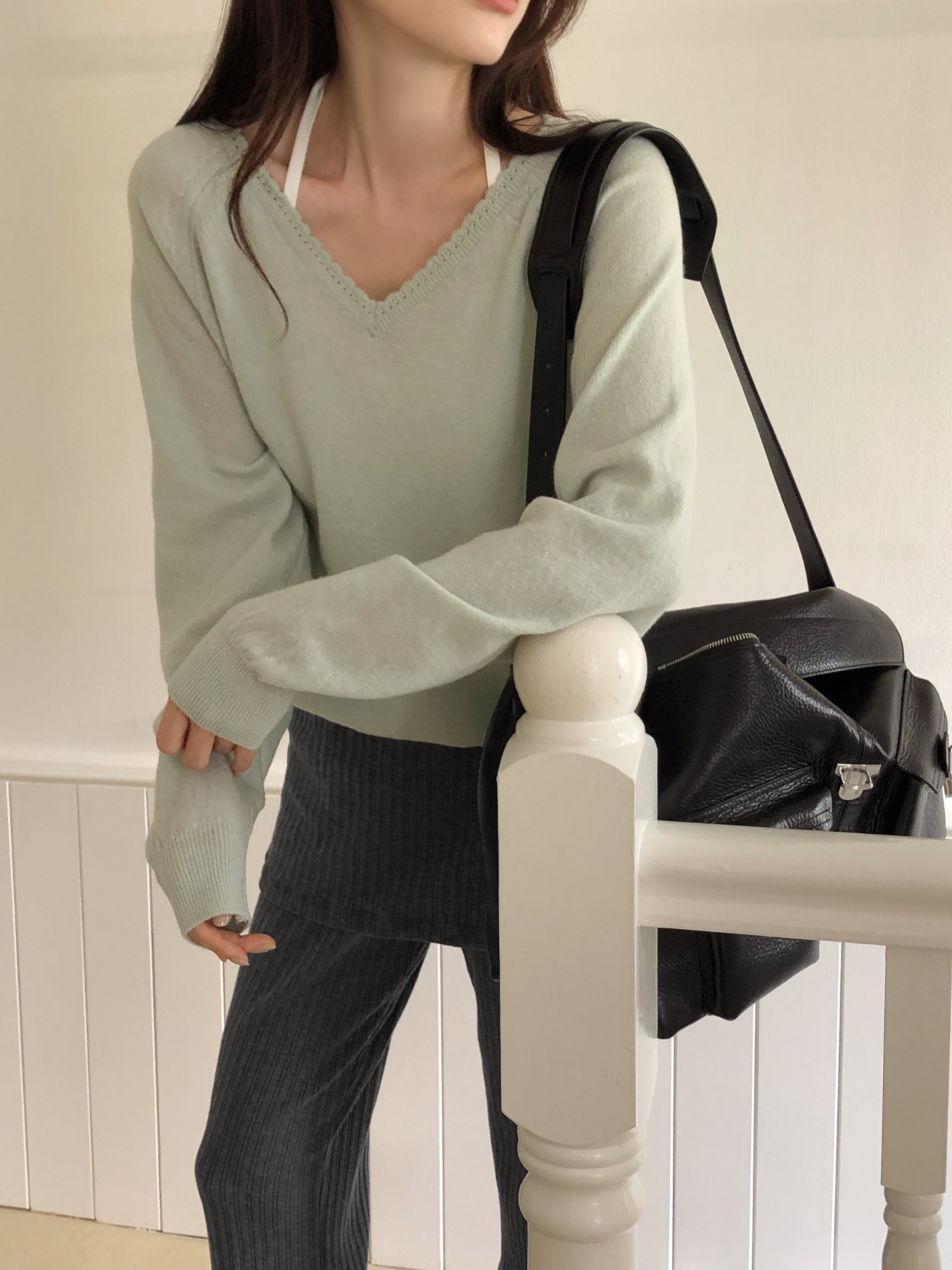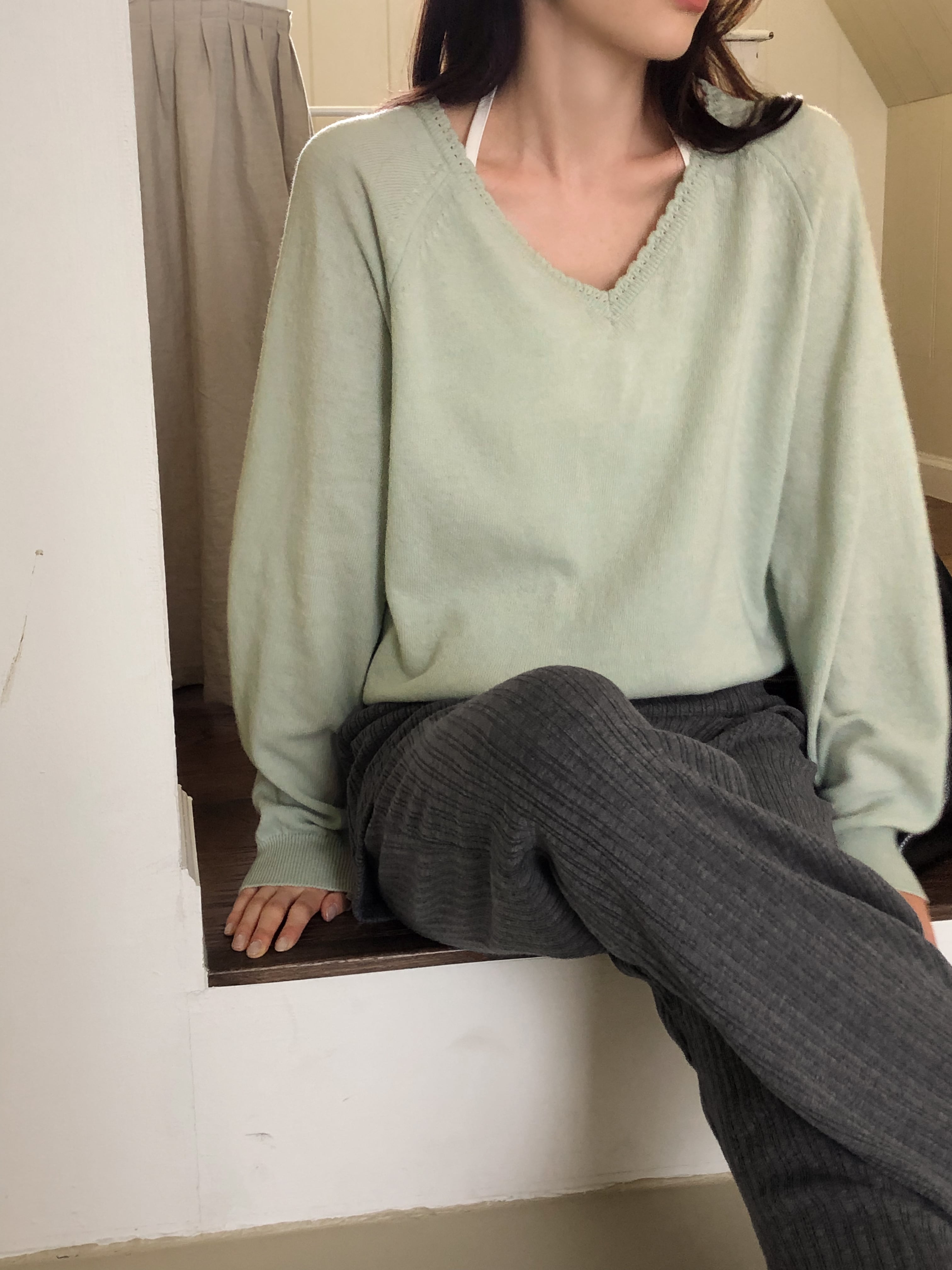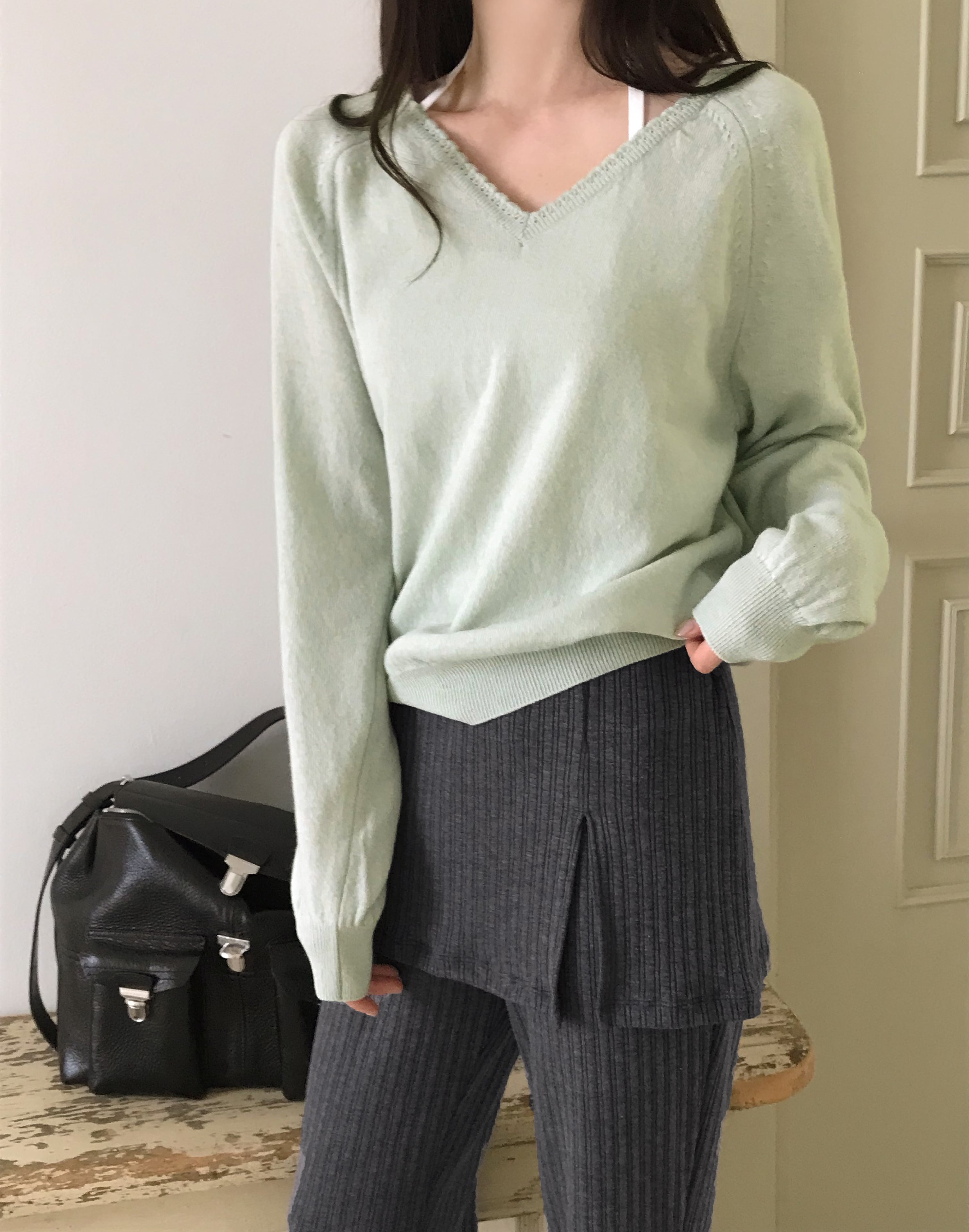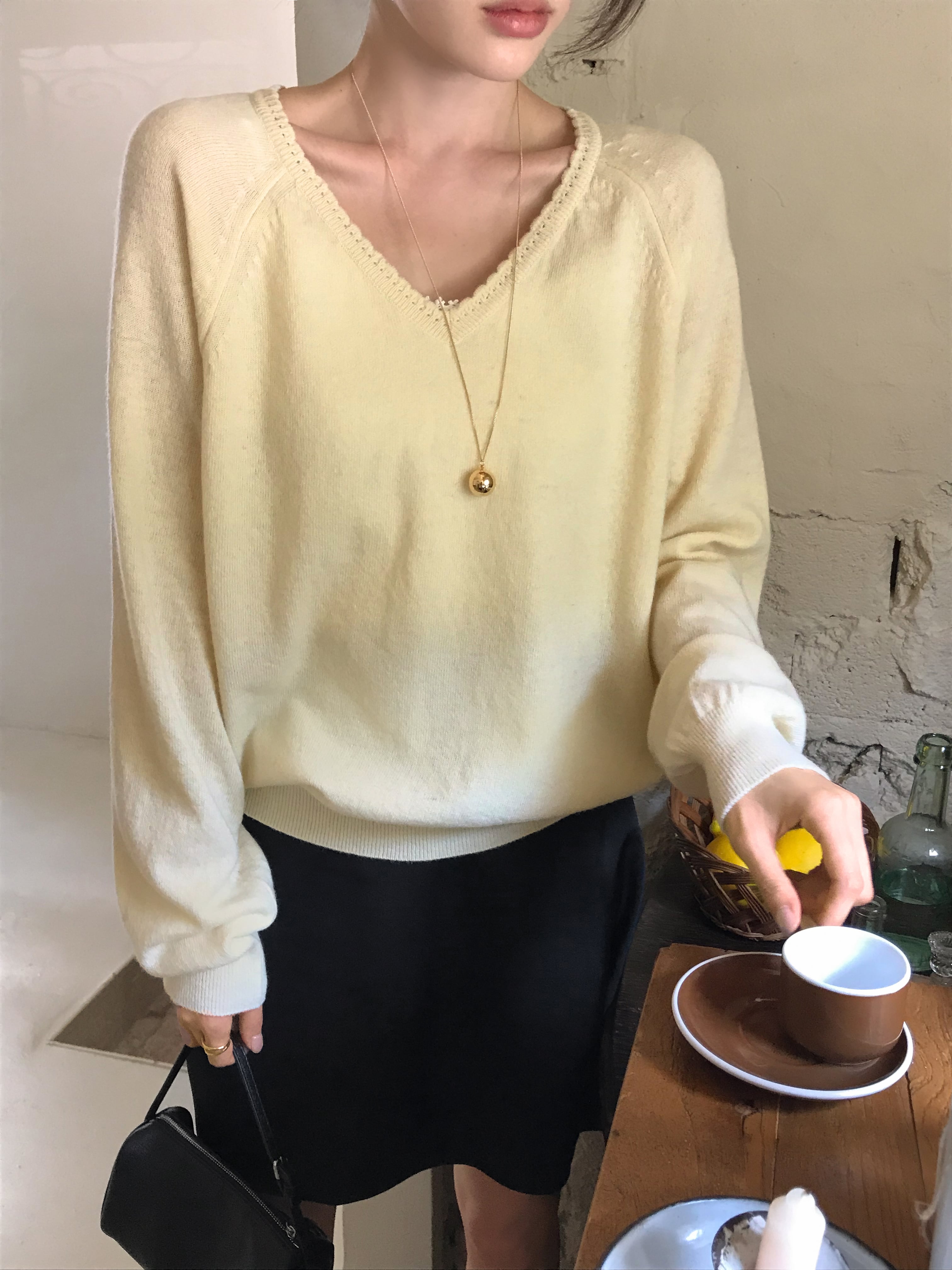 ふんわりと柔らかな肌触りが魅力のVネックニット。