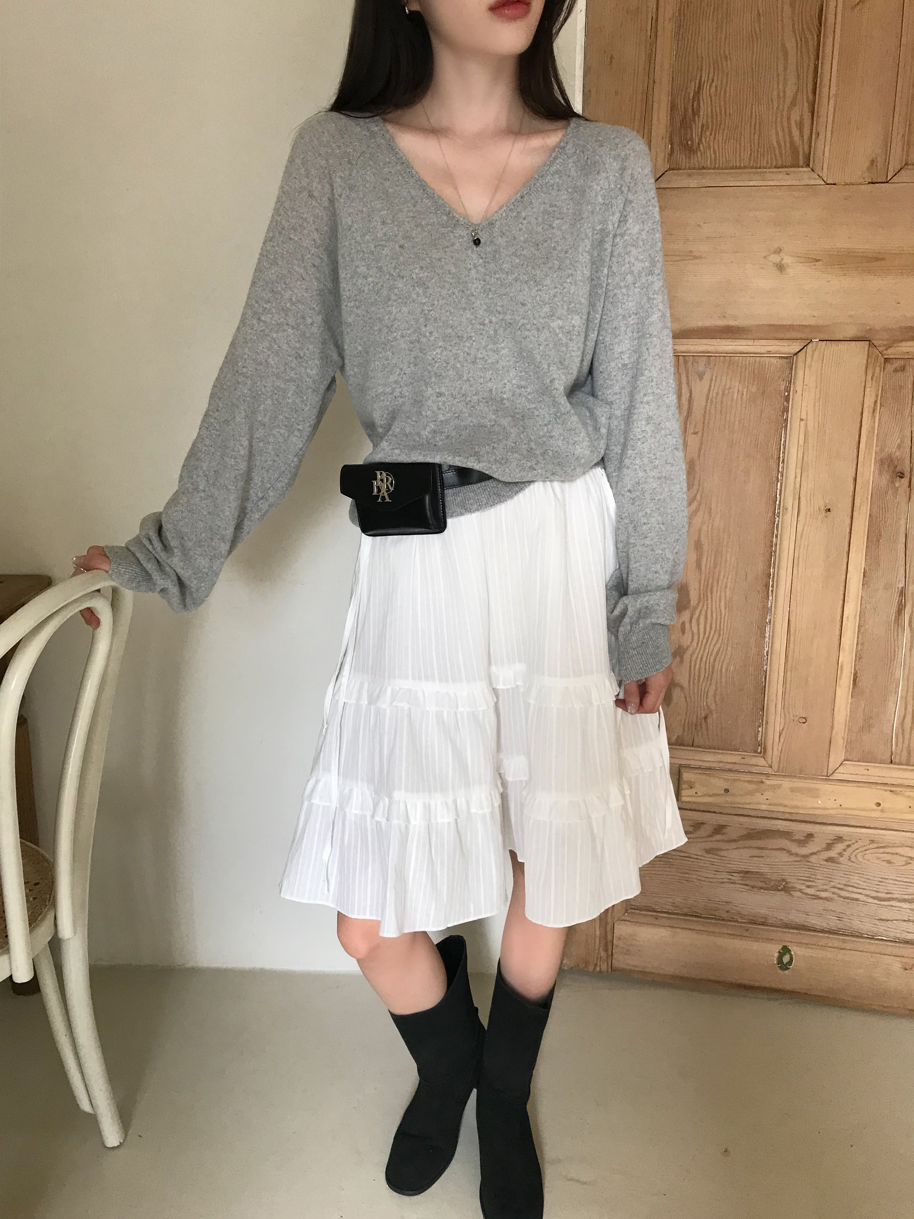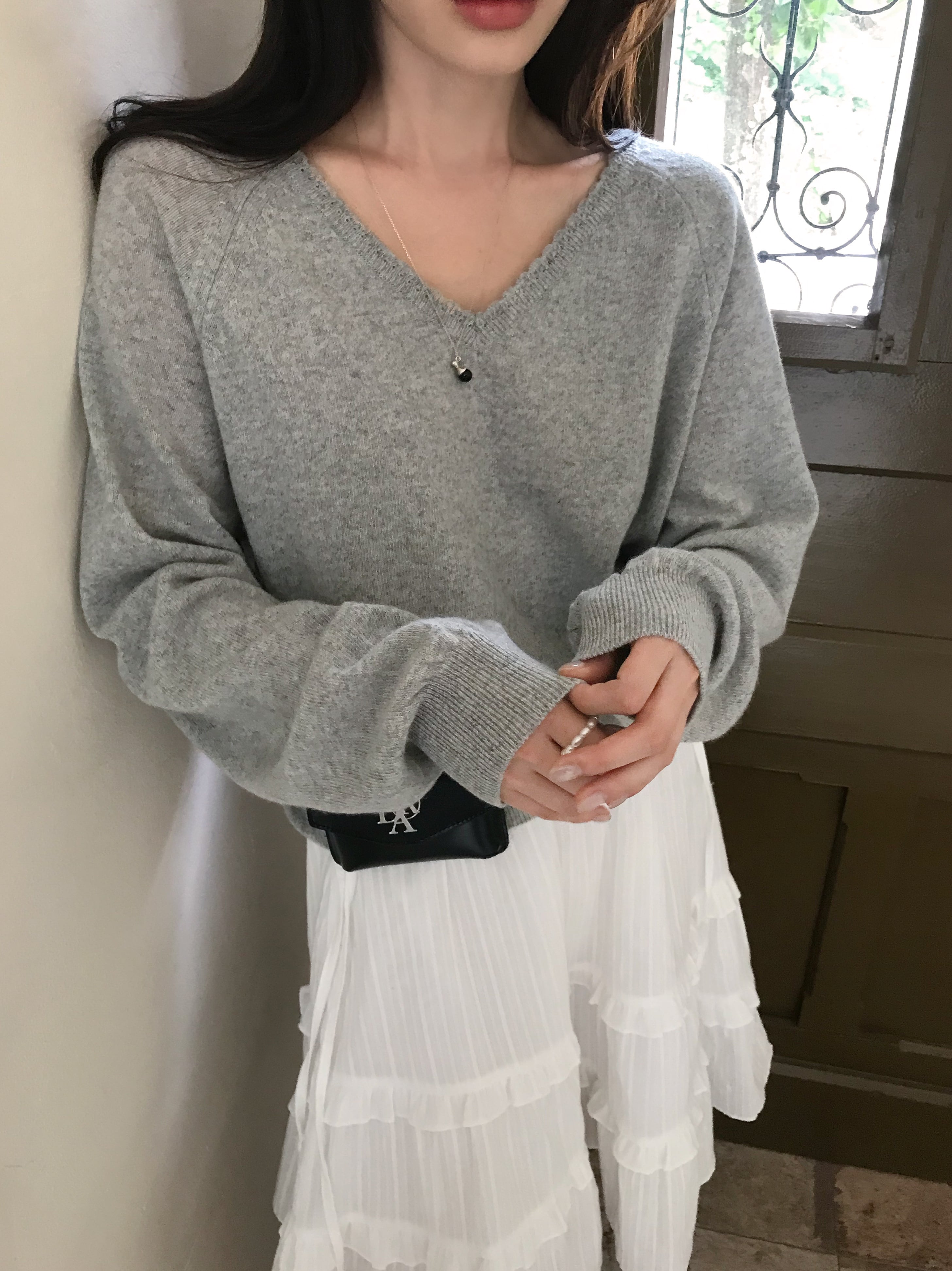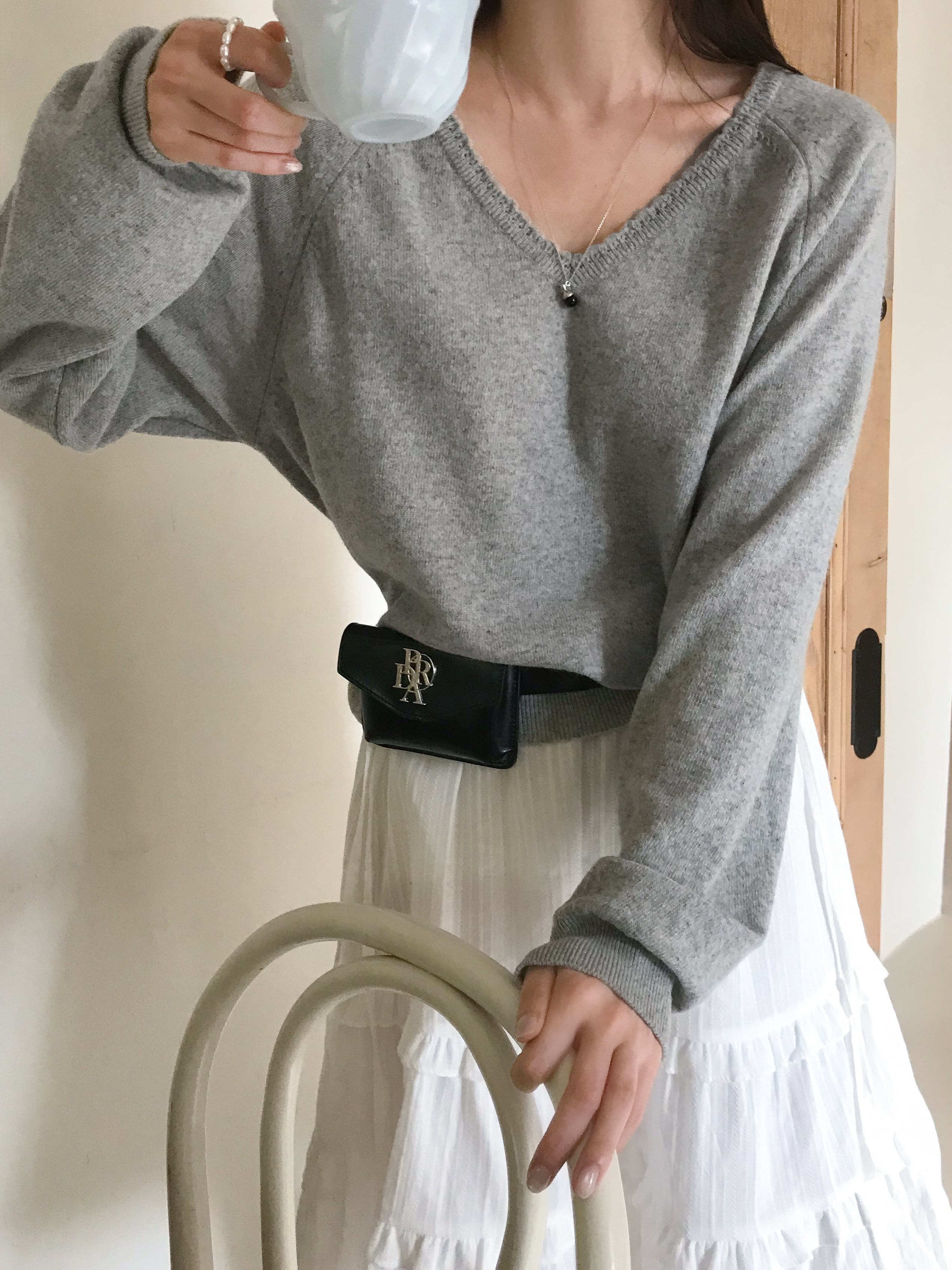 首元をすっきり見せてくれるシンプルなVラインに、ほんのり余裕をもたせたシルエットで大人の抜け感を演出します。