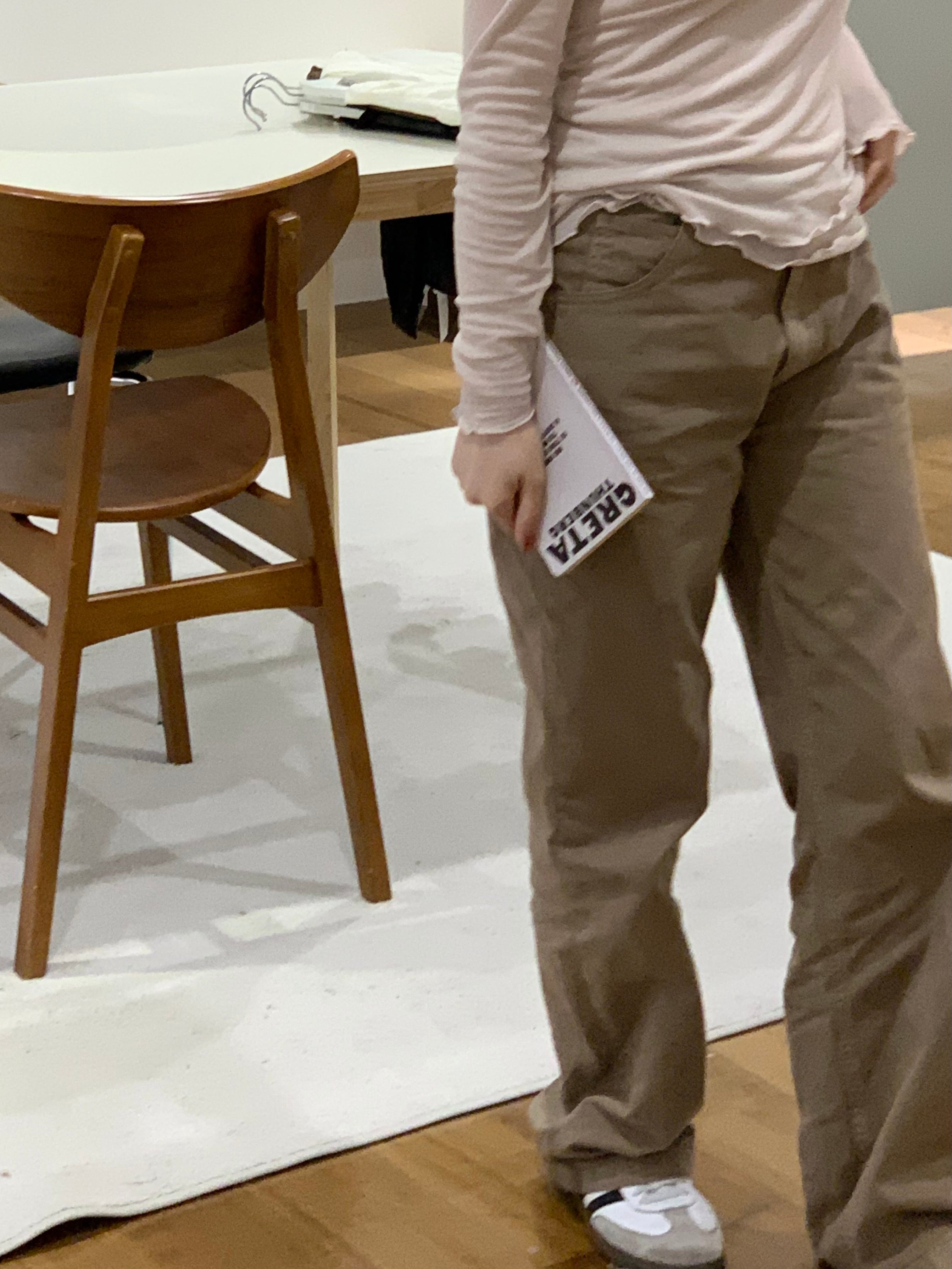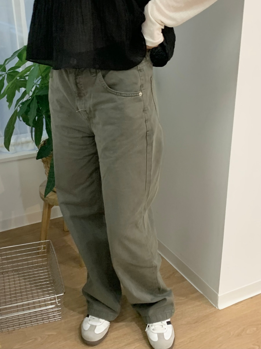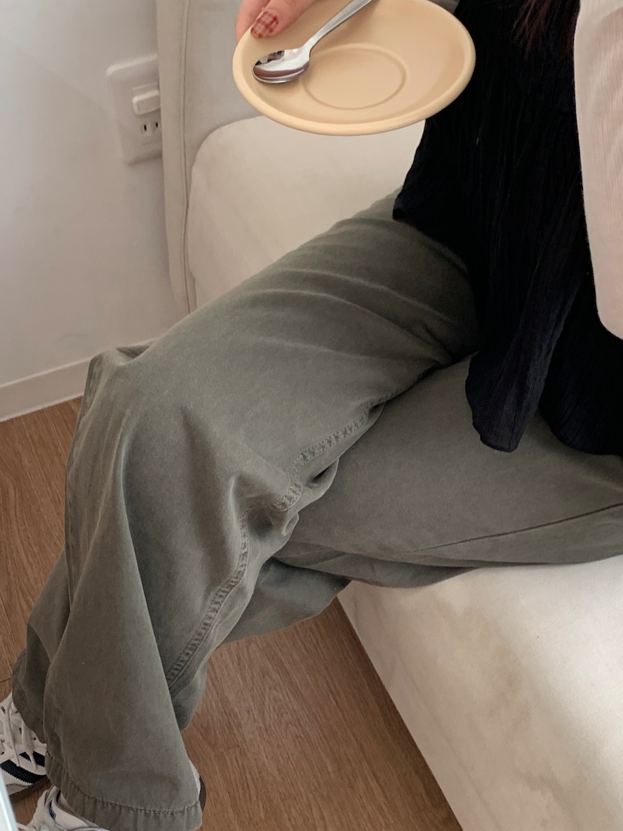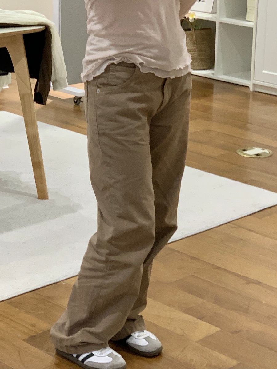 カラーは落ち着いたカーキとベージュでカジュアルにもきれいめにもマッチし、1本あると着回しの幅が広がるアイテムです。