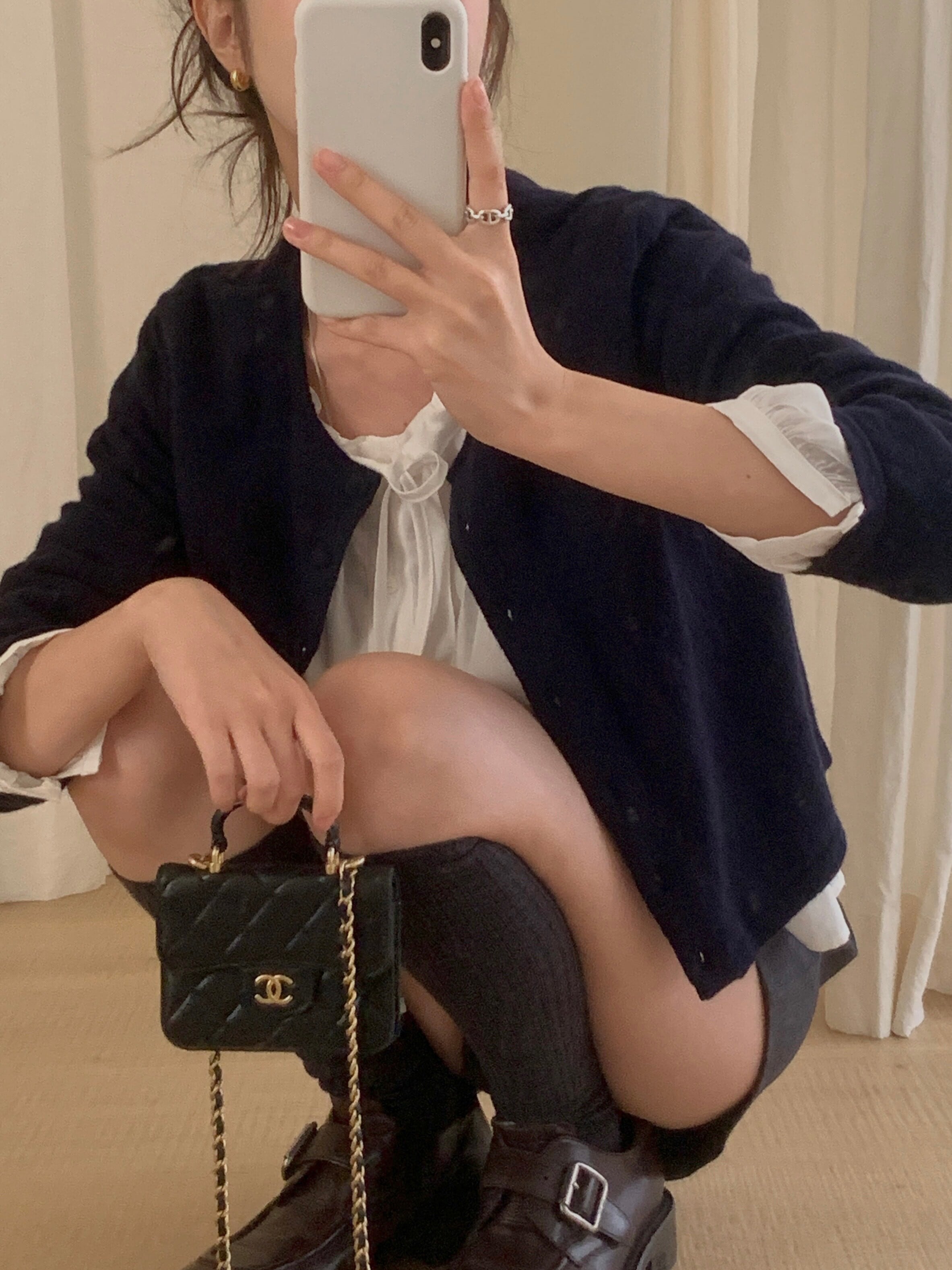 フロントのくるみボタンとチャームが、さりげないアクセントに。