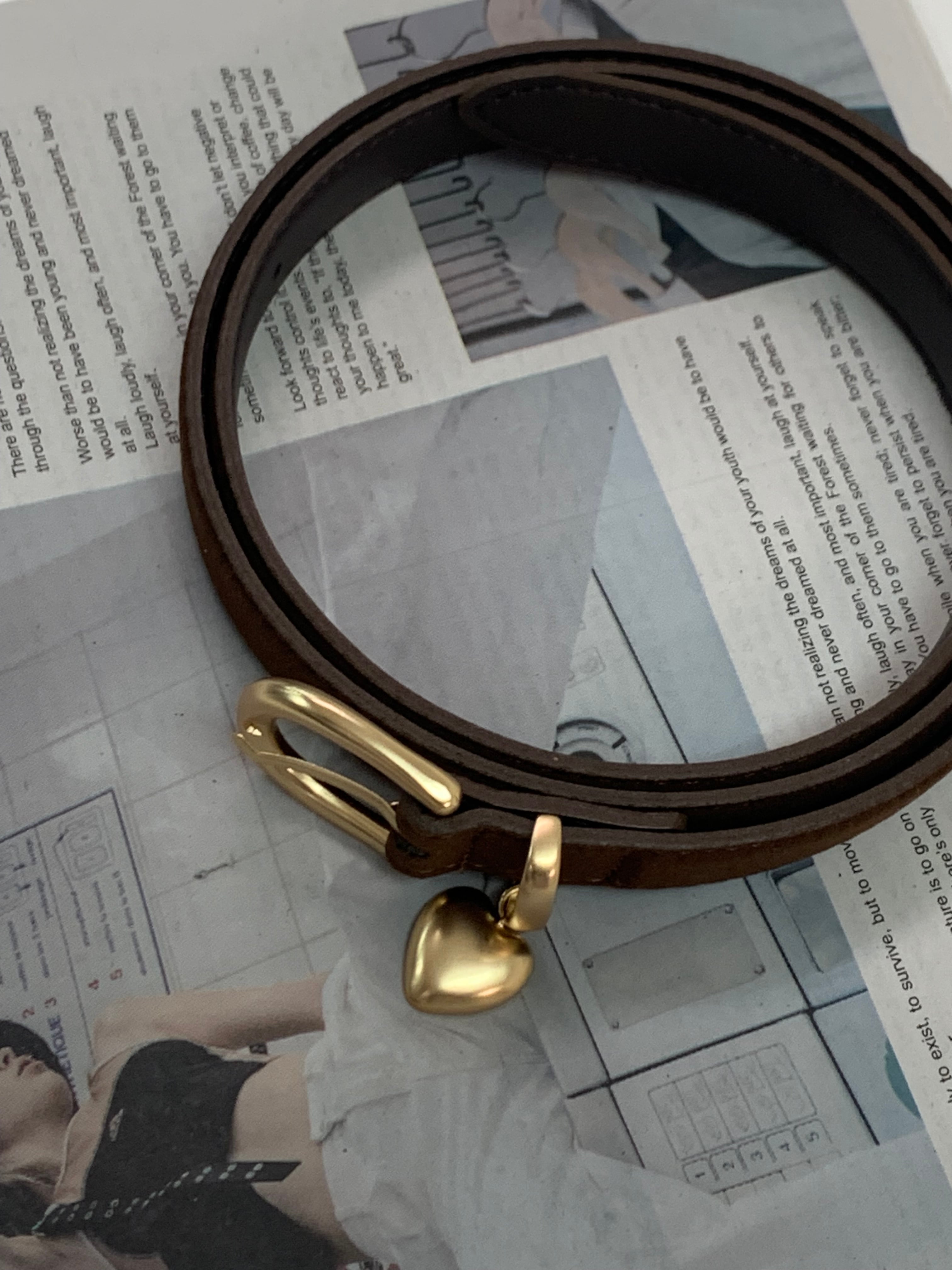 ぷっくりと立体感のあるツヤのあるマットゴールドハートチャームが魅力的なスエードベルト。