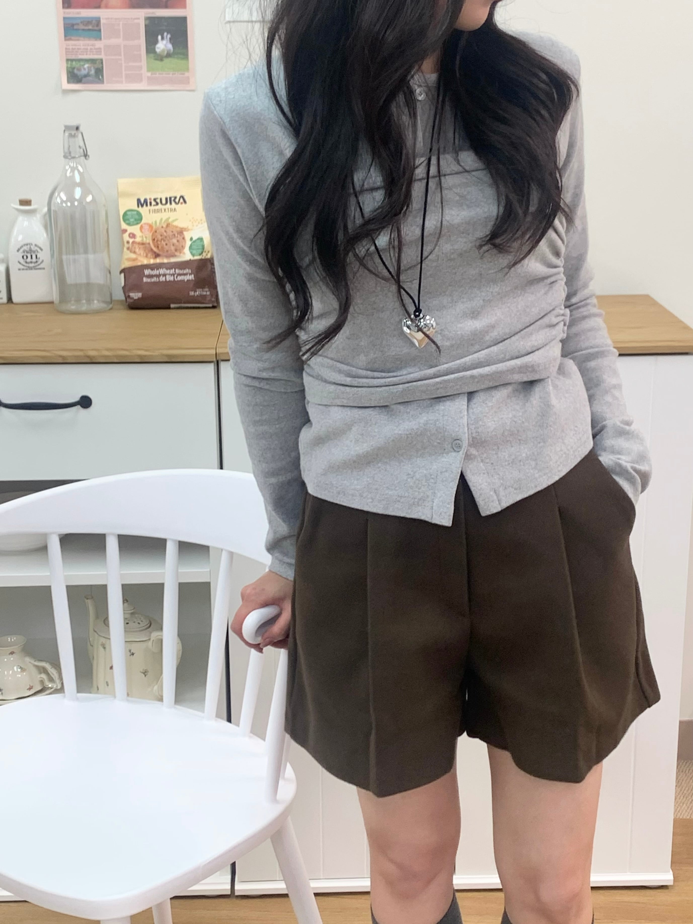 サイドギャザーが細見え効果を引き出し、上半身をスッキリまとめてくれます。