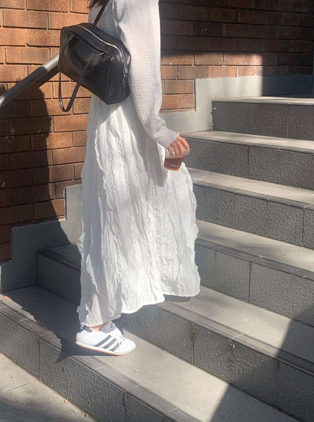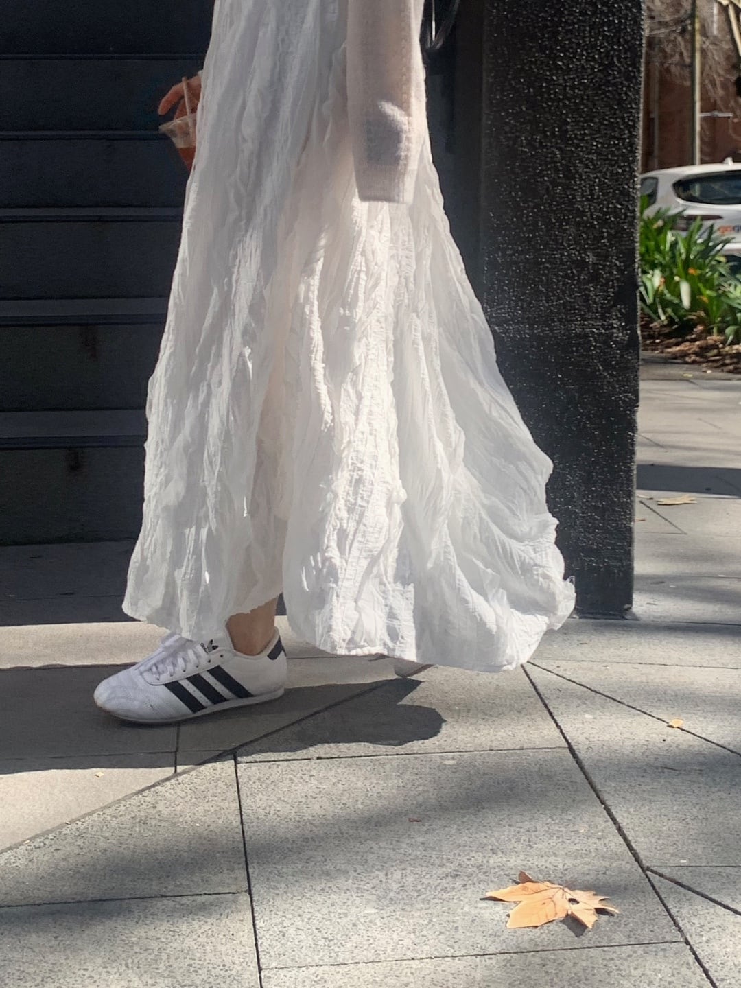 ヒップと骨盤ラインを拾いにくいデザインで、ラッフルの分量を絶妙に調整することで、裾に向かって自然に広がる美しいシルエットを実現。