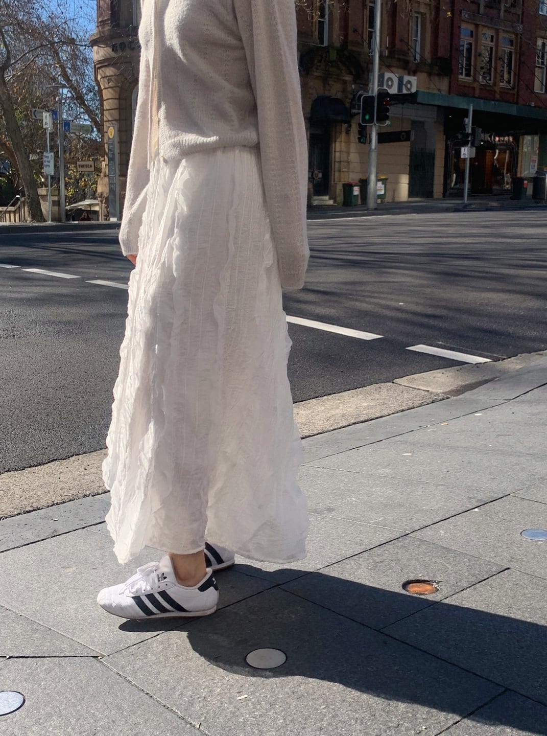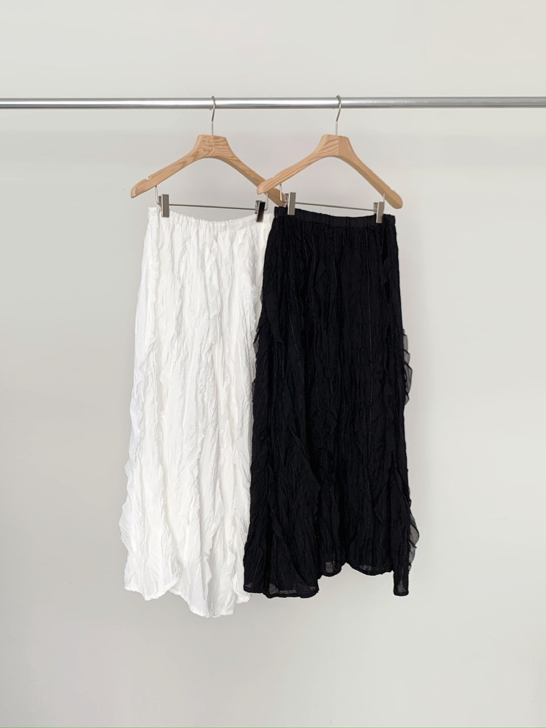 ほのかにカーリングしたラッフルディテールが女性らしいジゼルラッフルスカート。