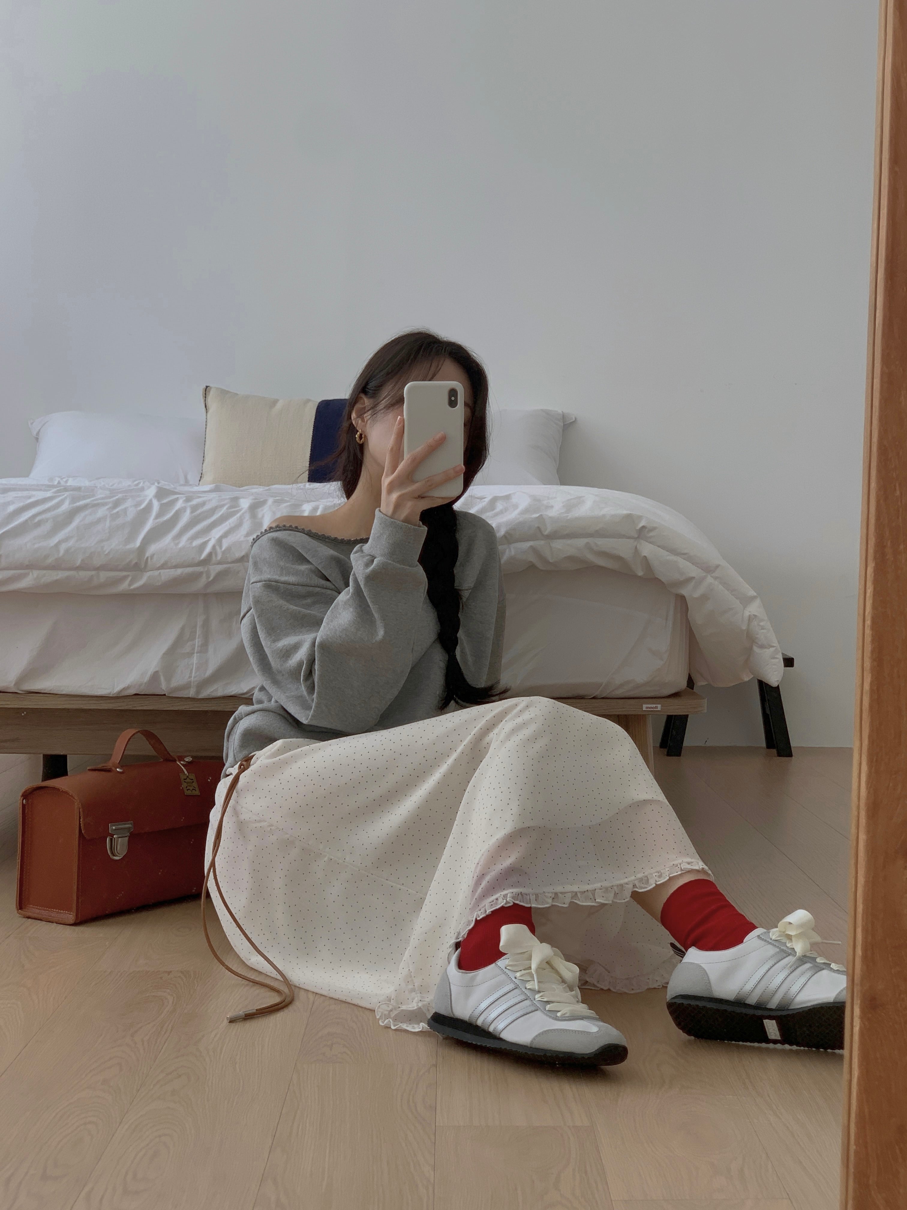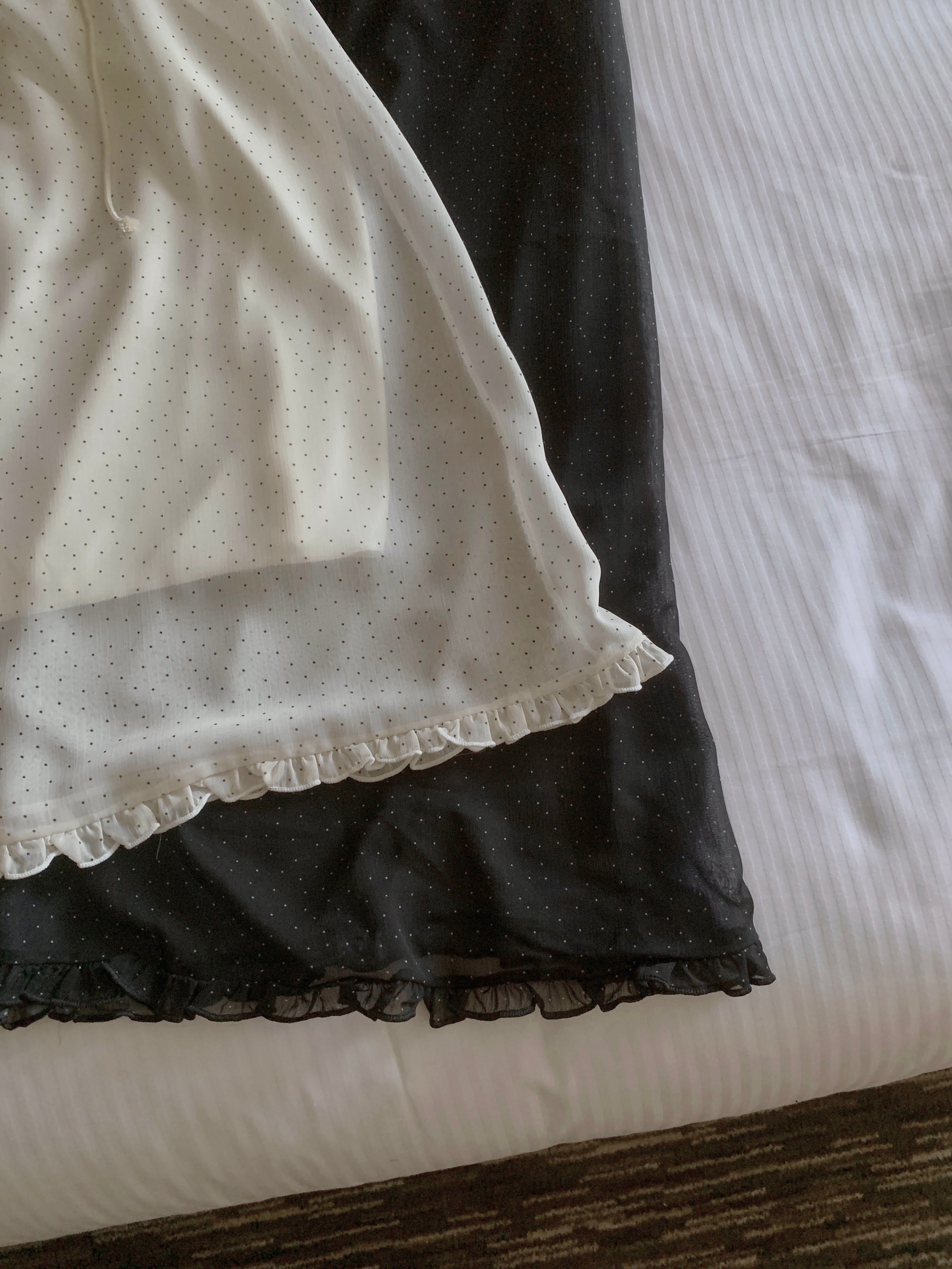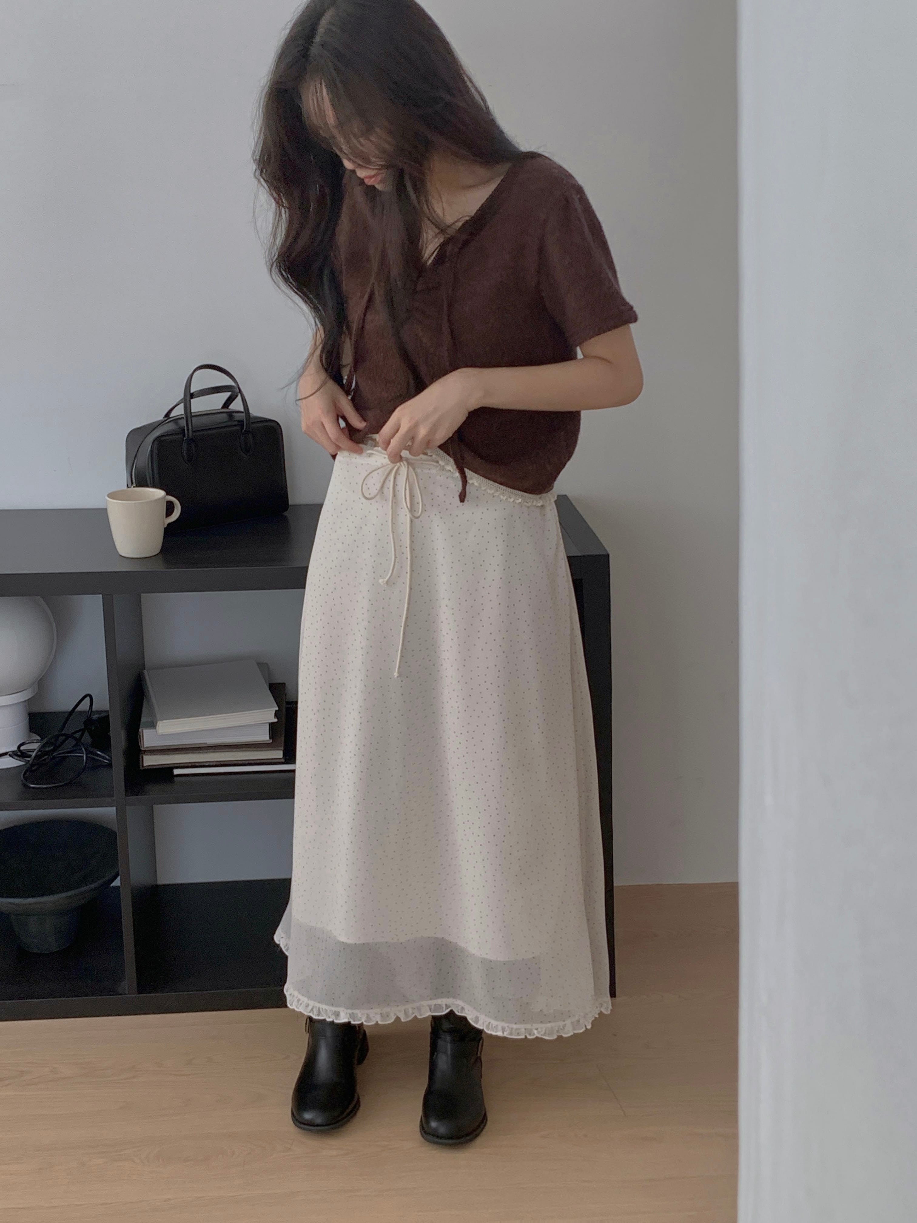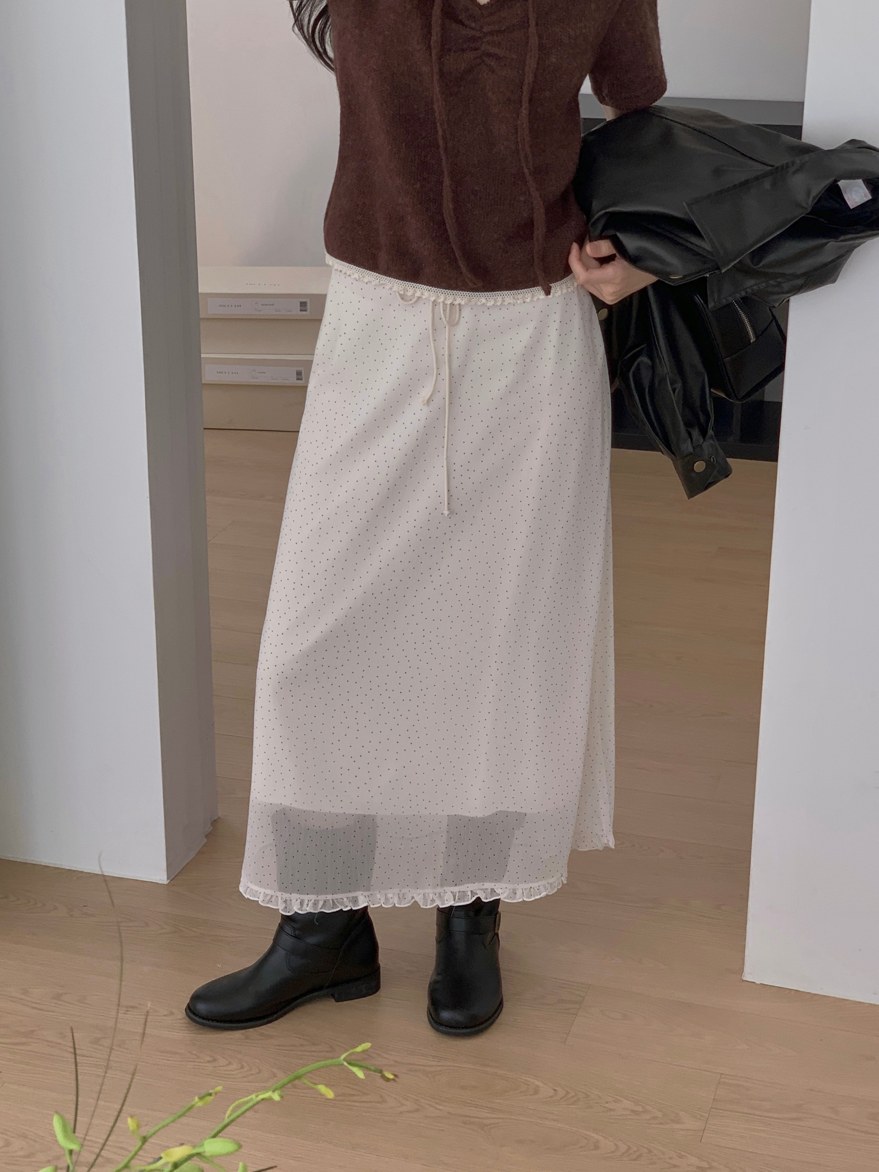 軽やかなシフォン素材に細かいドットを散りばめた、女性らしいロングスカート。