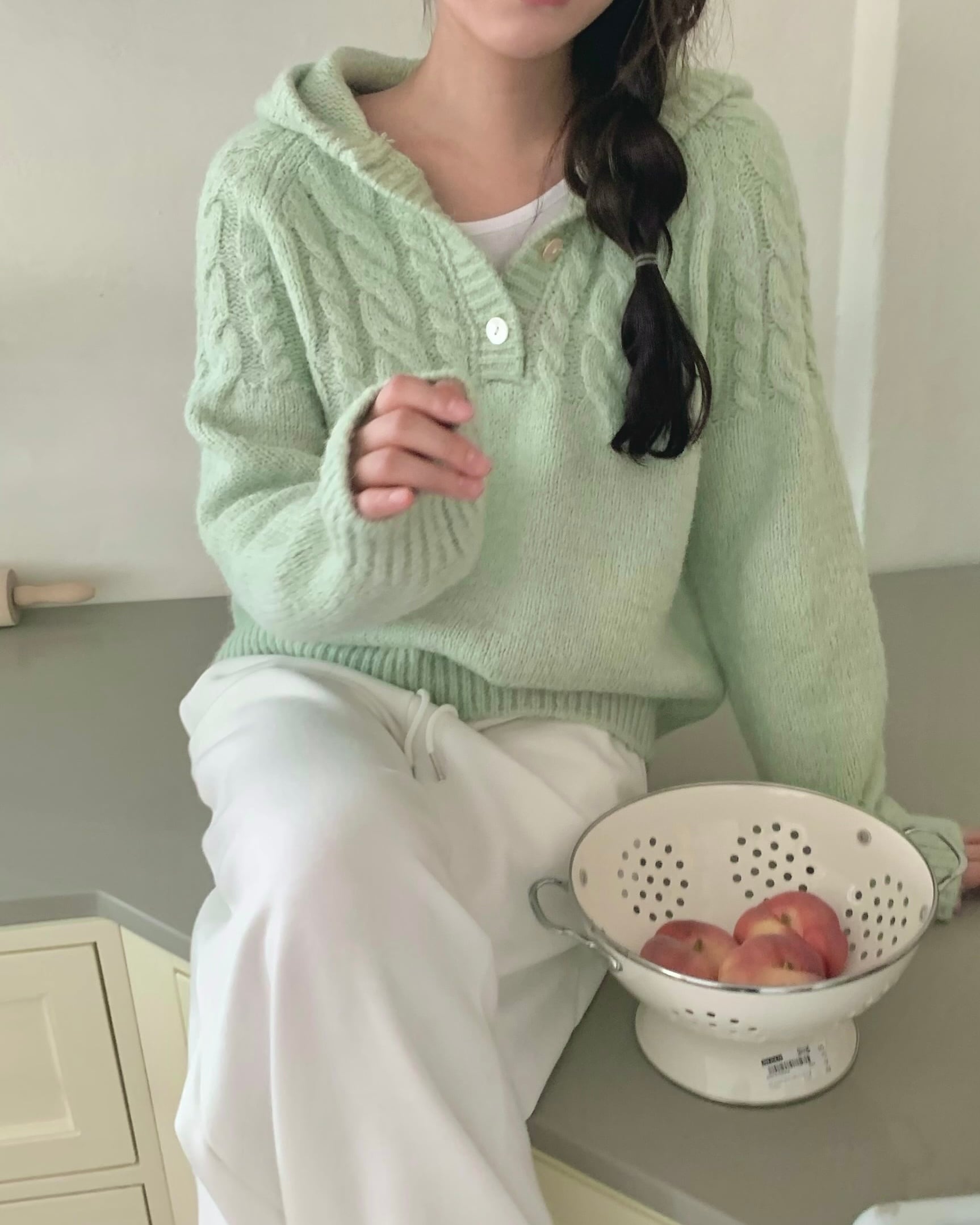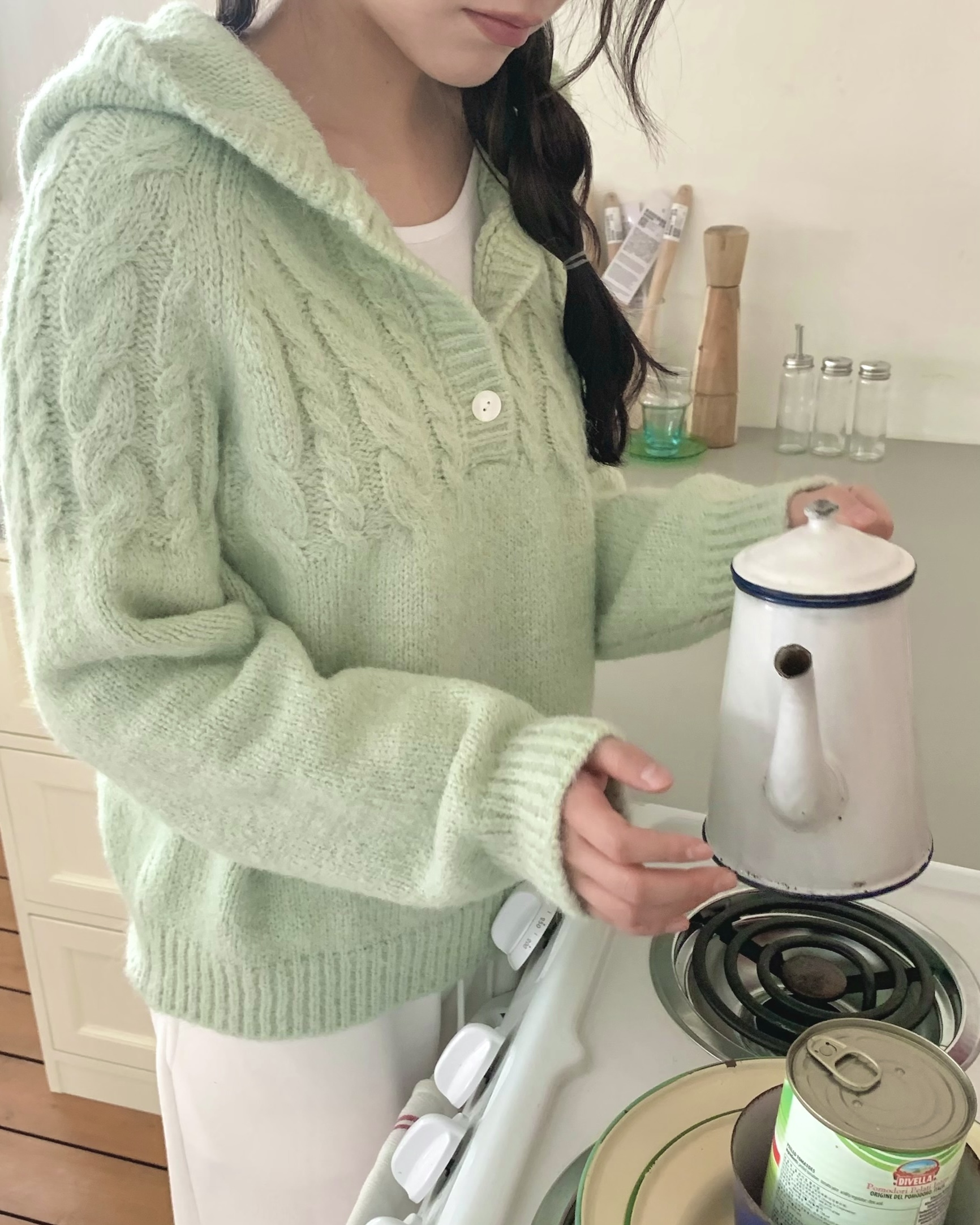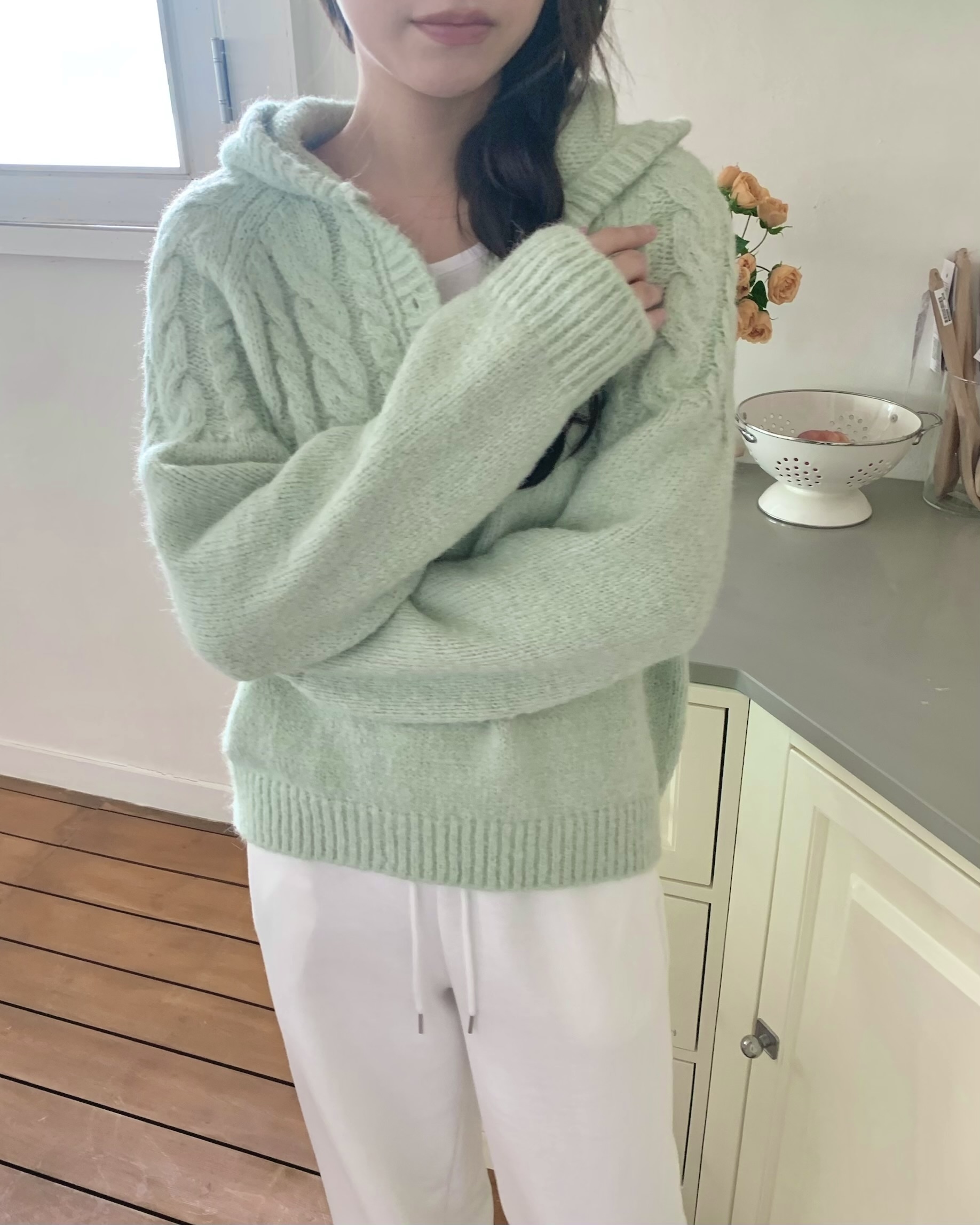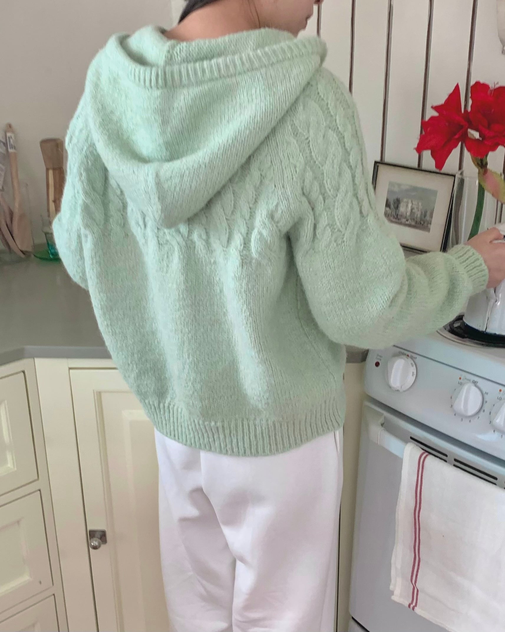 軽やかな着心地の中にも、しっかりとしたぬくもりを感じられる感性をひとさじ加えたフード付きケーブルニット。淡いパステルカラーが顔回りを明るく見せ、全体に施したふんわりとしたテクスチャーが柔らかな印象を演出します。アルパカ混のあたたかな糸で編み立てられ、軽さと保温性を両立した着心地が魅力。さりげないケーブル編みが過度にならず、上品なポイントに。フロントにはシェルボタンをあしらい、清楚で女性らしいムードをプラス。フードディテールでニット特有のクラシックさの中に少しカジュアルで愛らしい雰囲気を感じられます。程よくゆとりのあるシルエットで、体型カバーにも。軽く羽織るだけでも十分に暖かく、コートのインナーとして、季節の変わり目には一枚でも活躍します。