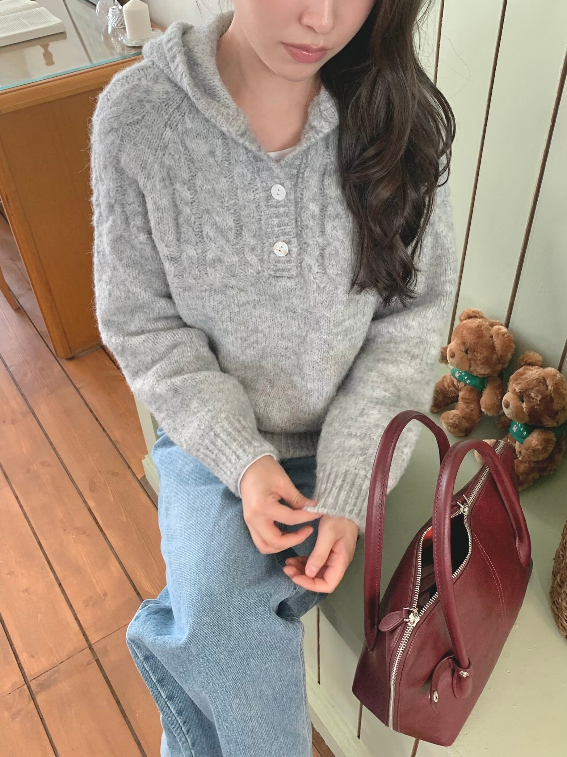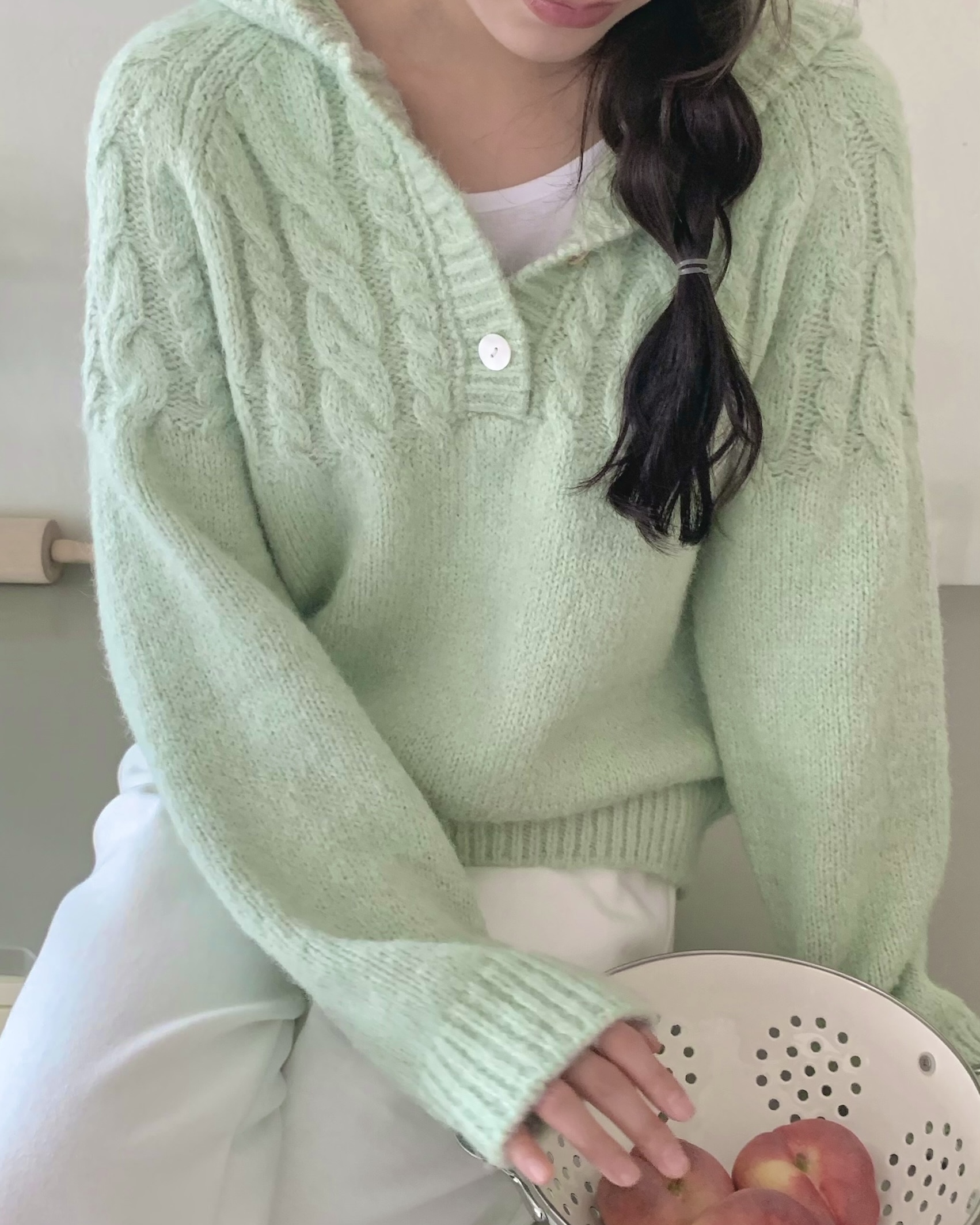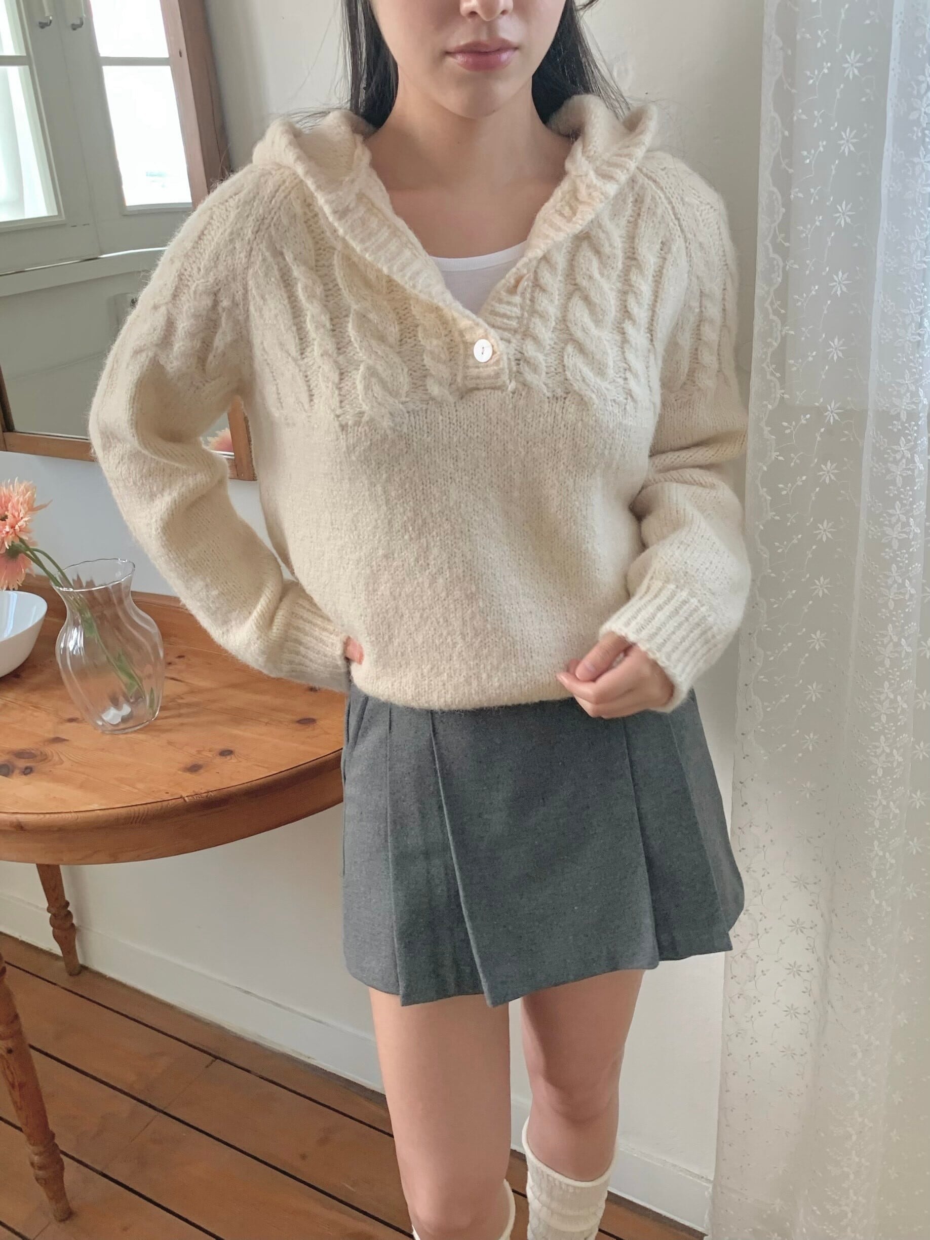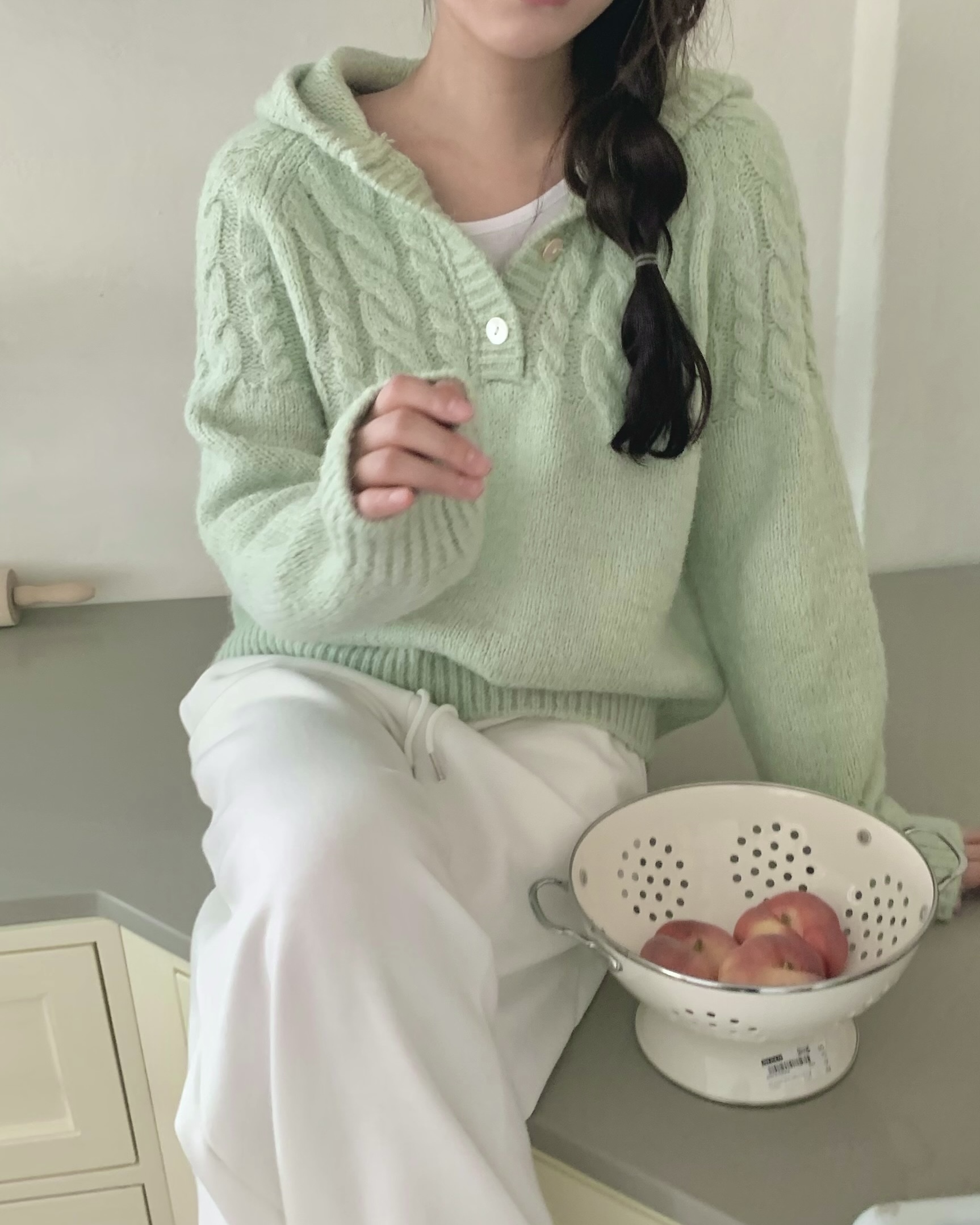 軽やかな着心地の中にも、しっかりとしたぬくもりを感じられる感性をひとさじ加えたフード付きケーブルニット。淡いパステルカラーが顔回りを明るく見せ、全体に施したふんわりとしたテクスチャーが柔らかな印象を演出します。アルパカ混のあたたかな糸で編み立てられ、軽さと保温性を両立した着心地が魅力。さりげないケーブル編みが過度にならず、上品なポイントに。フロントにはシェルボタンをあしらい、清楚で女性らしいムードをプラス。フードディテールでニット特有のクラシックさの中に少しカジュアルで愛らしい雰囲気を感じられます。程よくゆとりのあるシルエットで、体型カバーにも。軽く羽織るだけでも十分に暖かく、コートのインナーとして、季節の変わり目には一枚でも活躍します。