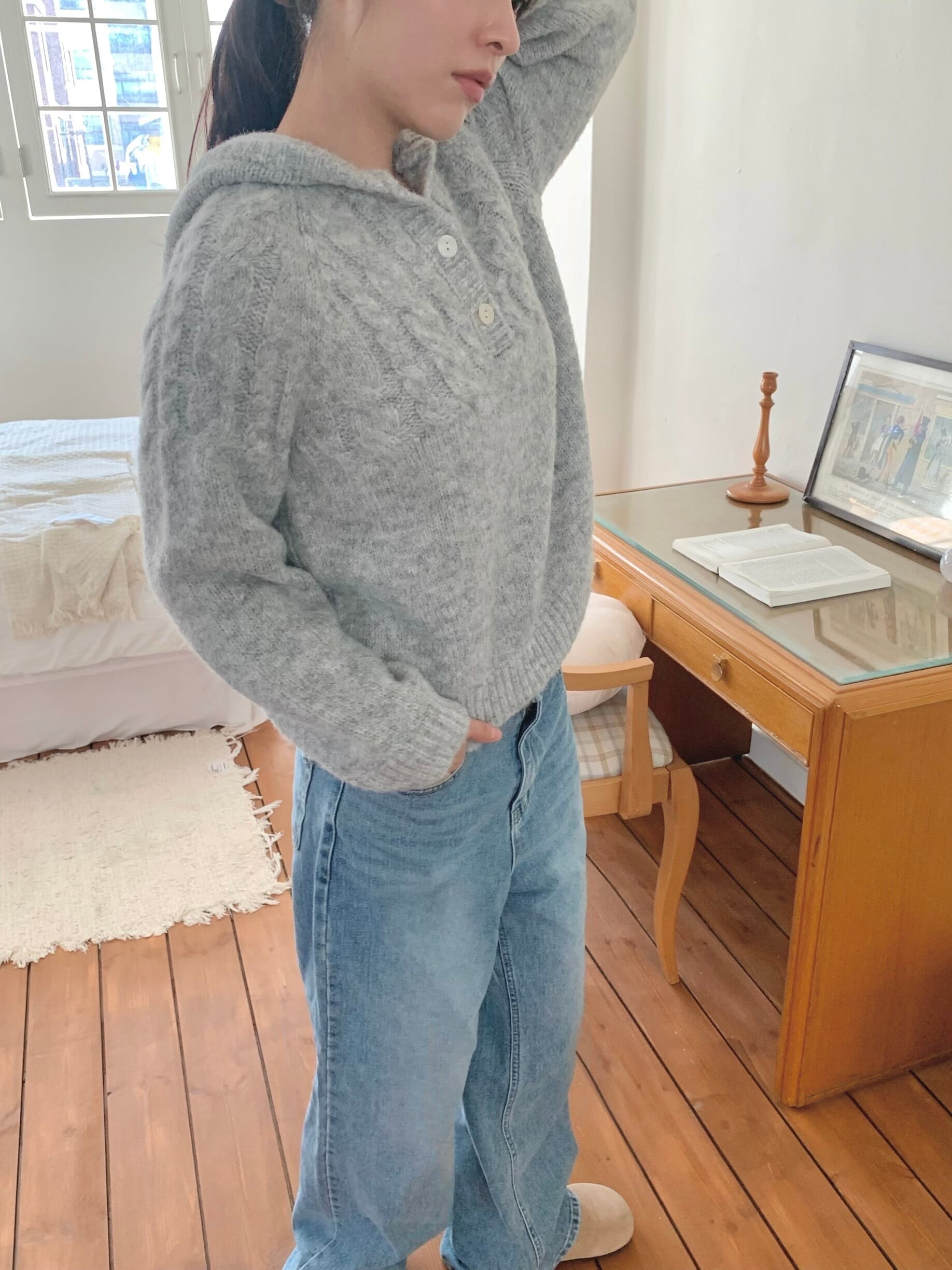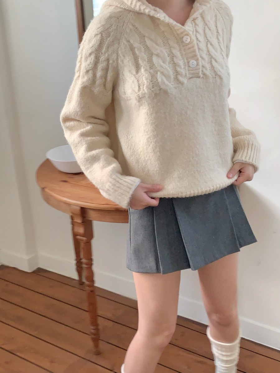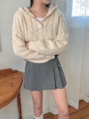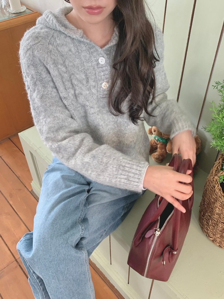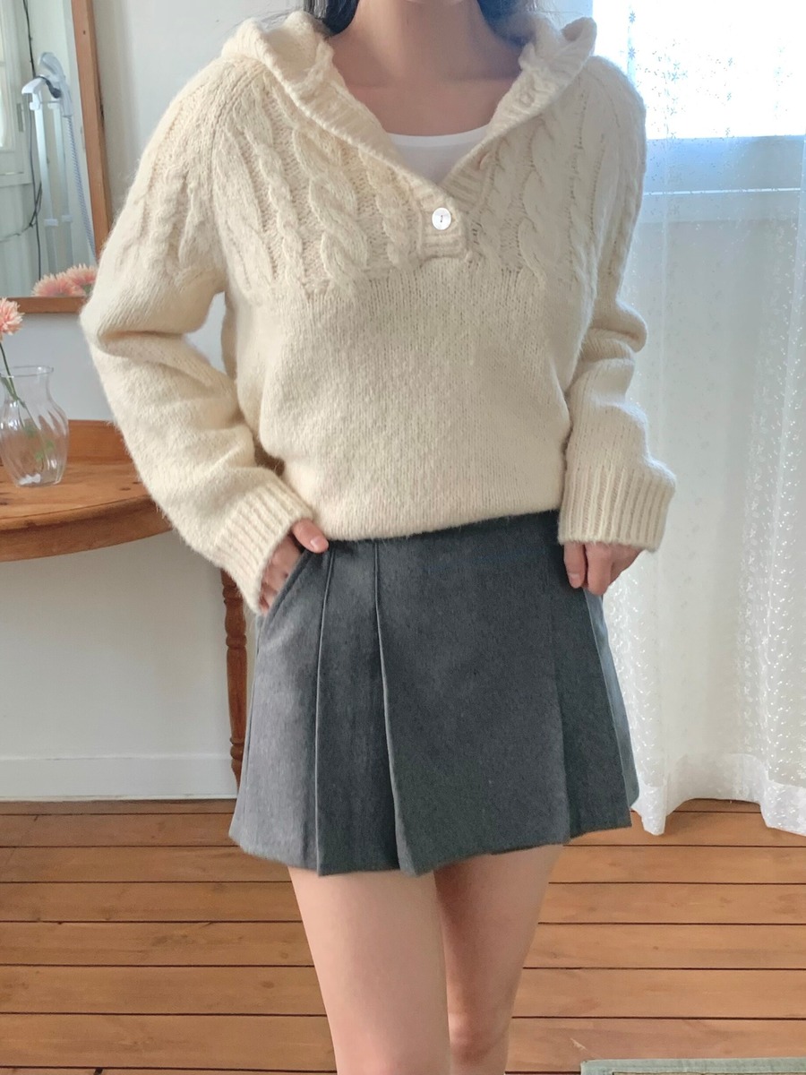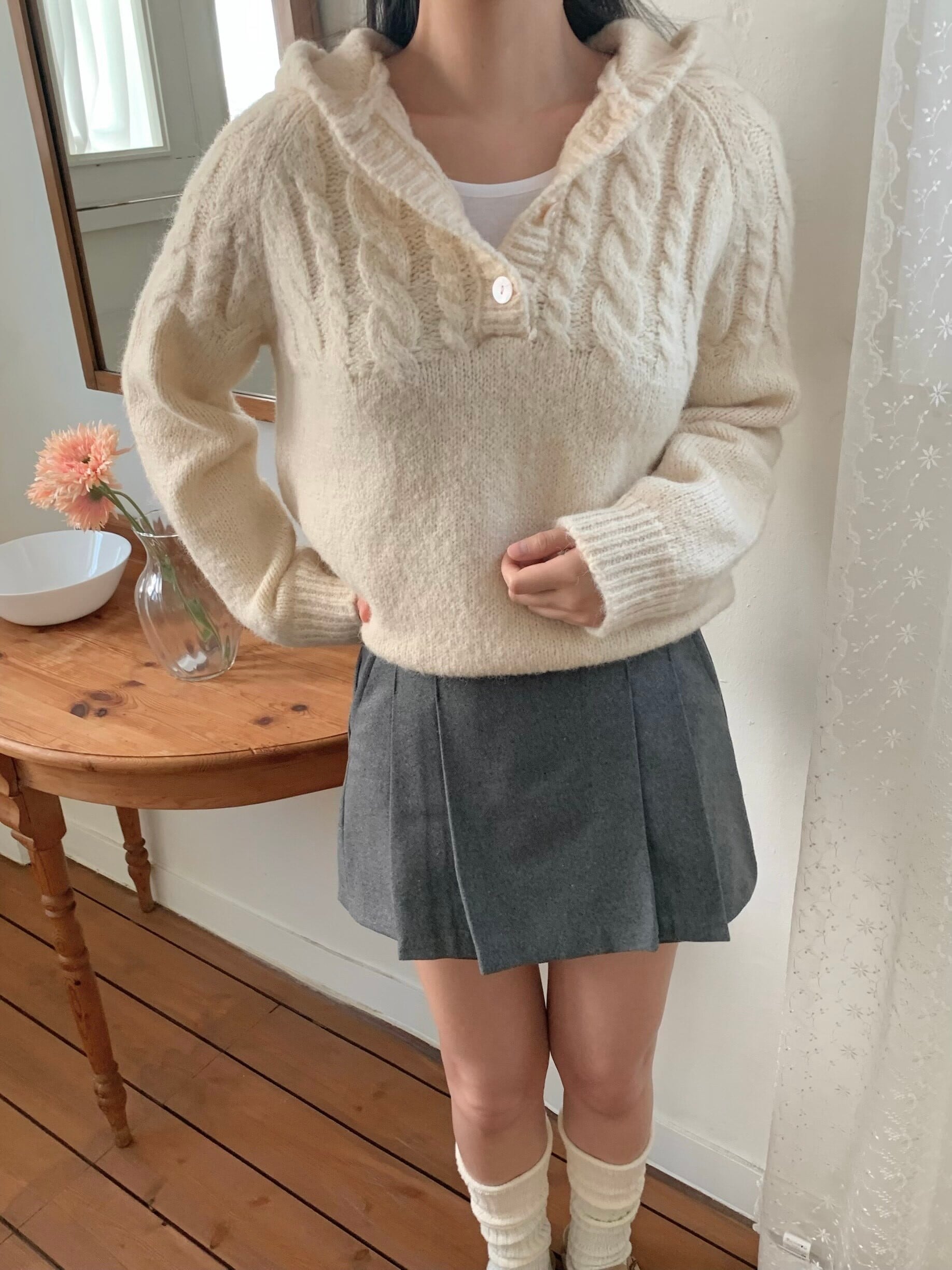 軽やかな着心地の中にも、しっかりとしたぬくもりを感じられる感性をひとさじ加えたフード付きケーブルニット。淡いパステルカラーが顔回りを明るく見せ、全体に施したふんわりとしたテクスチャーが柔らかな印象を演出します。アルパカ混のあたたかな糸で編み立てられ、軽さと保温性を両立した着心地が魅力。さりげないケーブル編みが過度にならず、上品なポイントに。フロントにはシェルボタンをあしらい、清楚で女性らしいムードをプラス。フードディテールでニット特有のクラシックさの中に少しカジュアルで愛らしい雰囲気を感じられます。程よくゆとりのあるシルエットで、体型カバーにも。軽く羽織るだけでも十分に暖かく、コートのインナーとして、季節の変わり目には一枚でも活躍します。