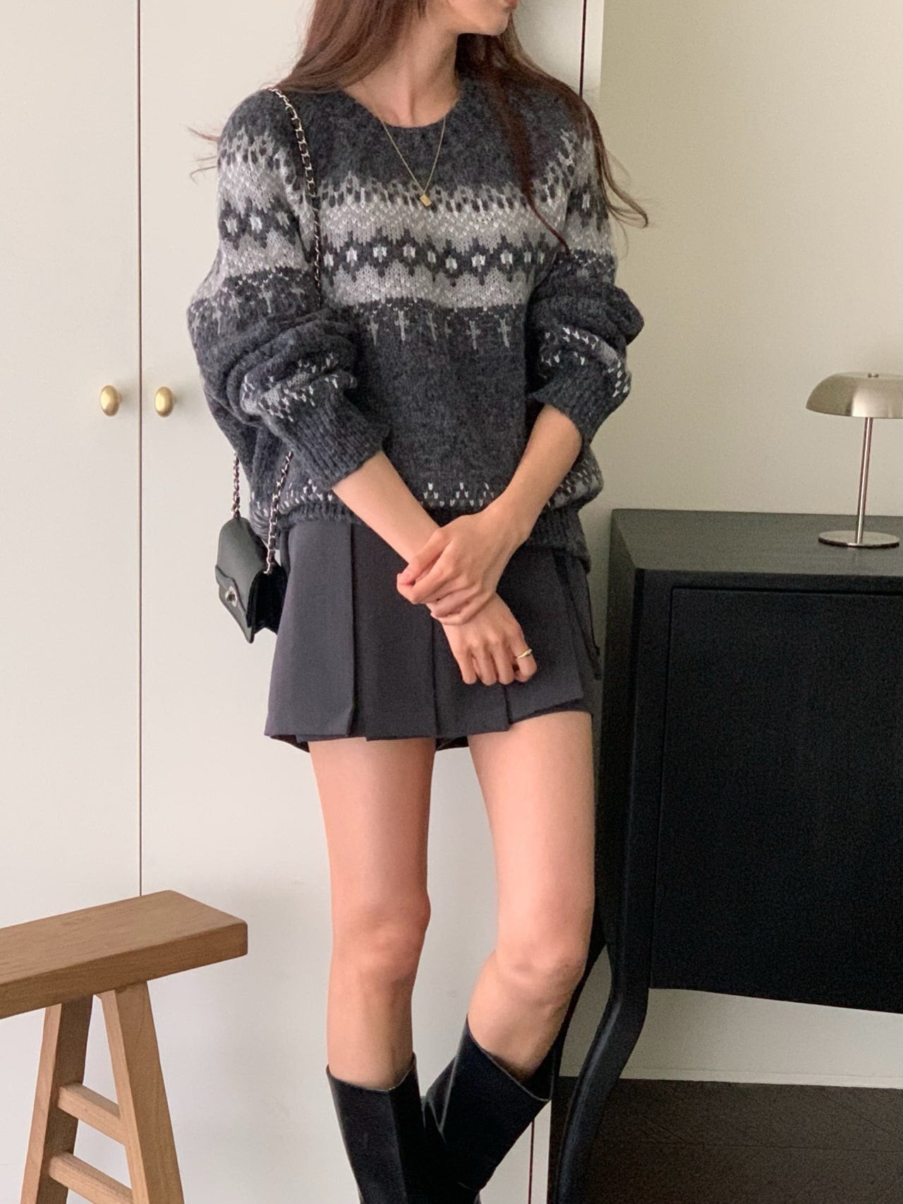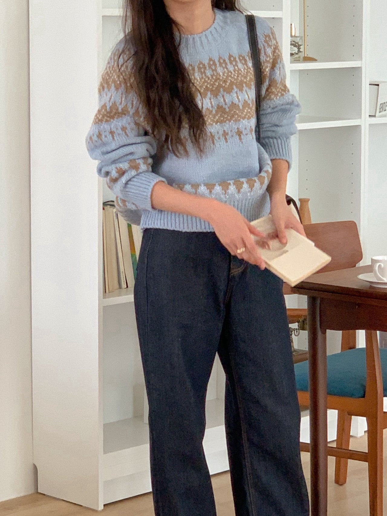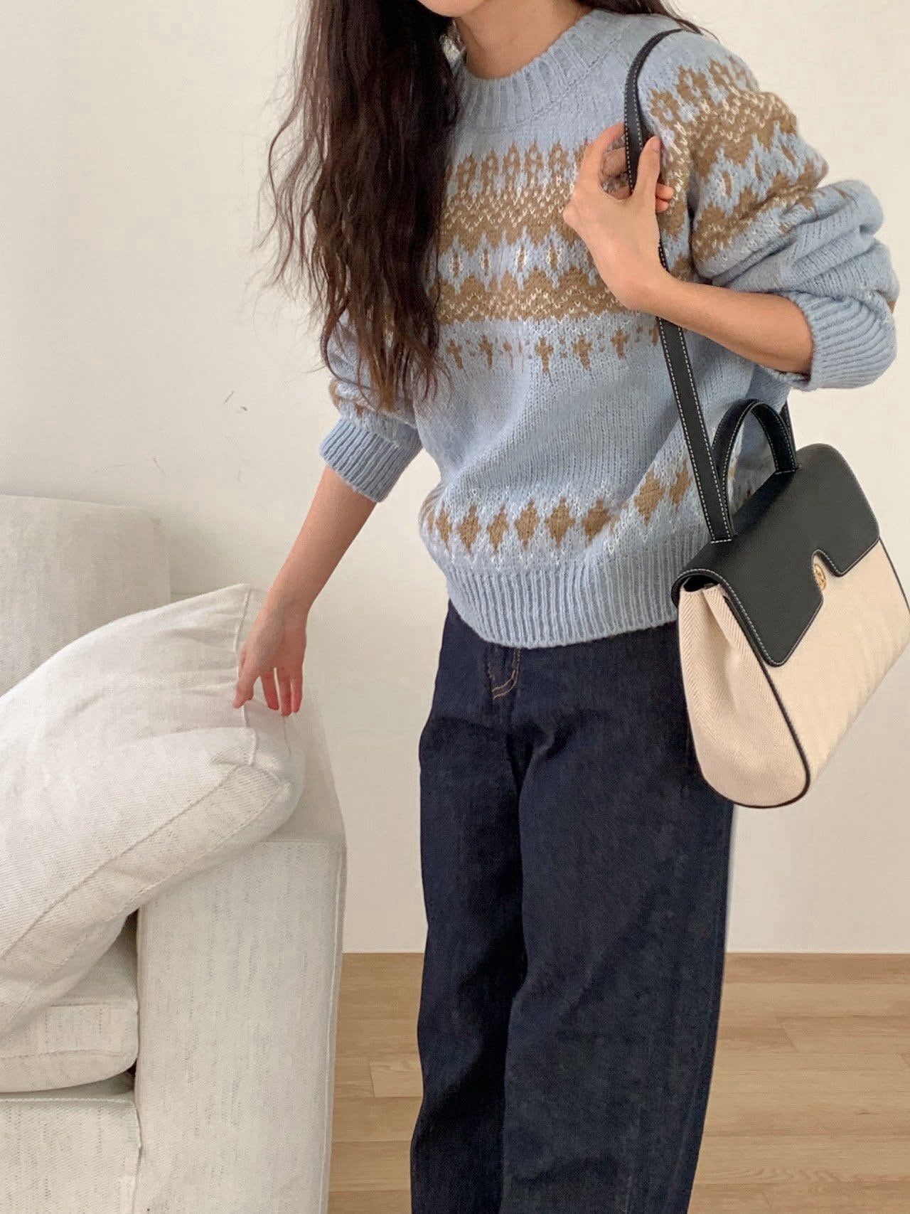 冬にぴったりのノルディック柄のニット。魅力的な配色の可愛さで上品さもあり、1枚で季節感たっぷりのスタイリングが完成します。ほどよいゆるさと首元はすっきりとしたクルーネック使用で、シャツやタートルをレイヤードしてもよくまとまります。カラーは雰囲気の異なるベージュ、スカイブルー、チャコールの3色展開。どのカラーも冬のコーデに馴染みやすく、幅広く活躍してくれるアイテムになっています。