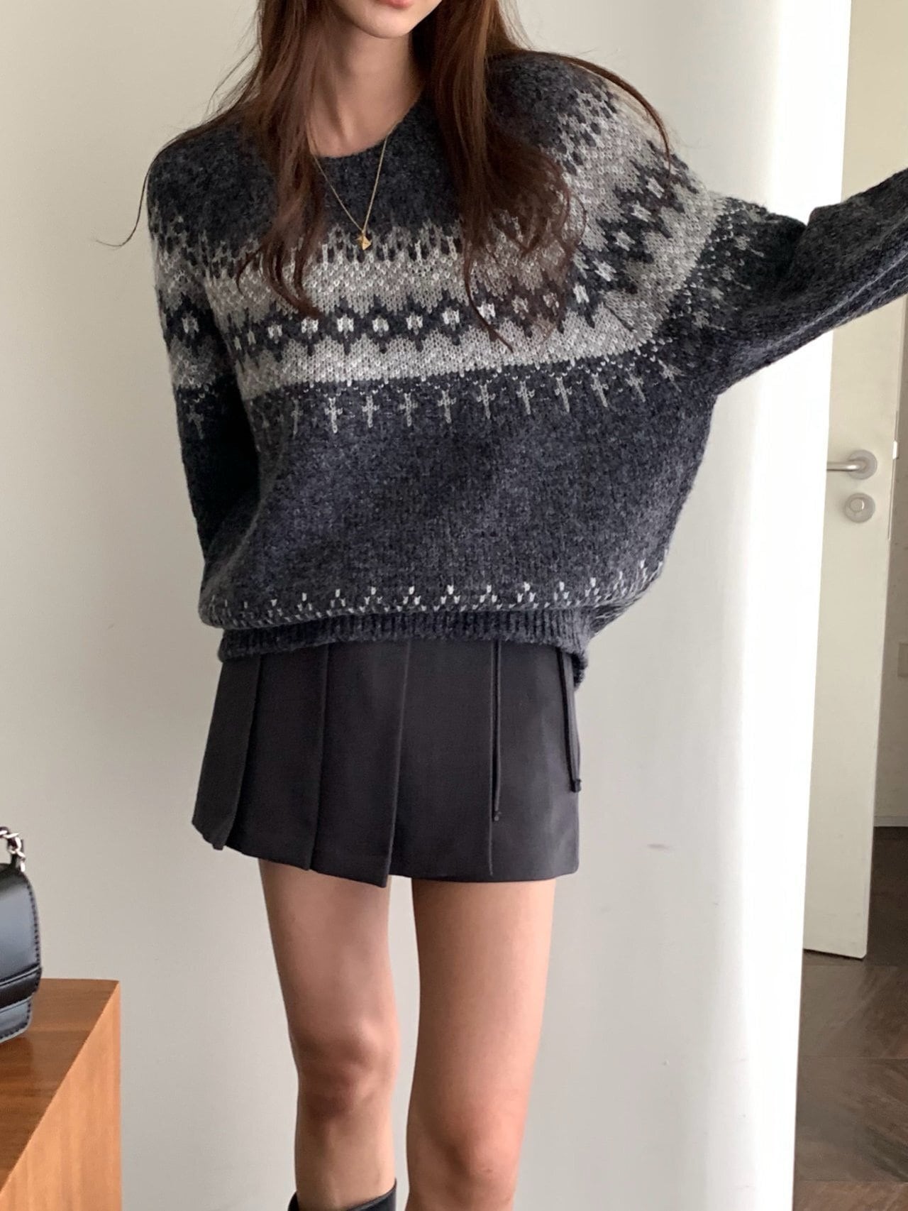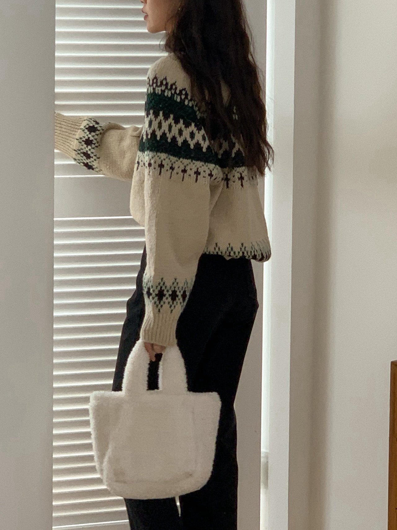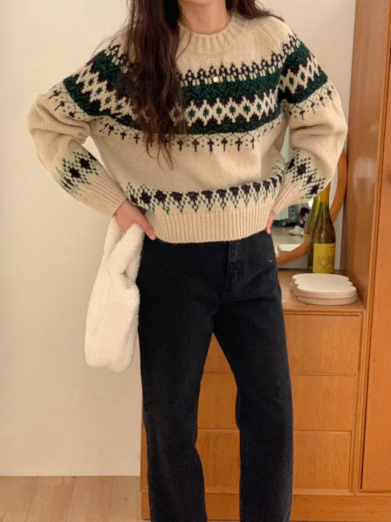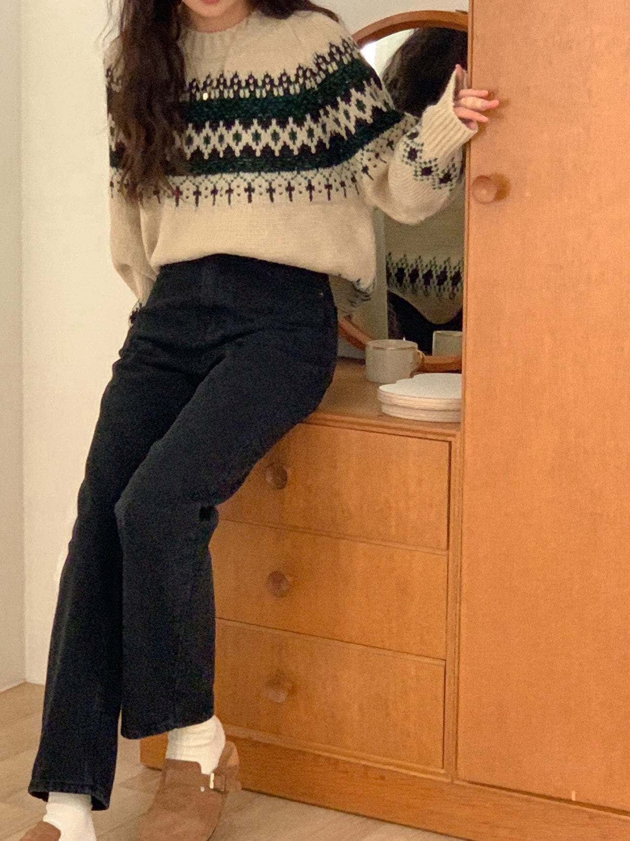 冬にぴったりのノルディック柄のニット。魅力的な配色の可愛さで上品さもあり、1枚で季節感たっぷりのスタイリングが完成します。ほどよいゆるさと首元はすっきりとしたクルーネック使用で、シャツやタートルをレイヤードしてもよくまとまります。カラーは雰囲気の異なるベージュ、スカイブルー、チャコールの3色展開。どのカラーも冬のコーデに馴染みやすく、幅広く活躍してくれるアイテムになっています。