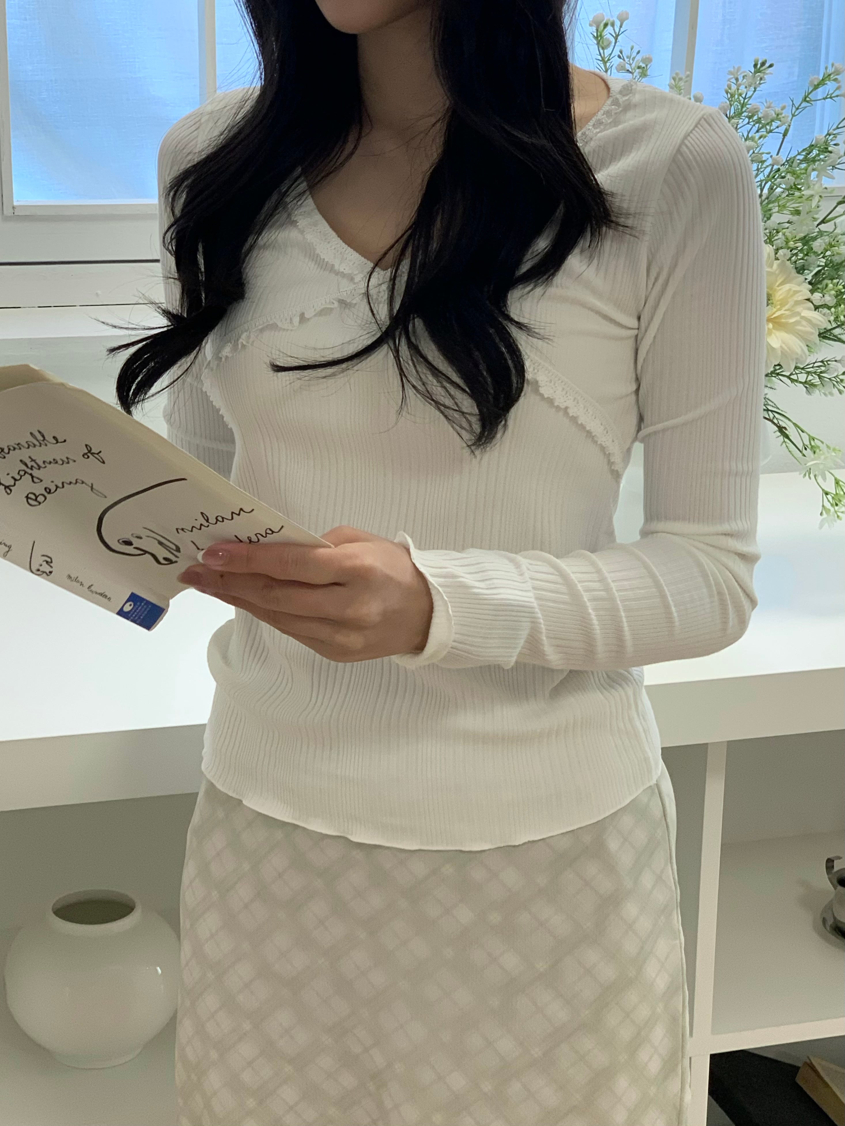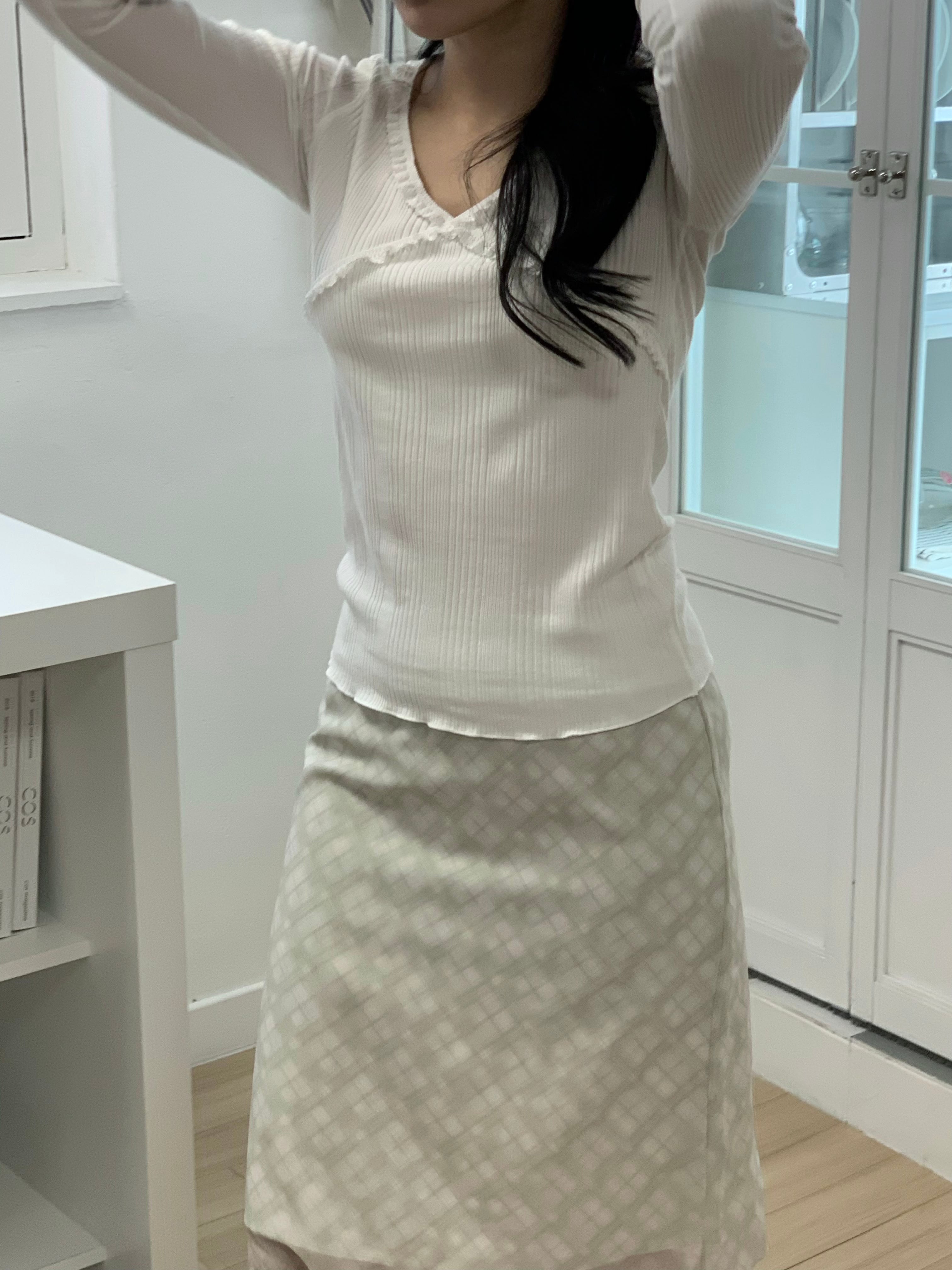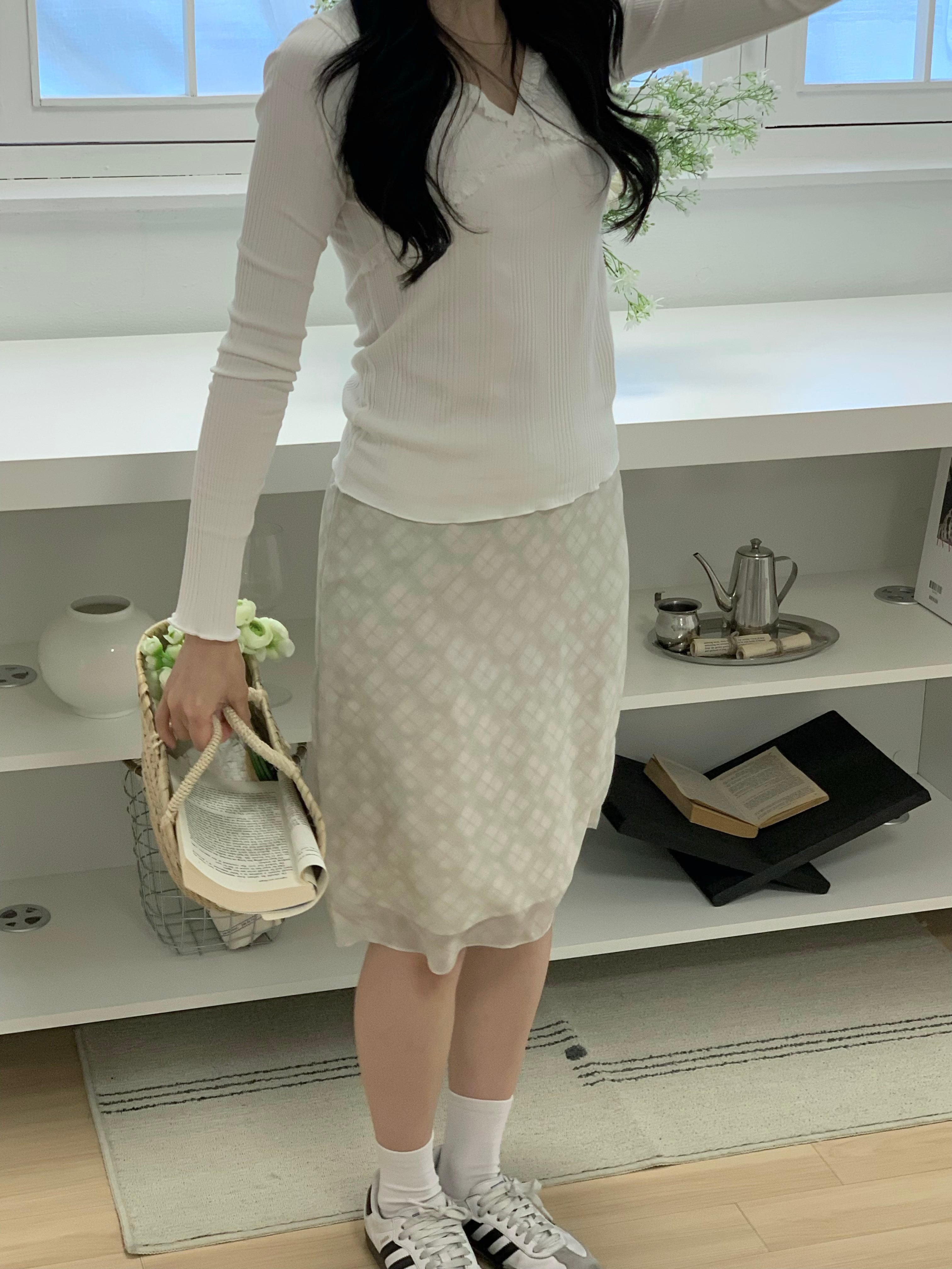 程よくフィットするリブ素材で、体のラインをきれいに見せるシルエットになっています。