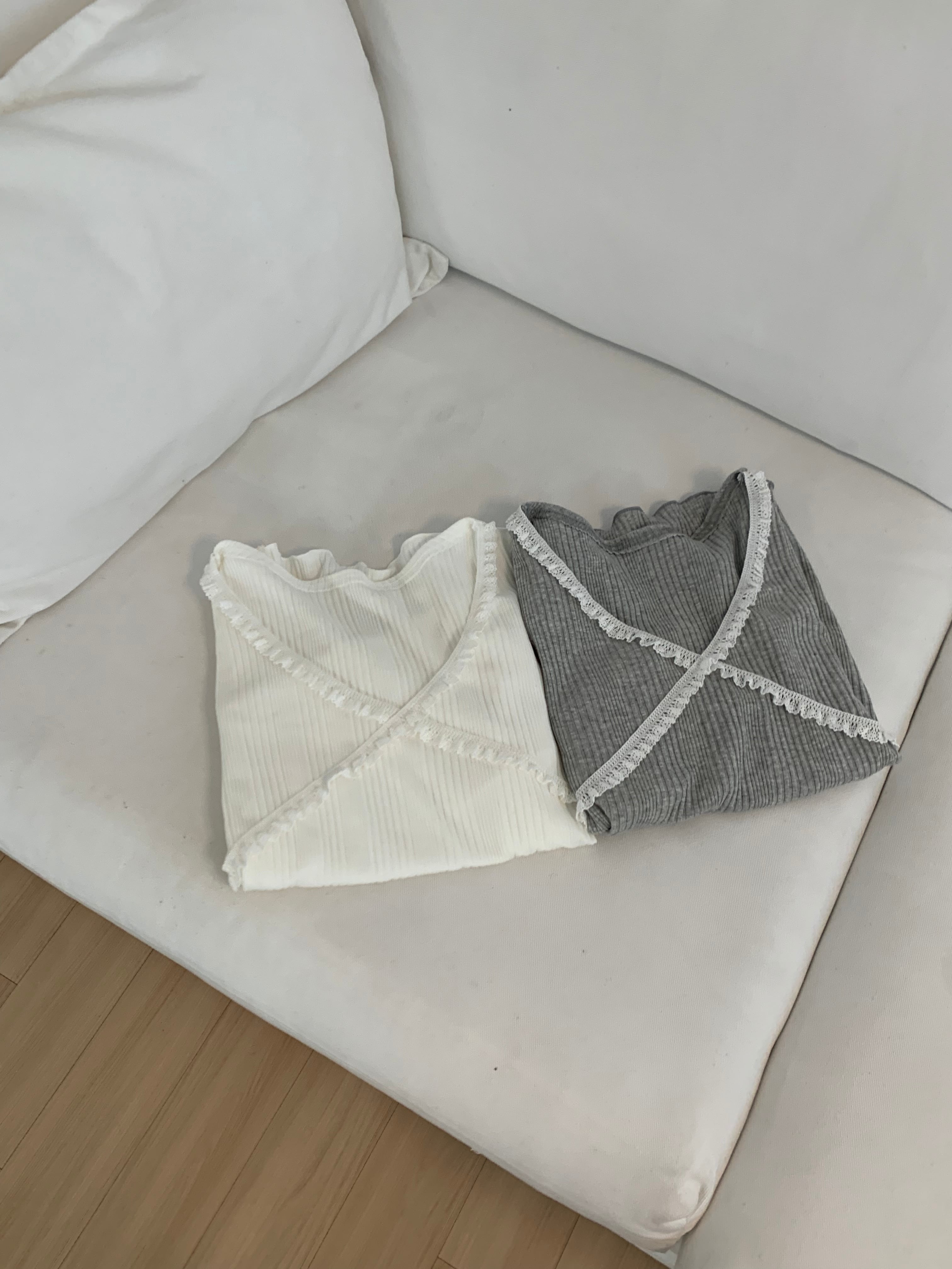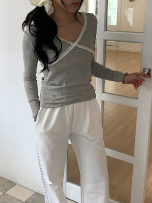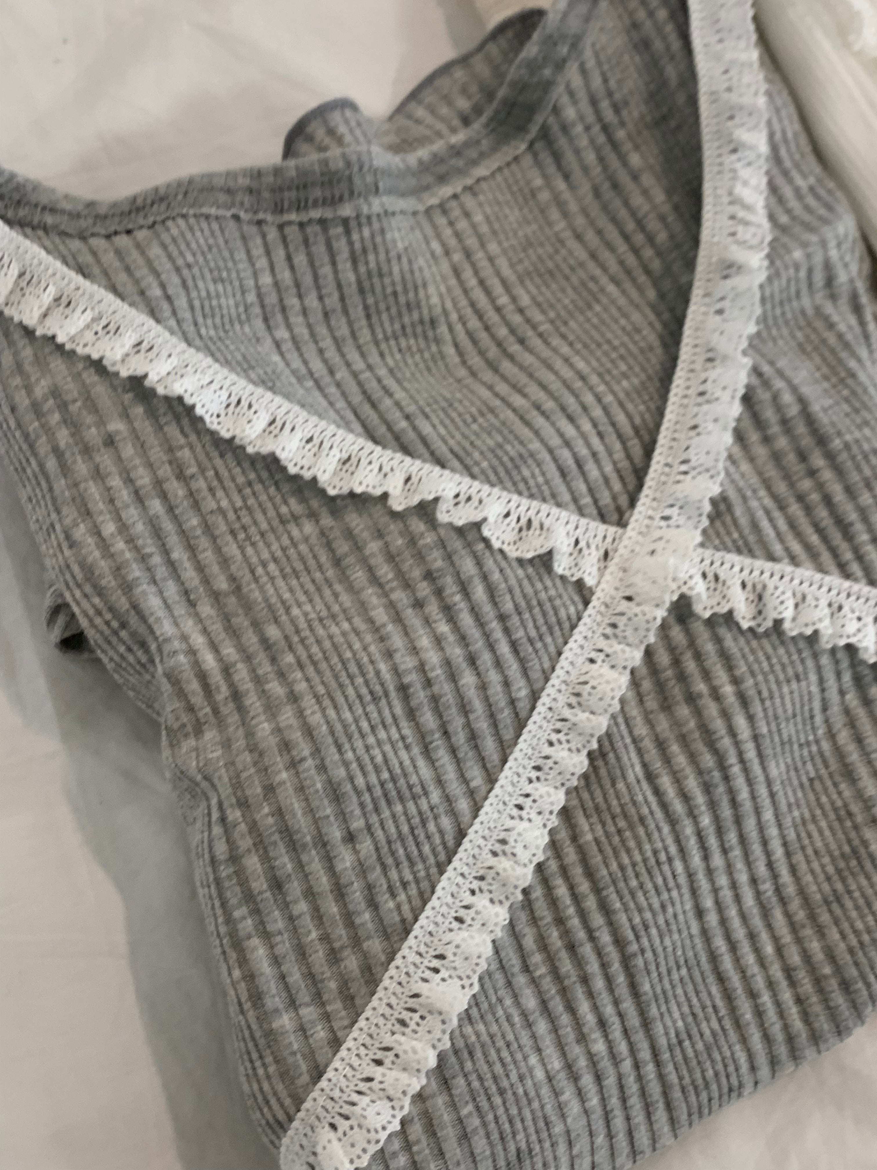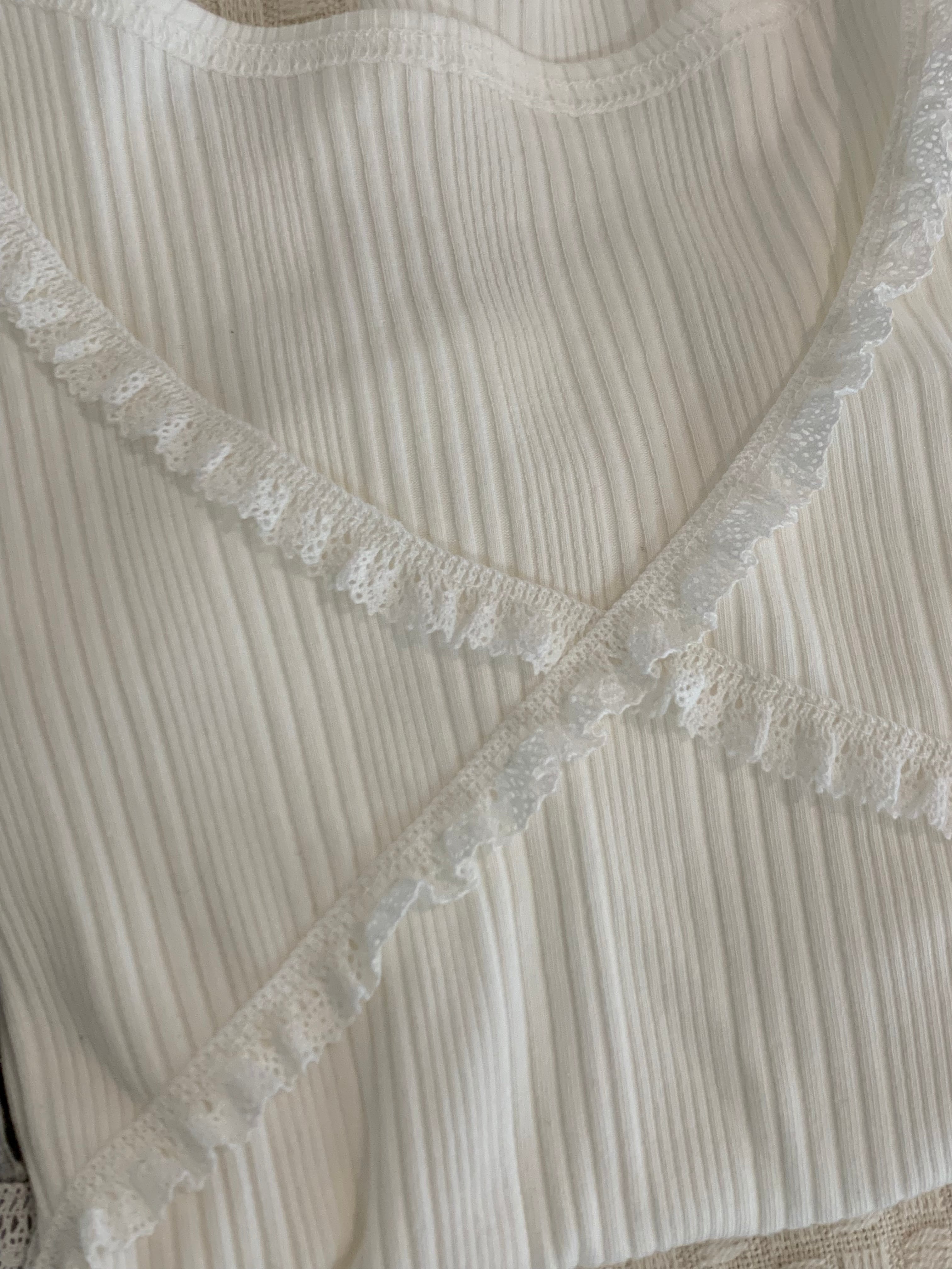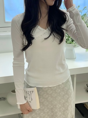 胸元のクロスデザインとフリルが可愛らしいデザインのリブトップス。