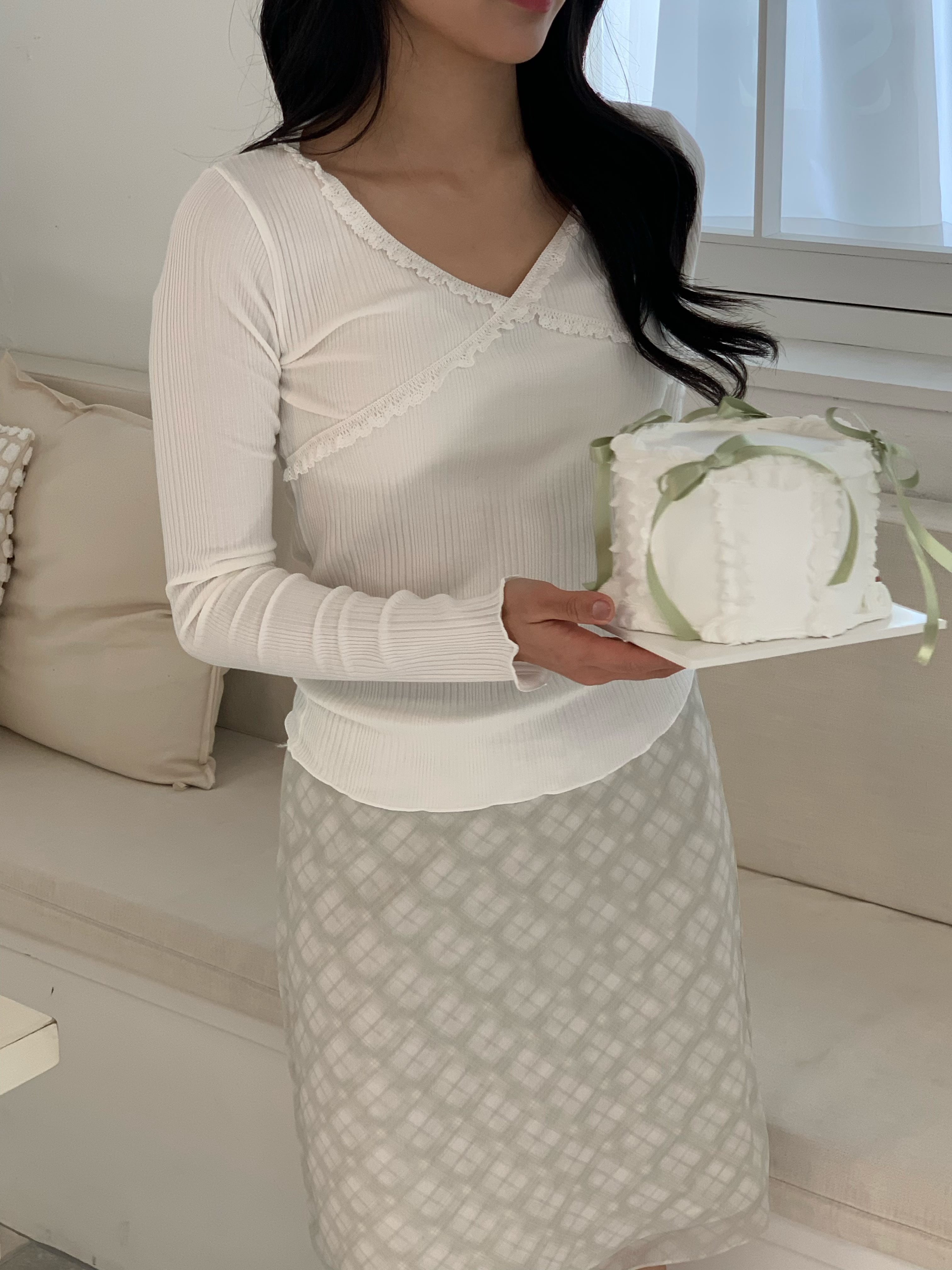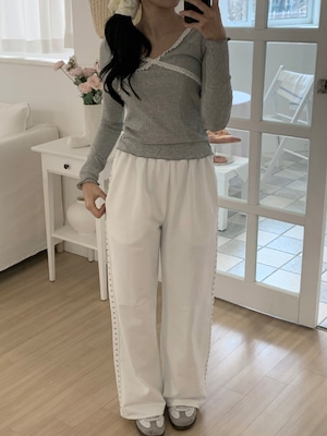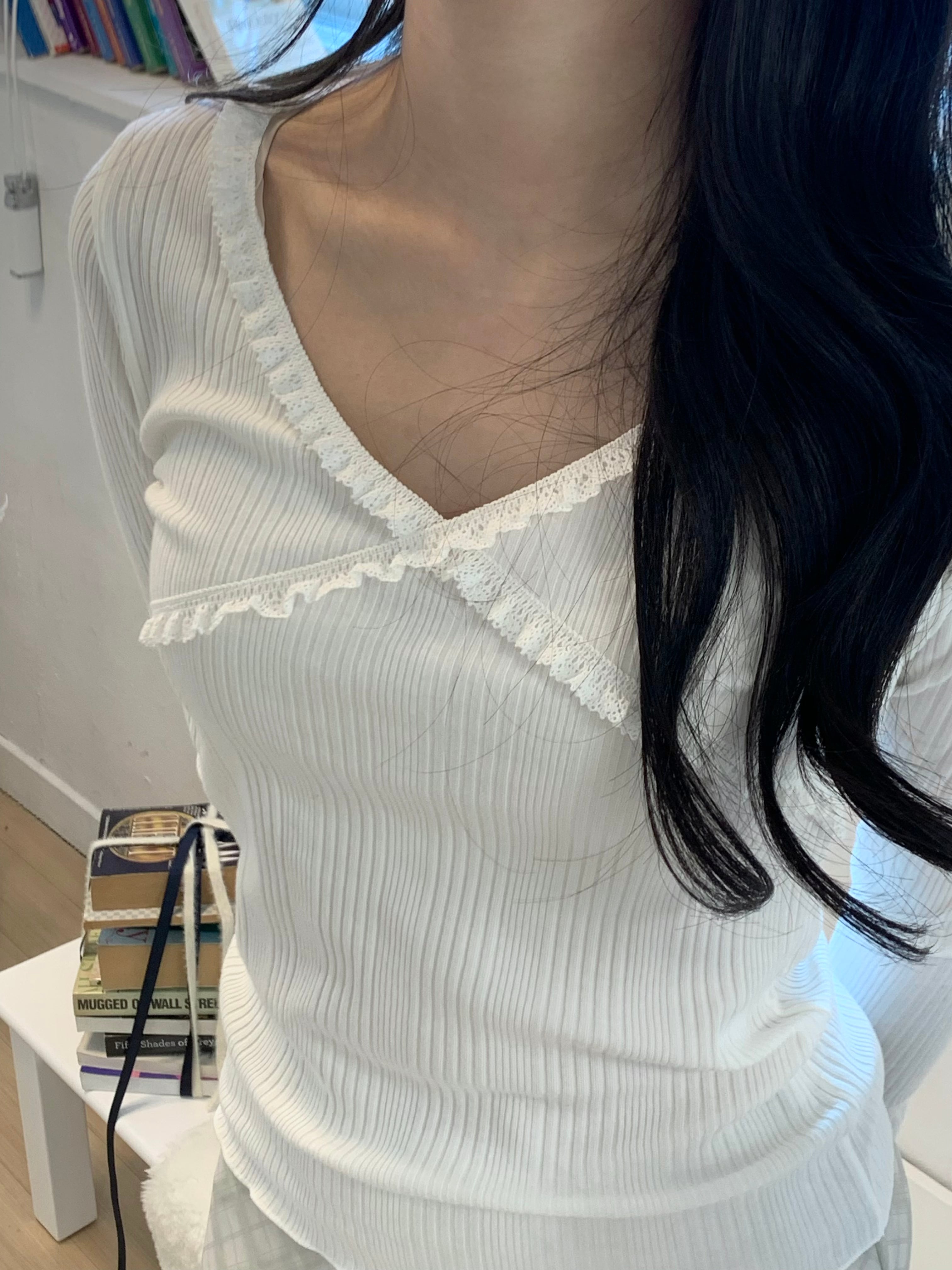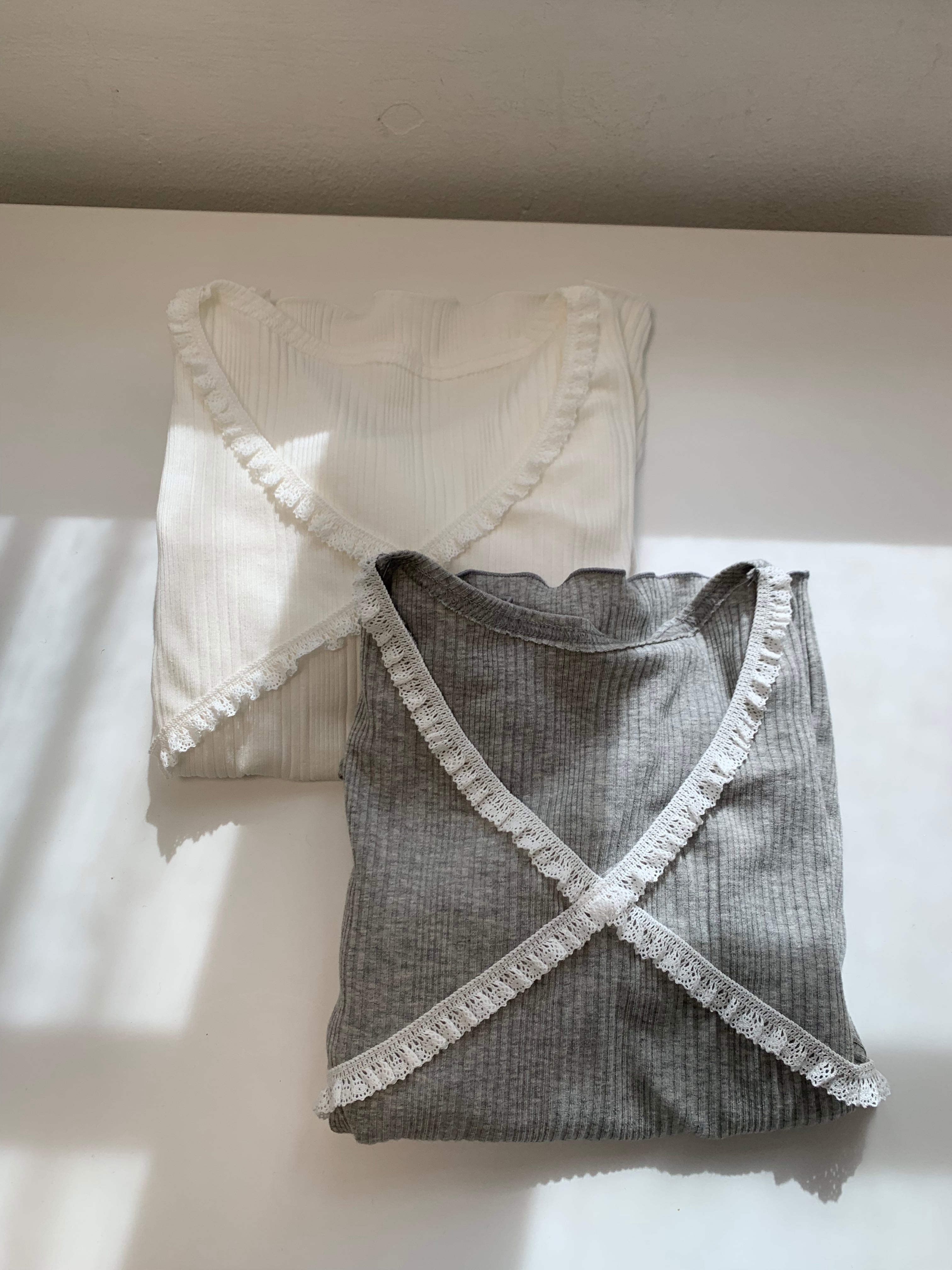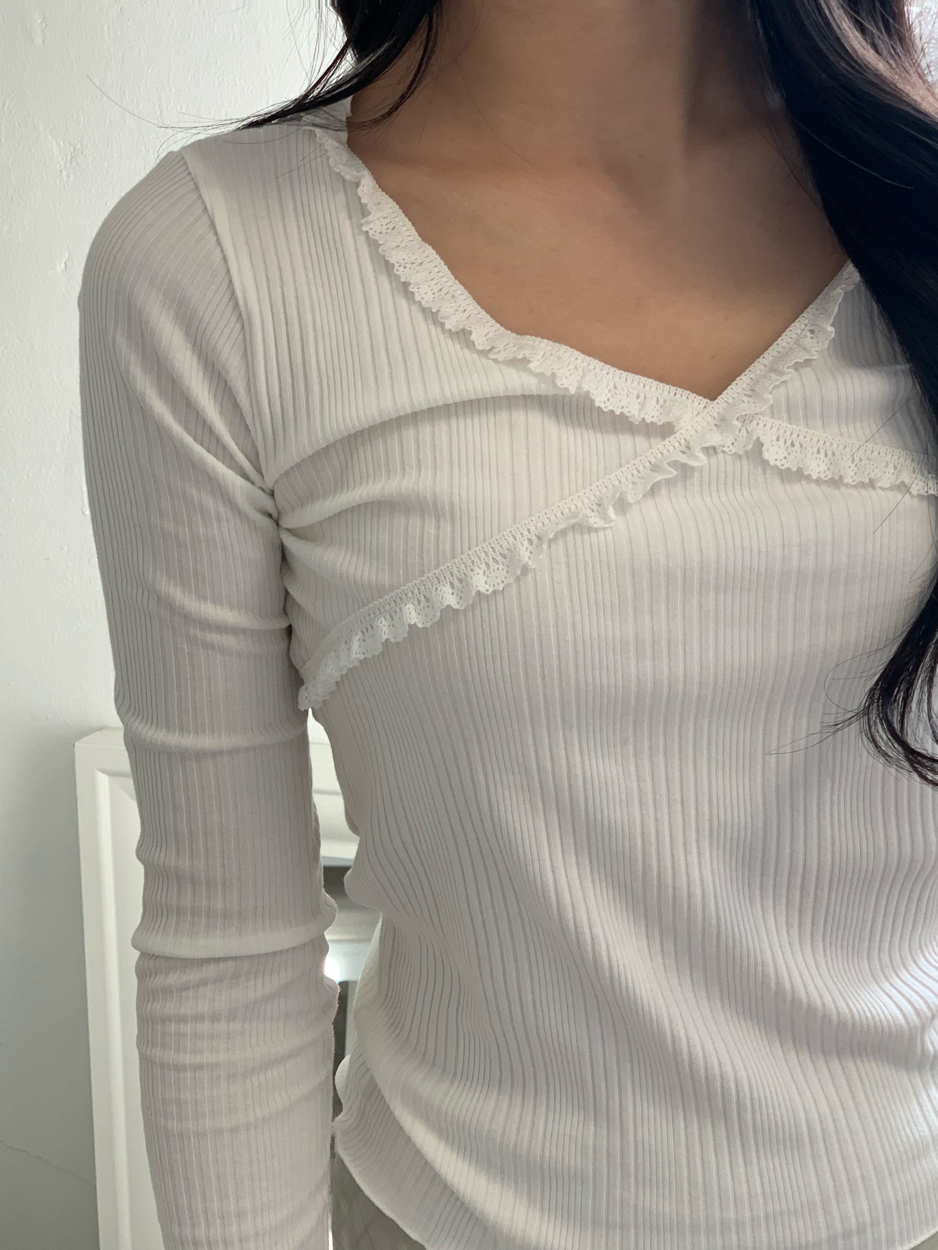 胸元のクロスデザインとフリルが可愛らしいデザインのリブトップス。