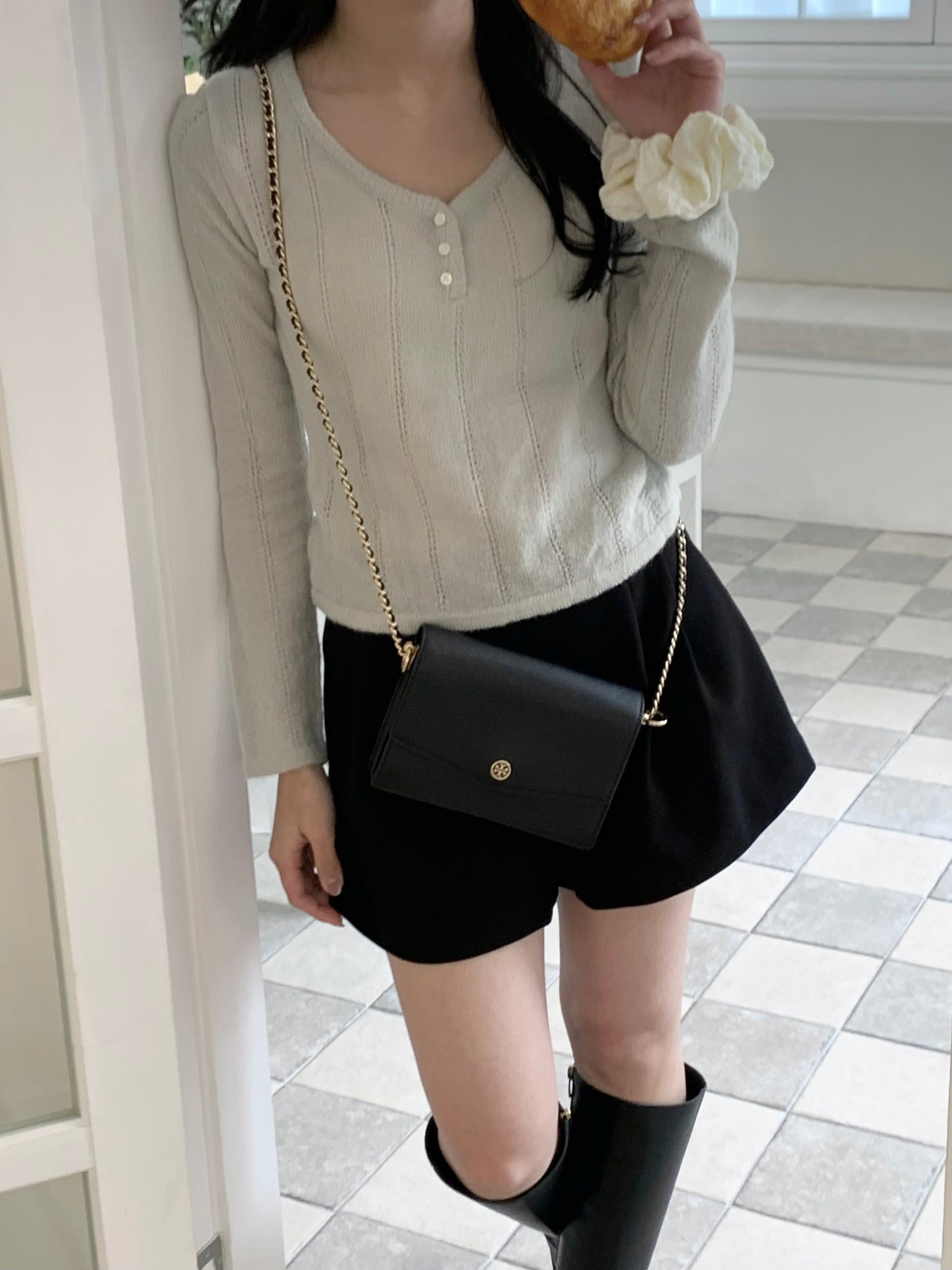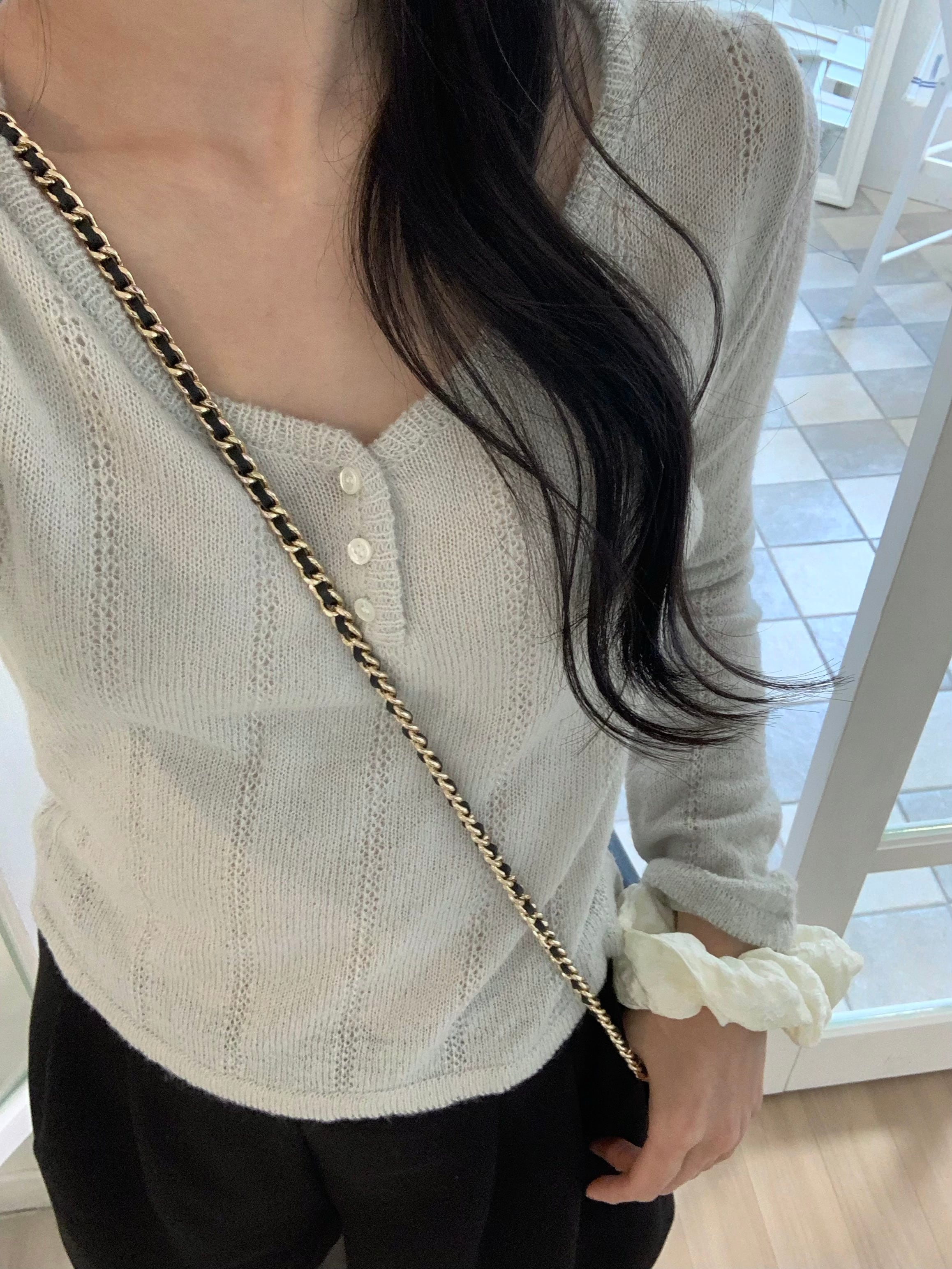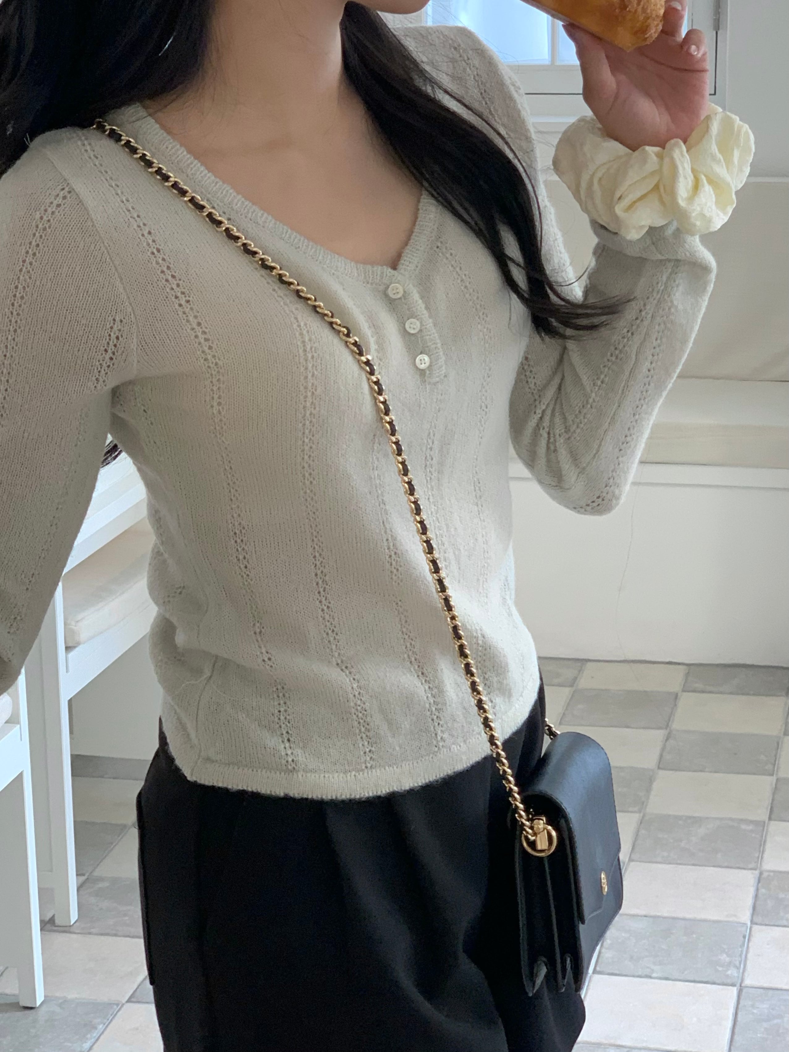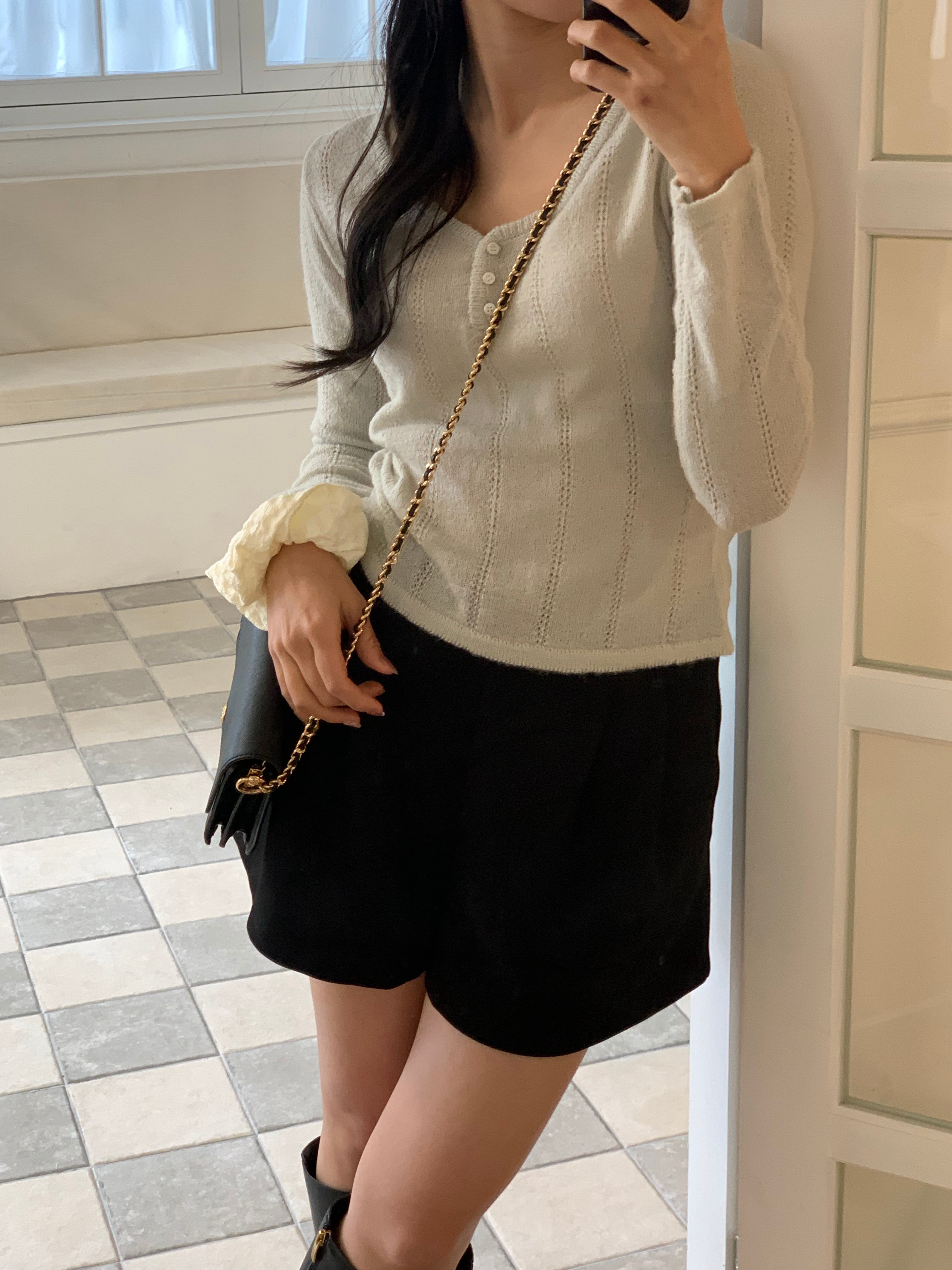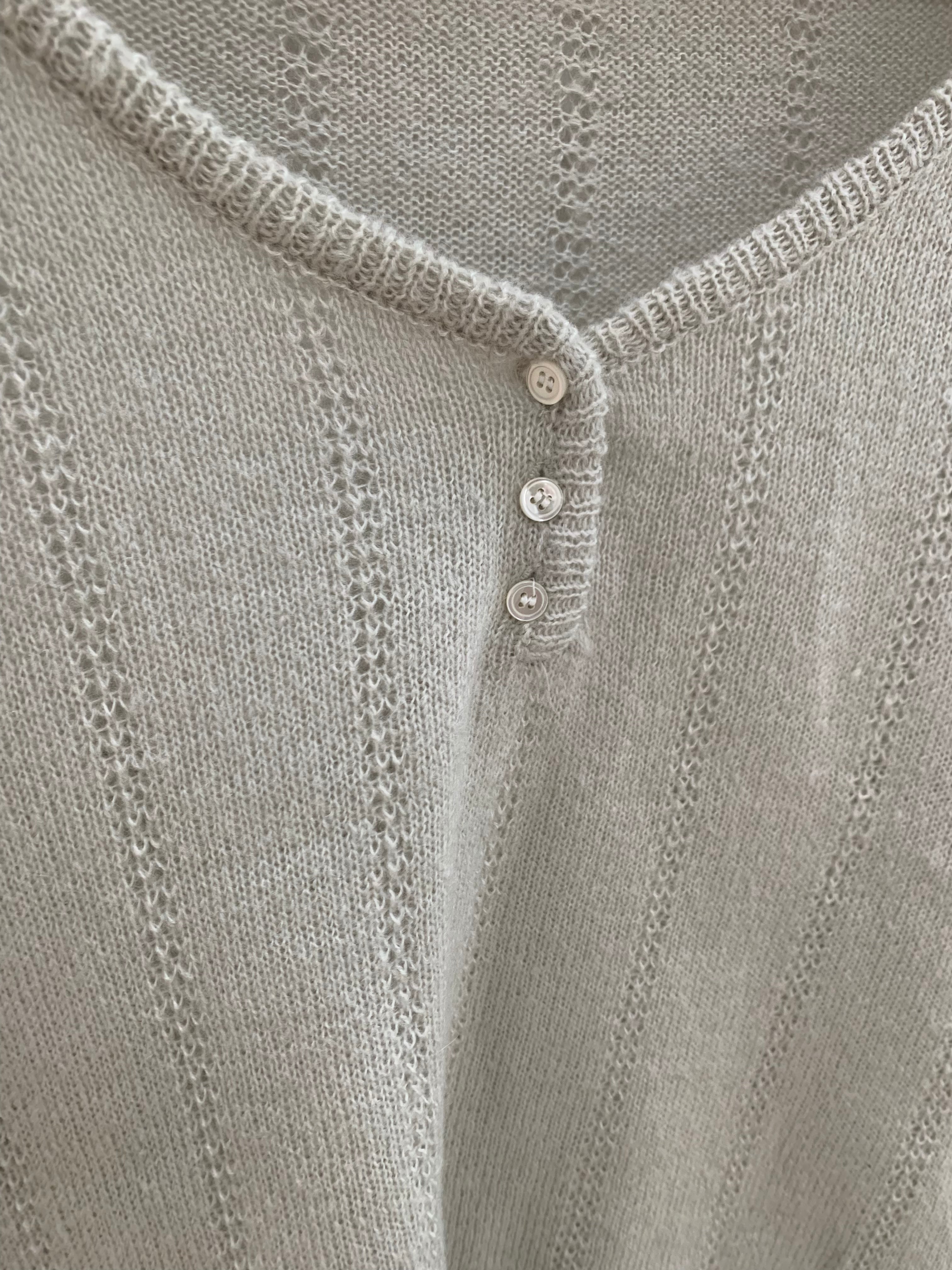 程よいフィット感とフロントの小さなボタン、Vネックがデコルテをすっきりと見せ、上品でフェミニンな印象に。