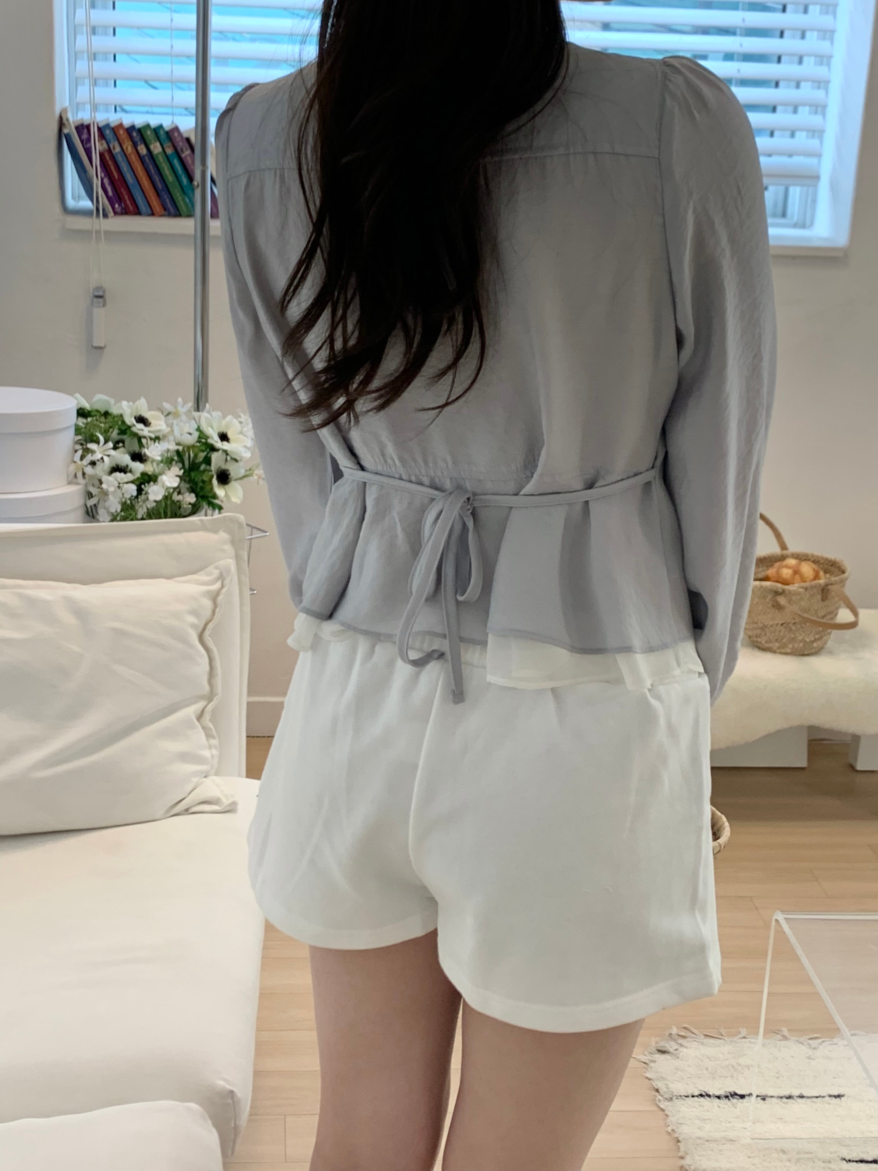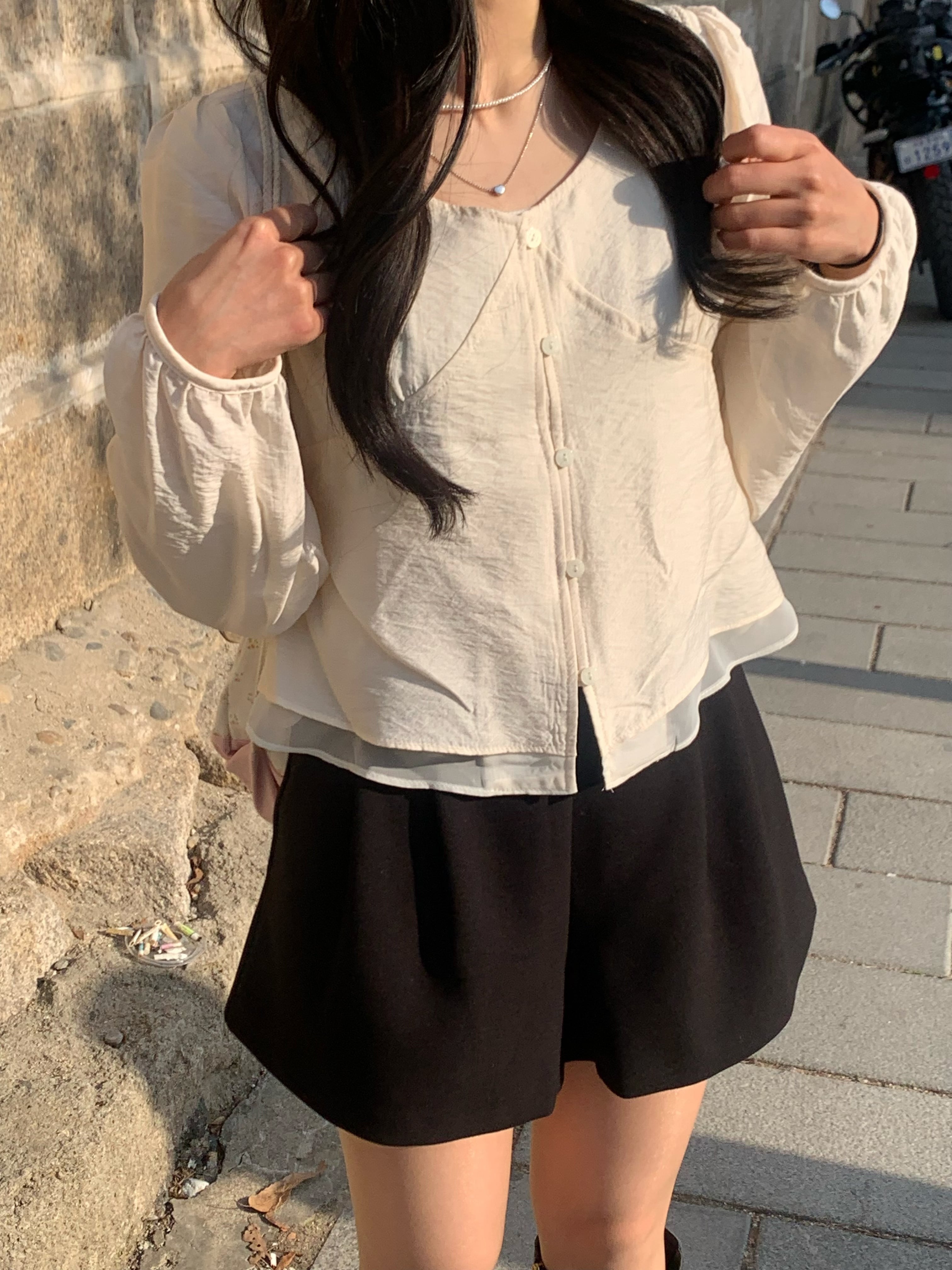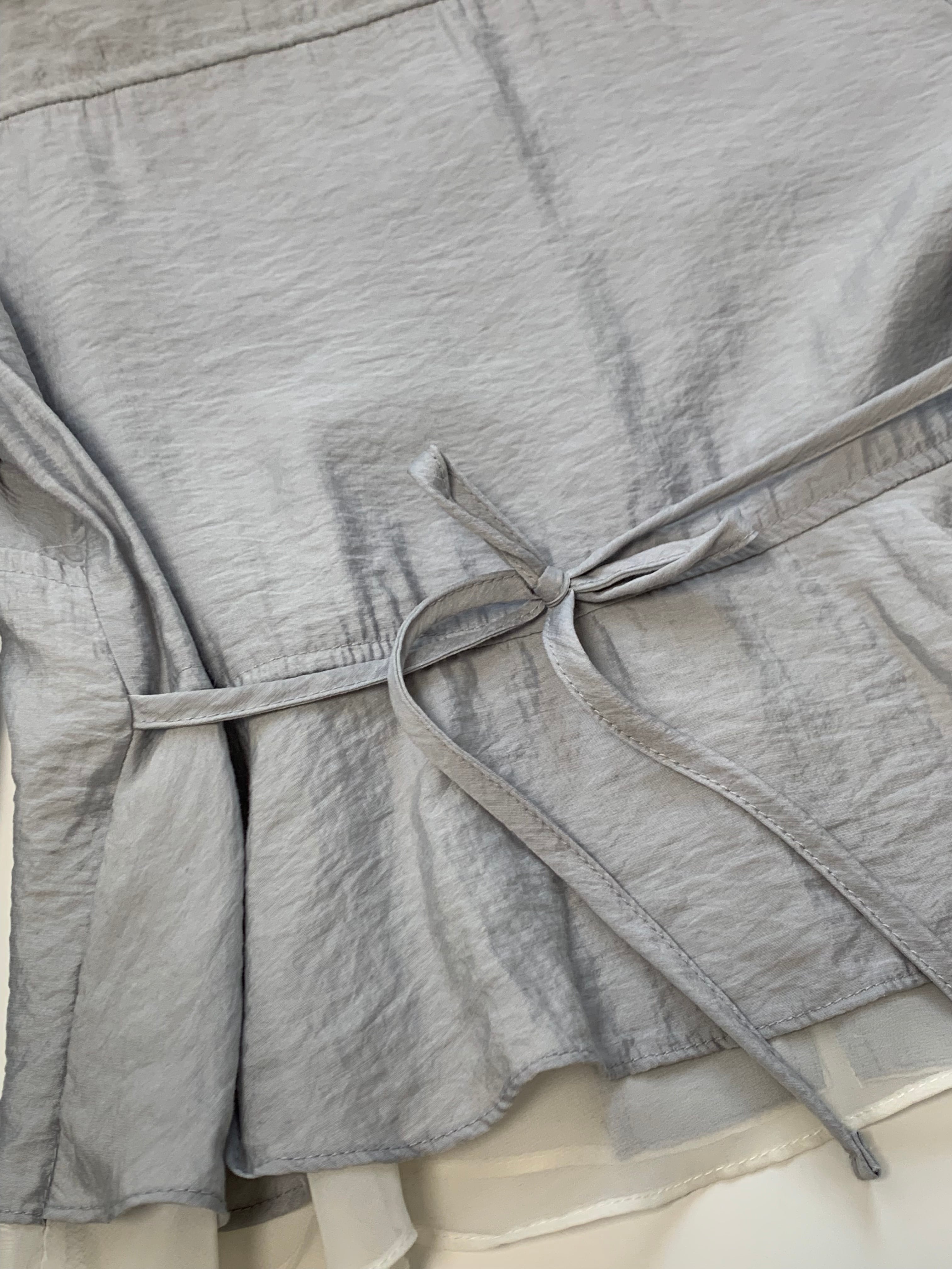 裾から覗くシアー素材が、軽やかで抜け感のあるスタイリングに。