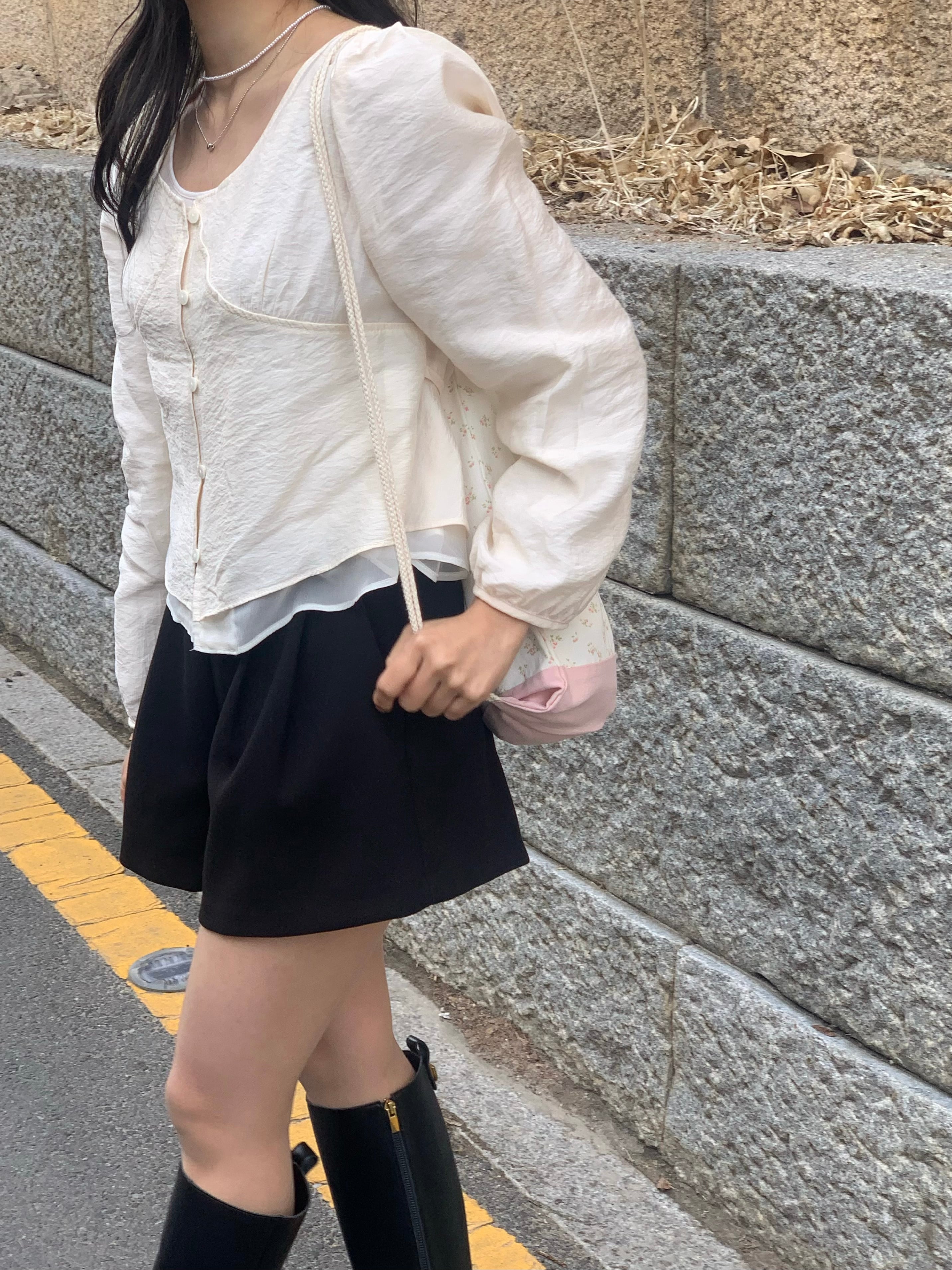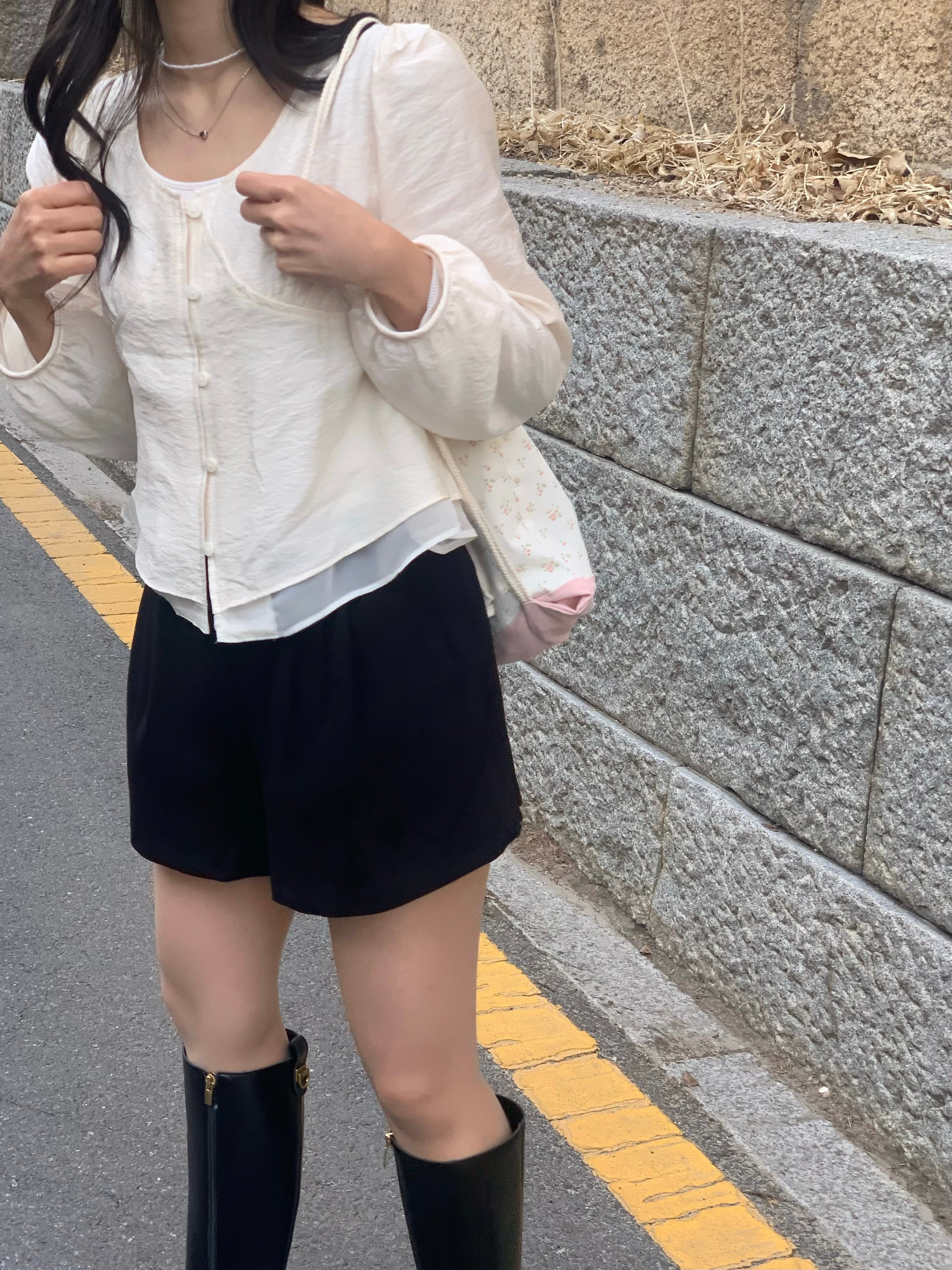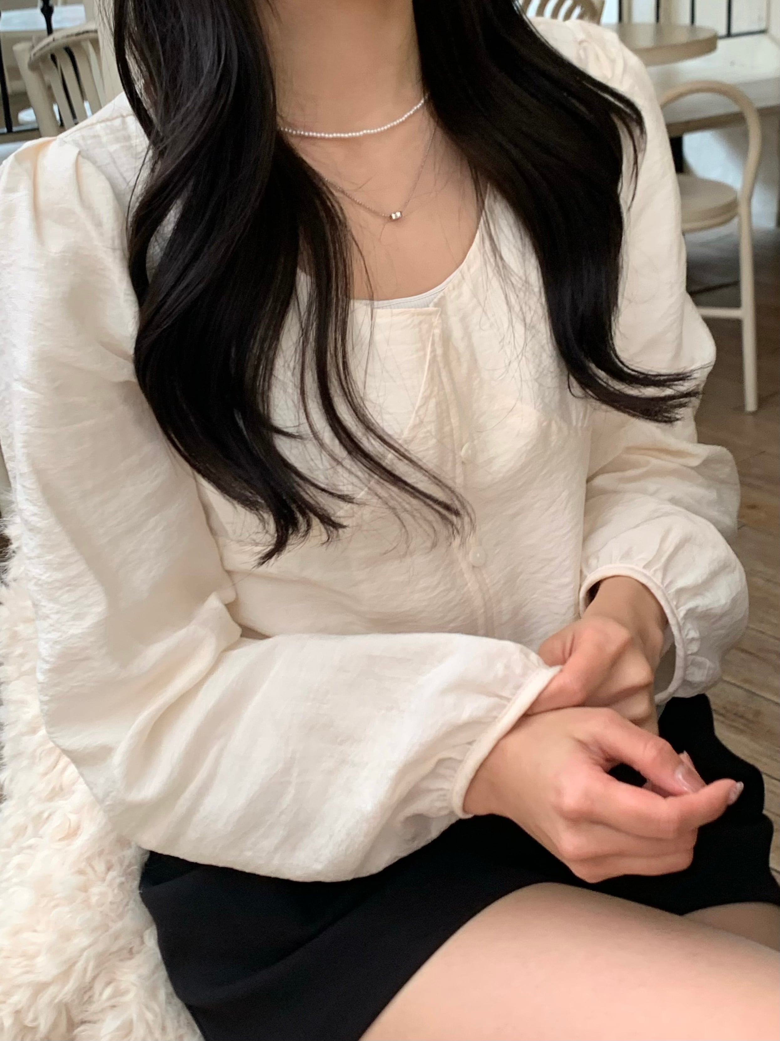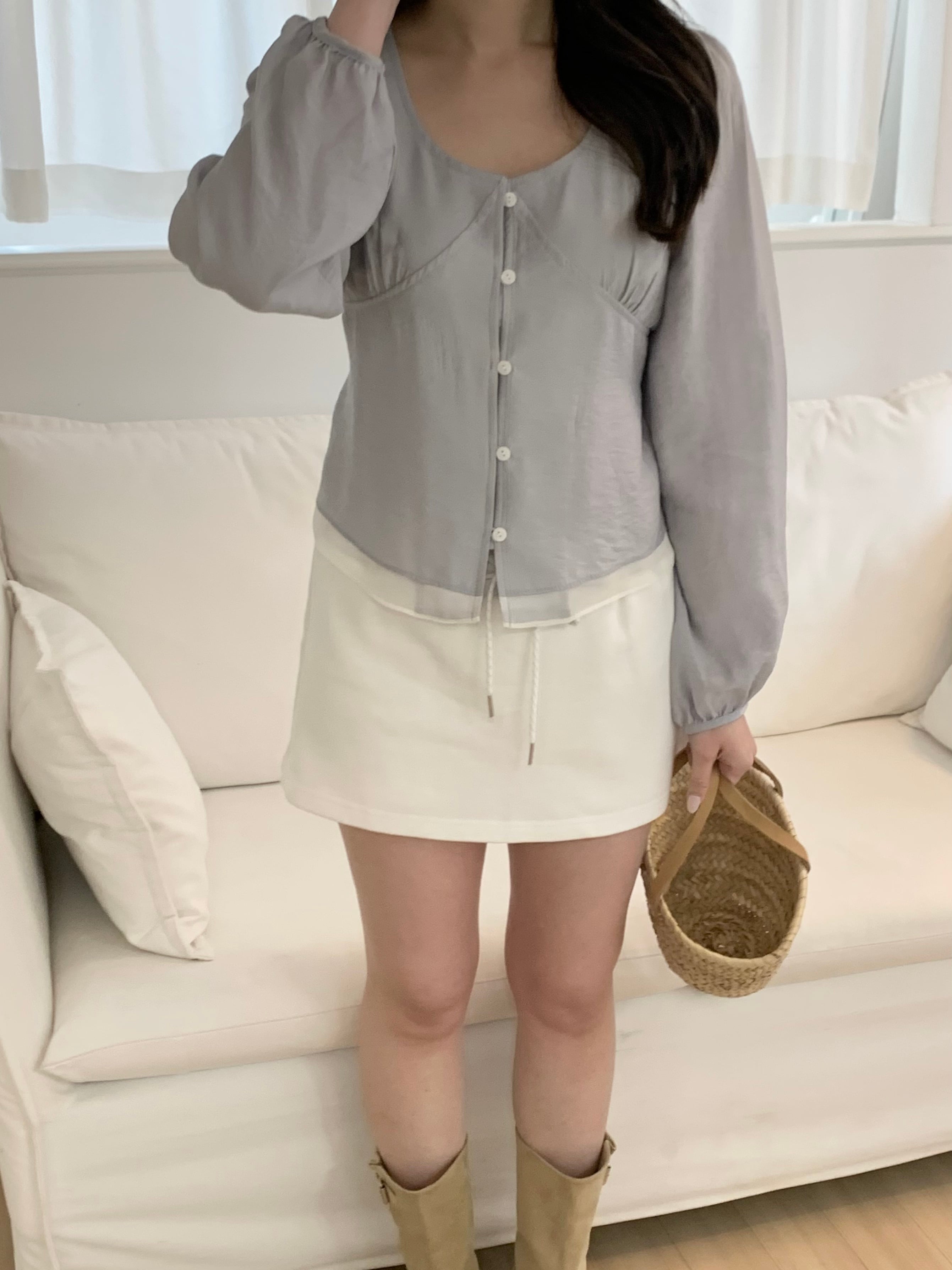 裾から覗くシアー素材が、軽やかで抜け感のあるスタイリングに。