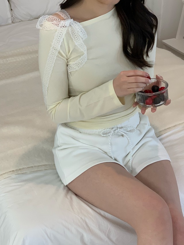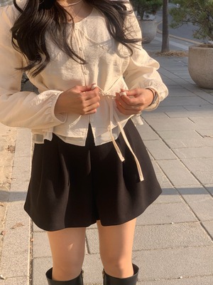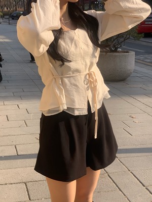 ウエスト部分のリボンストラップが自然にシルエットを引き締め、細見え効果も◎