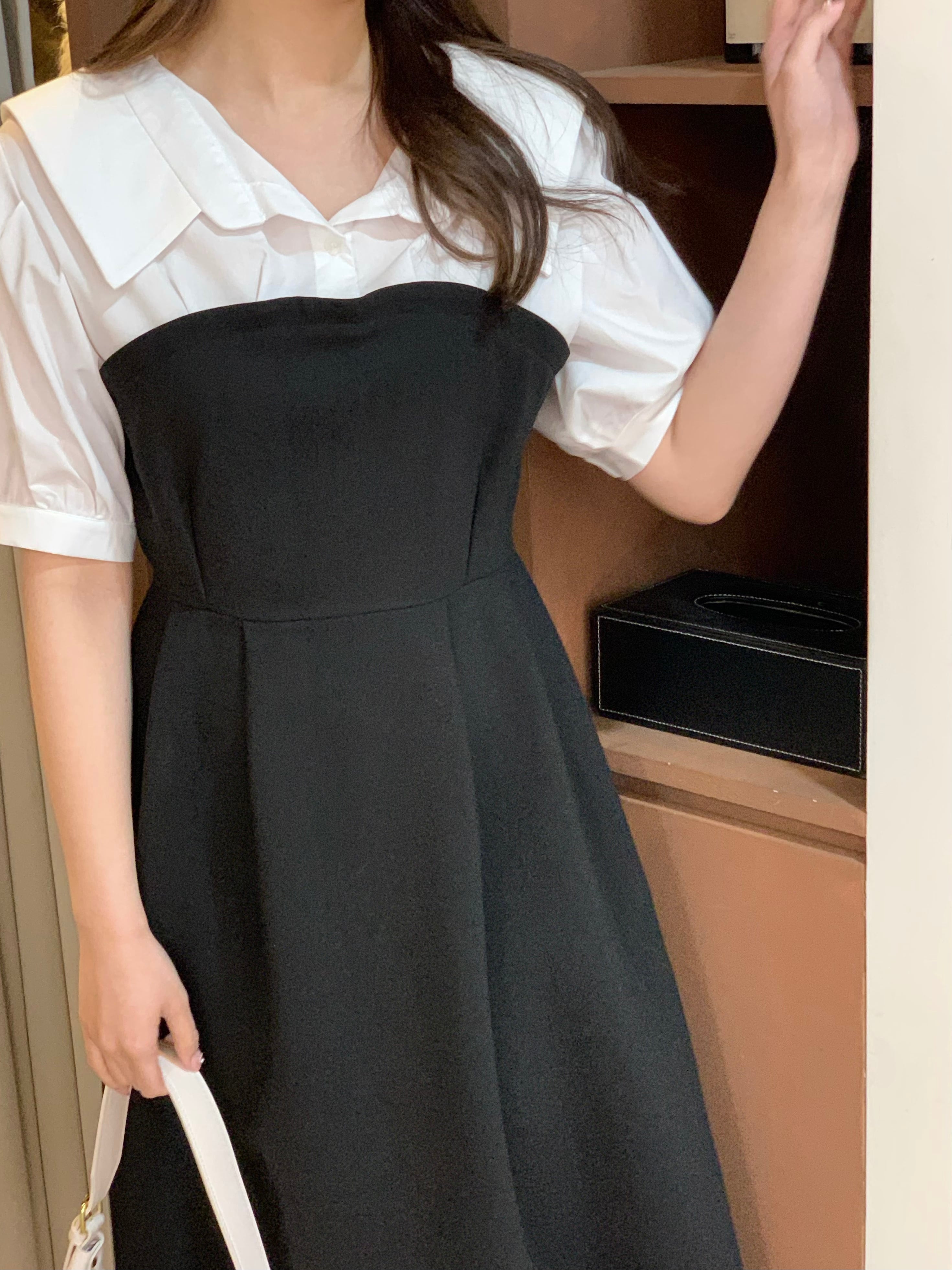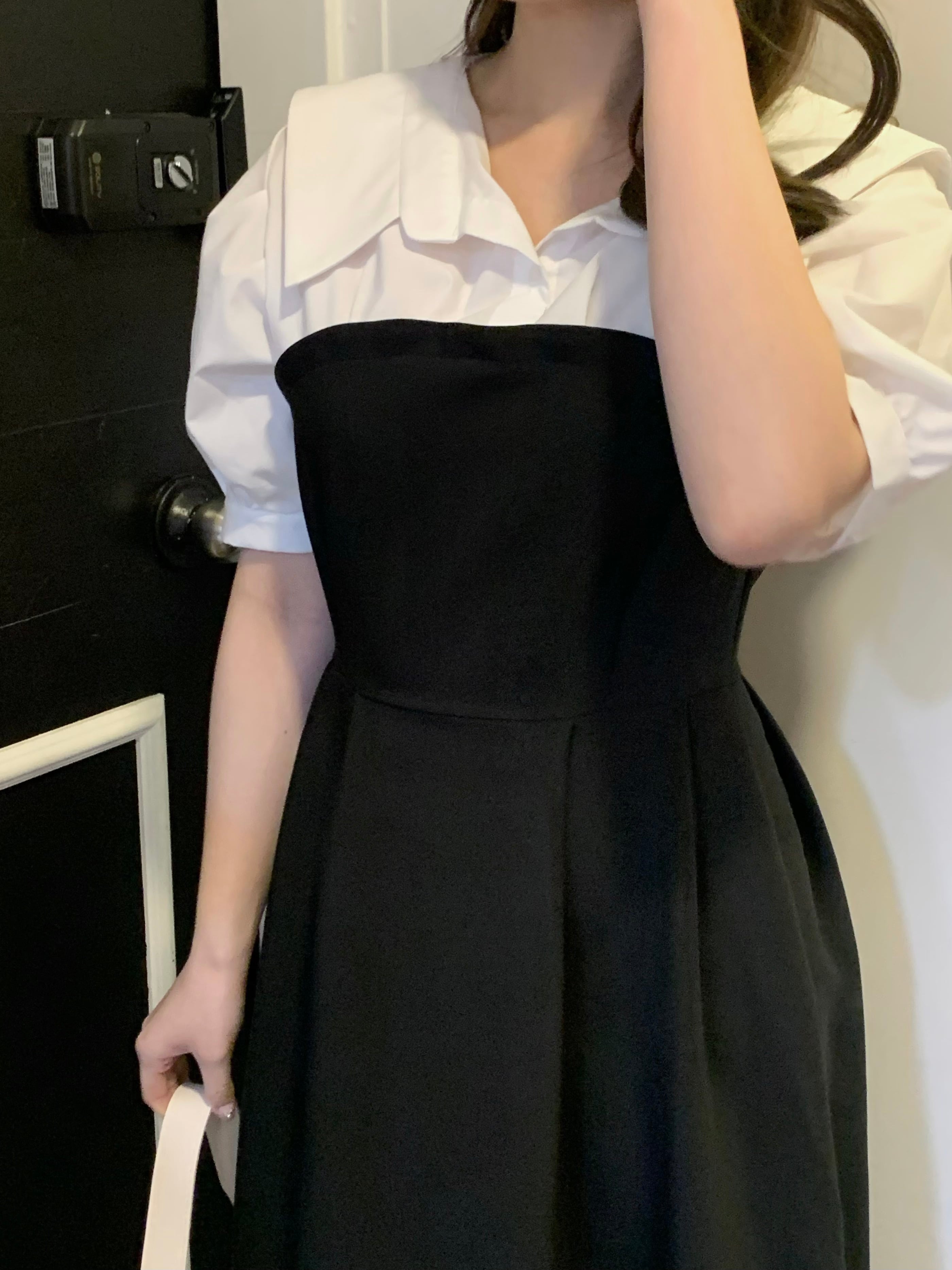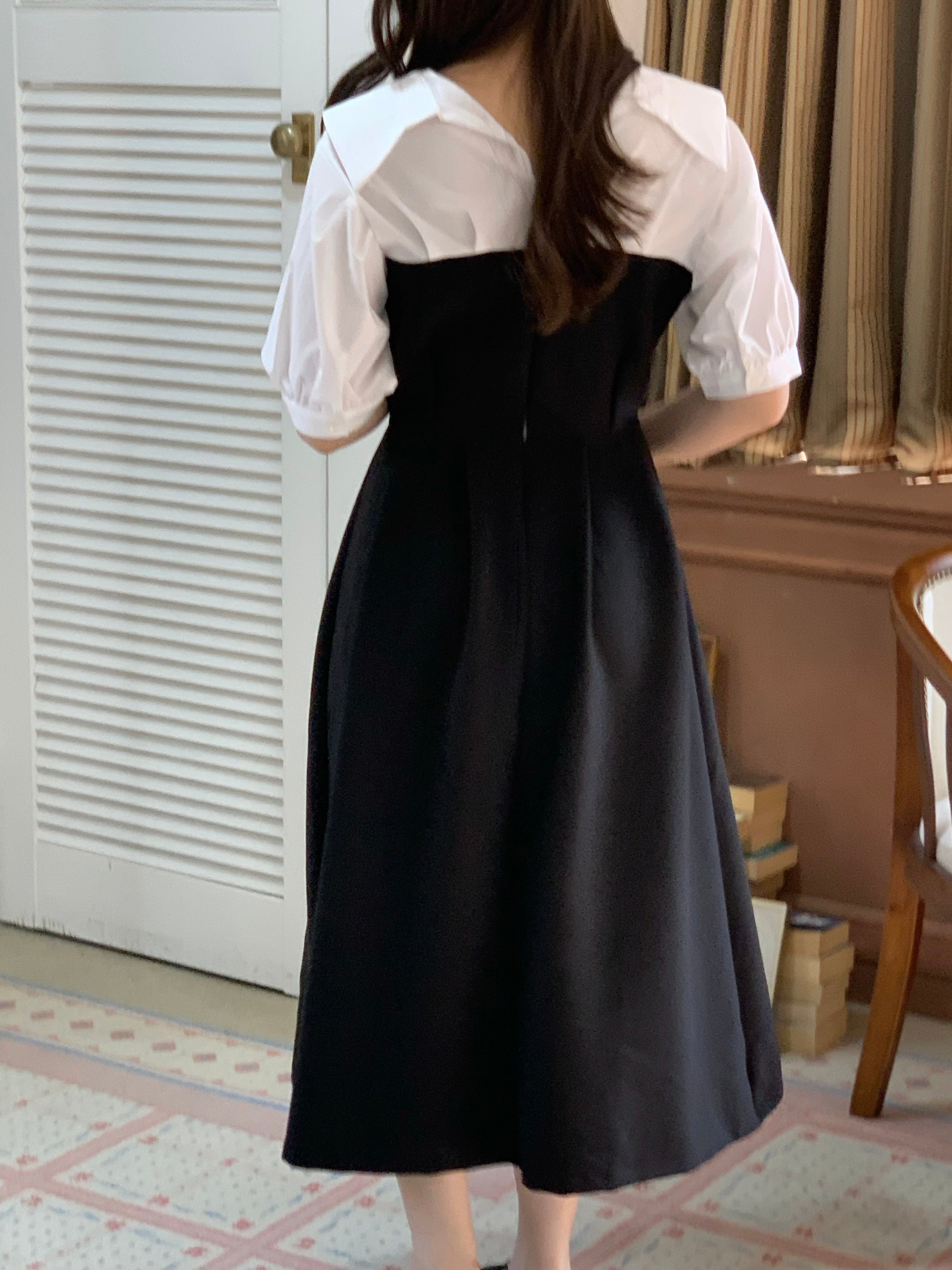 半袖シャツとジャケット生地で作られたシャツレイヤードドレス。フィット感とディテールがポイント。ファスナーが付いているので着脱を楽々に。腰部分のディテールがウエストラインを細く見せることができクールなネックラインがスリムに魅せてくれます。高級感のシルエットがオケージョンにぴったりです。