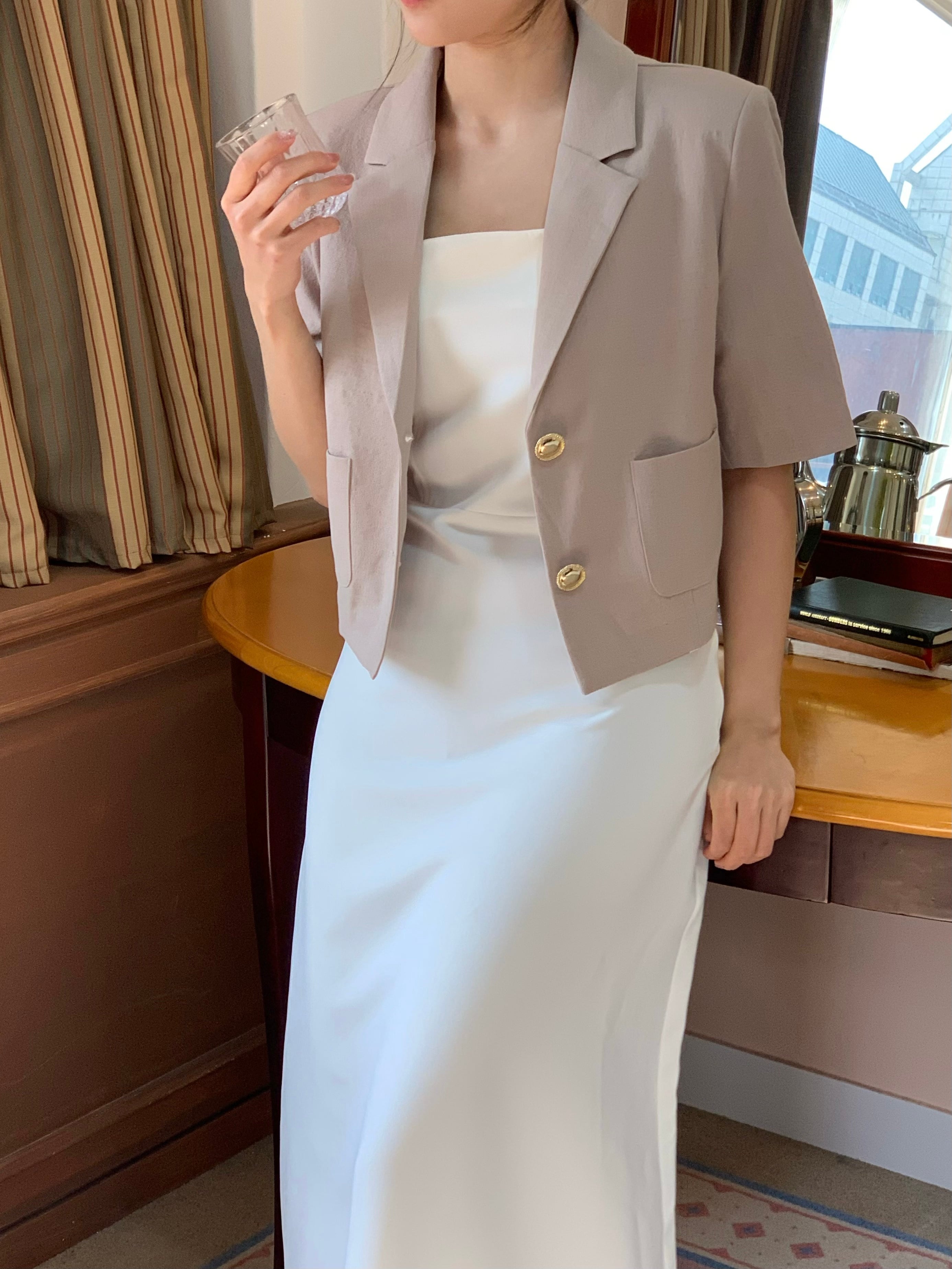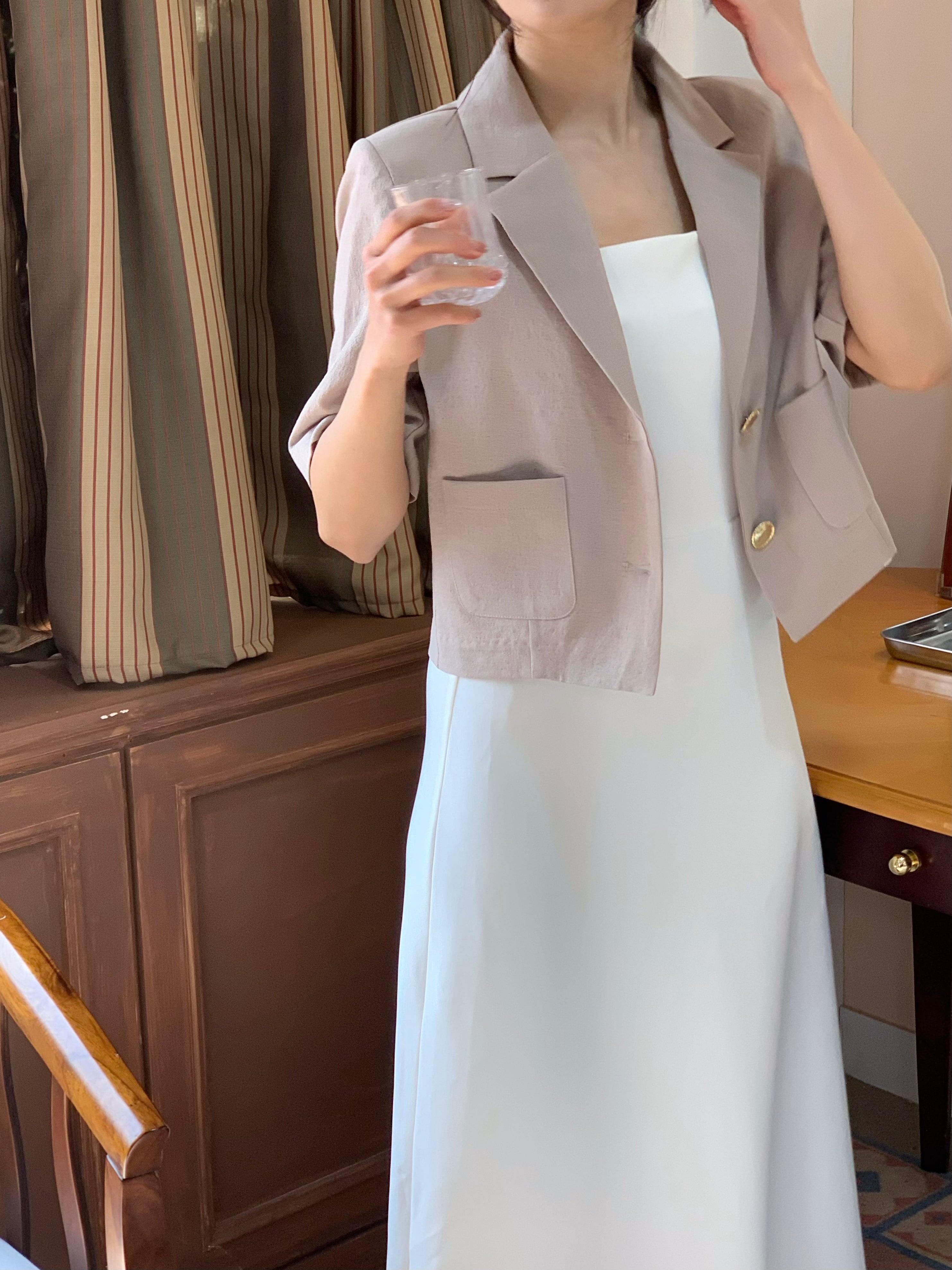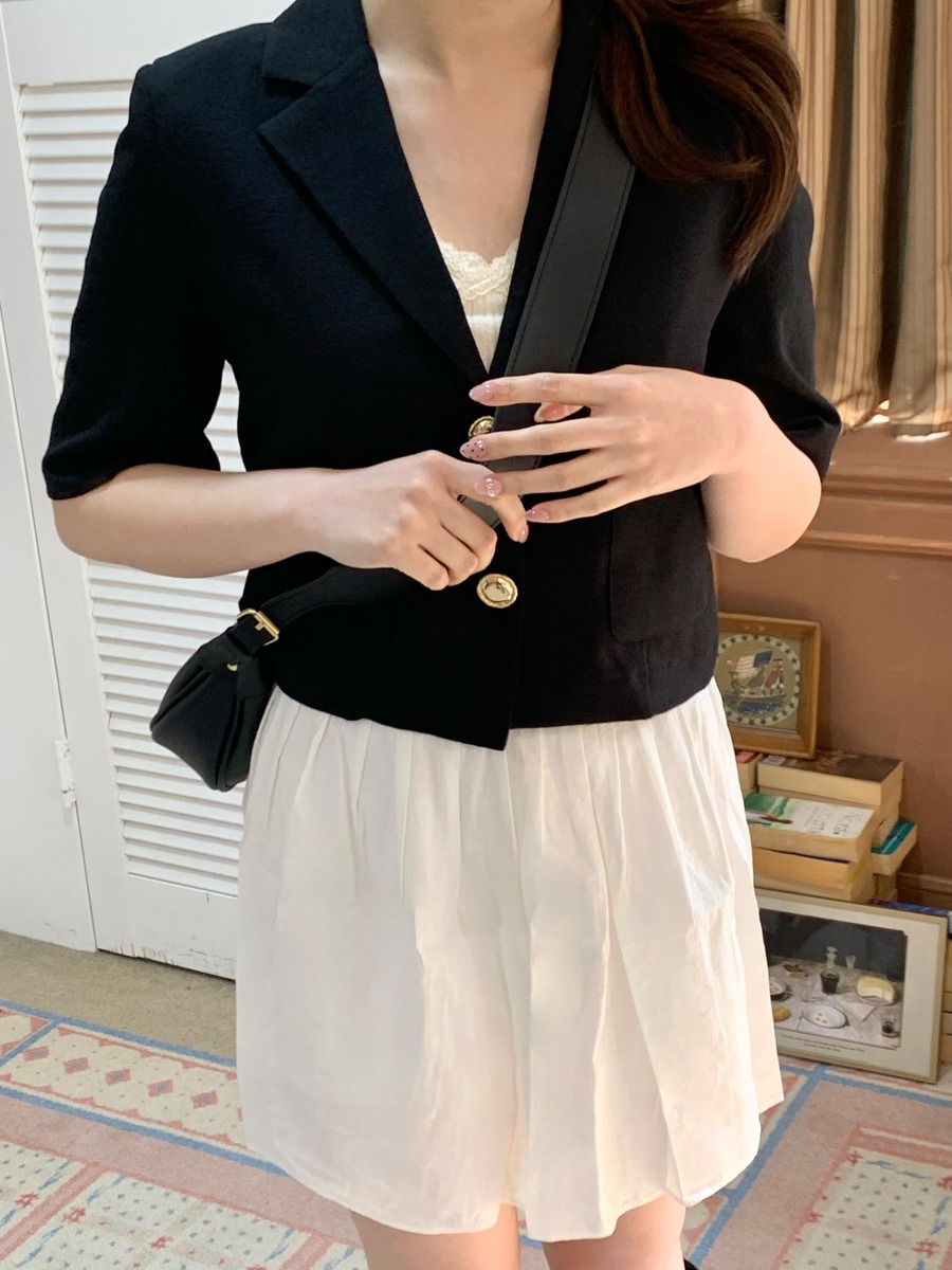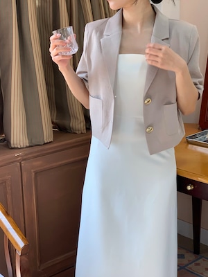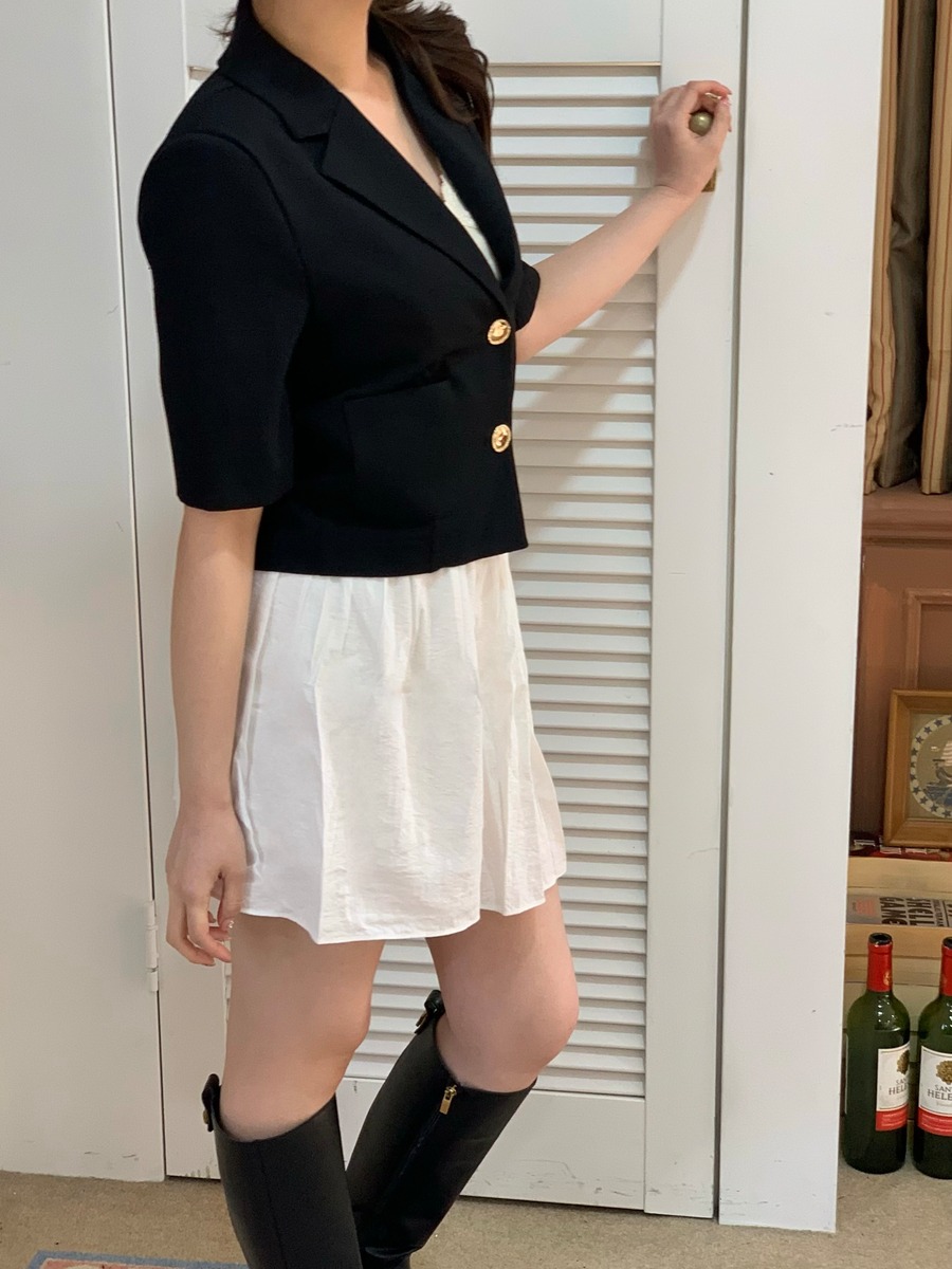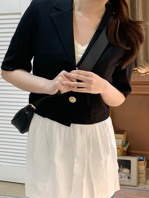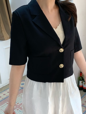 高級感あるボタンが魅力的なショートジャケット。肩パッド入りなので綺麗なシルエットで着用できます。ボタン開け閉めでの2Wayコーデやスカート、パンツスタイルで雰囲気を変えて楽しめることができます。ショート丈なのでスタイルアップにもなり軽量で涼しく着用できるサマーショートジャケットです。オフィスルックにも◎