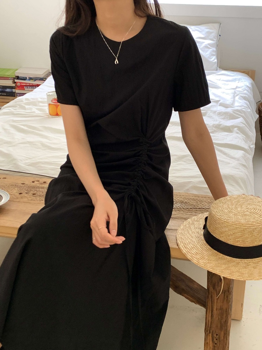 紐で調節できるドローストリングロングワンピース。ゆとりを持たせたいときは伸ばしたまま、メリハリを付けたいときはギュッと紐を締めることでコーデに変化を持たせることができて魅力的なアイテムです。1枚で決まるアイテムなので旅行ルックなどにも◎