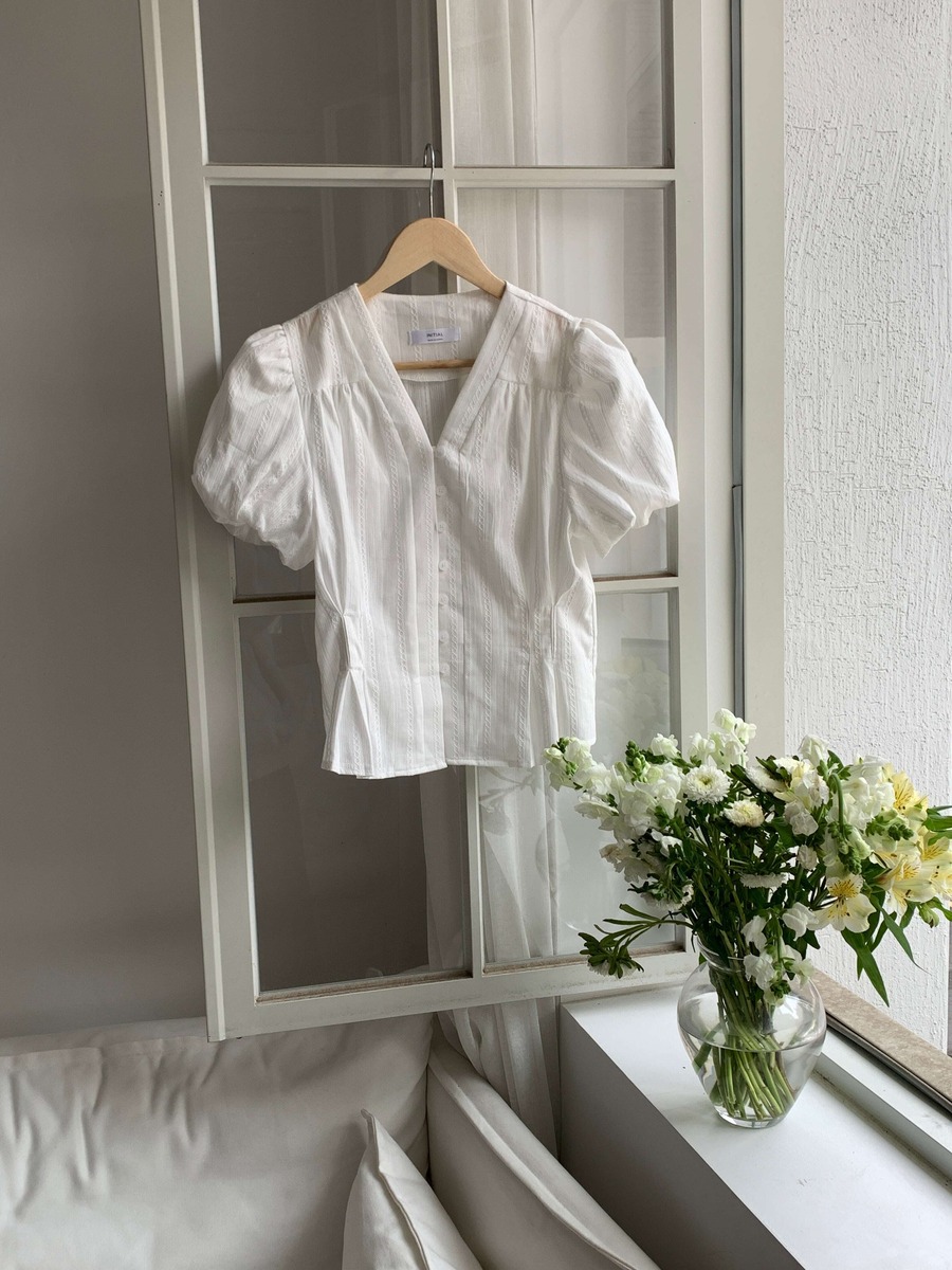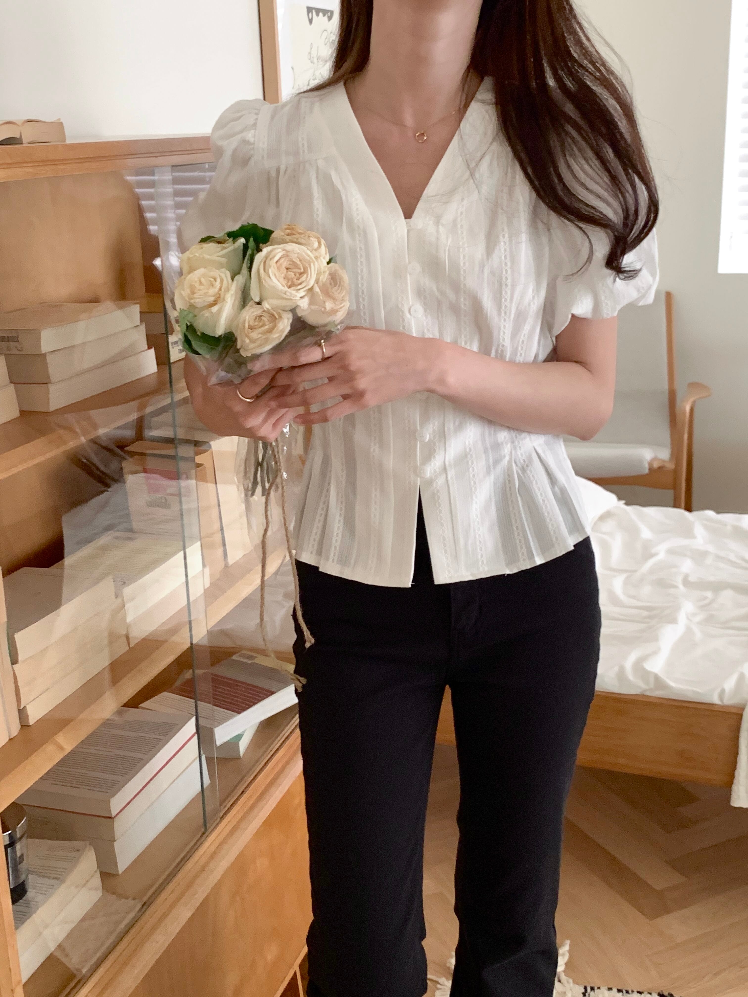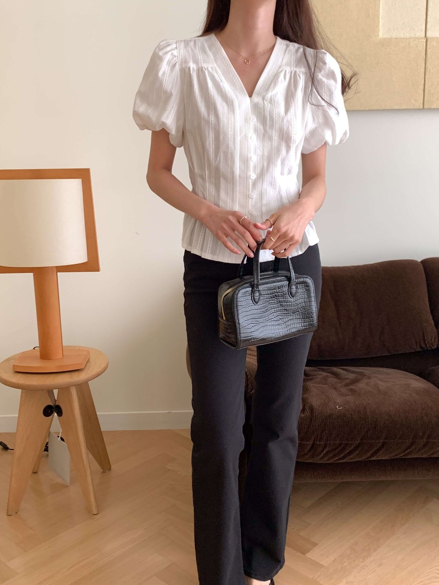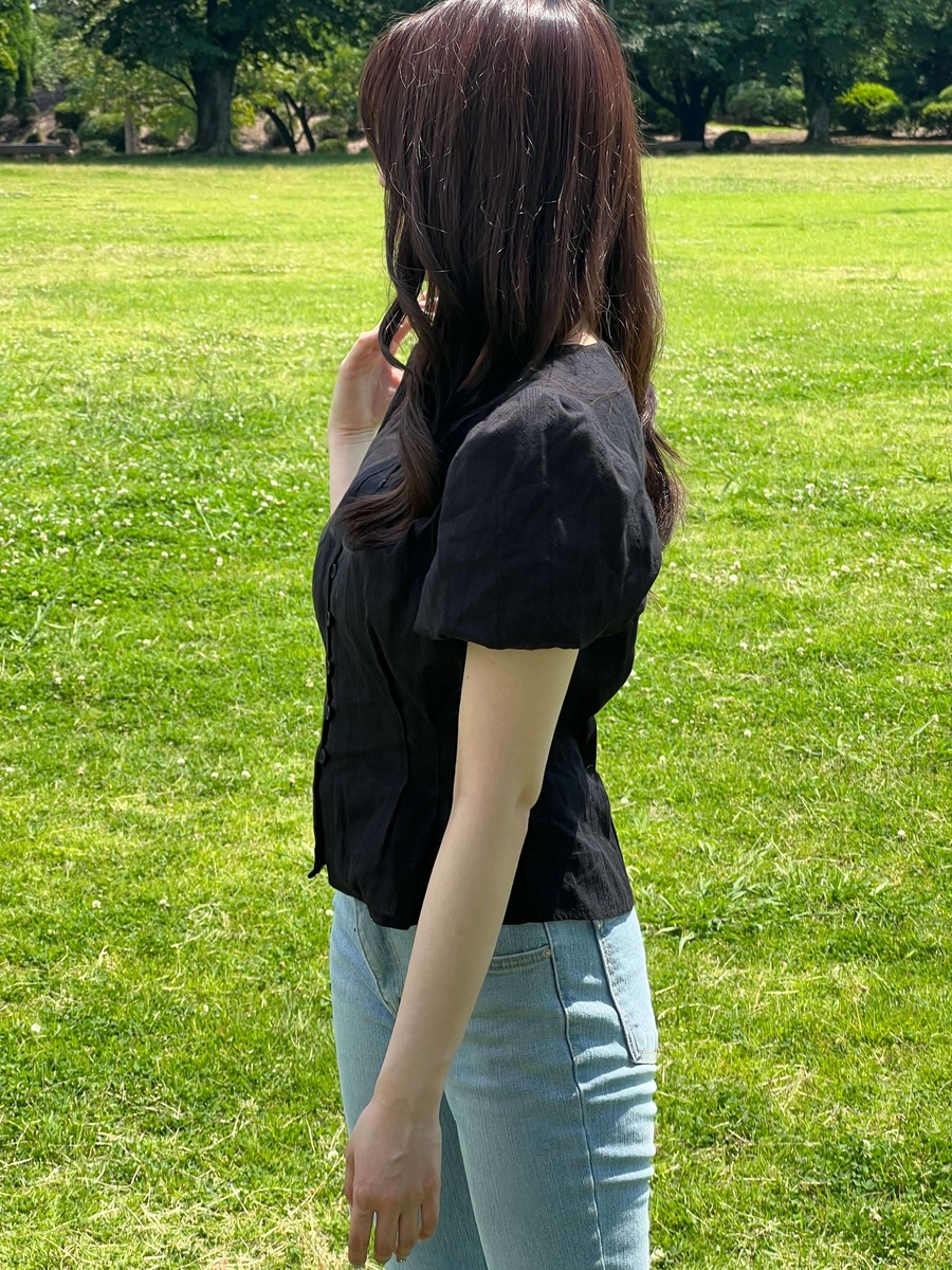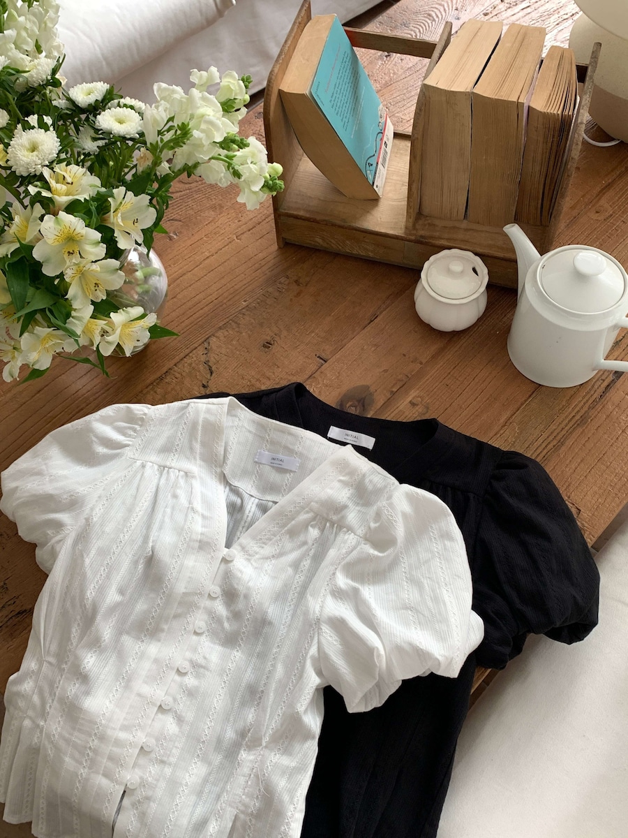 ディテールが可愛らしいレースブラウス。袖口にボリュームがありシルエットがとても可愛らしくコットン素材で肌触りも良いです。パフスリーブで顔回りもスッキリしウエスト部分がスリムに見えるシルエットで、綺麗に見えるラインが女性らしい雰囲気を演出してくれます。デニムやスラックスなどボトムスも合わせやすいです。裏地がないのでivoryであればスキントーン、ブラックであれば同系色のインナーと合わせて頂ければ透け感を気にすることなく着用できます!
