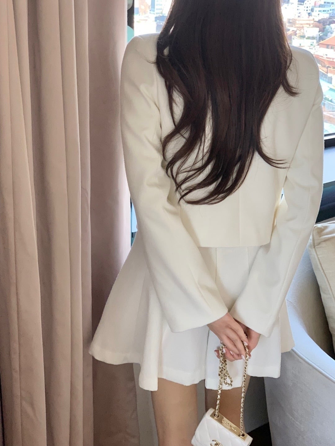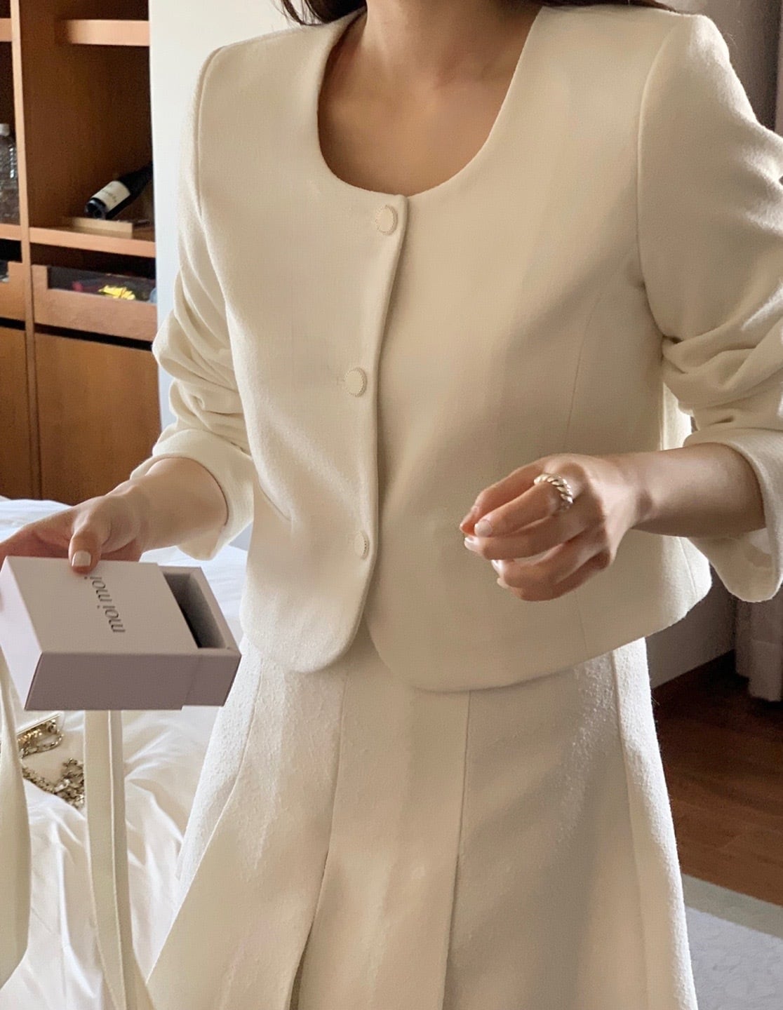 すっきりとしたノーカラーネックのでデザインにショート丈感がシンプルに演出されています。高級感あるボタンとUネックデザインがクラシックなムードでスカーフを付けることでフェミニンな印象にもなります。もちろんスカーフなしでもお洒落に着こなせるジャケットです◎