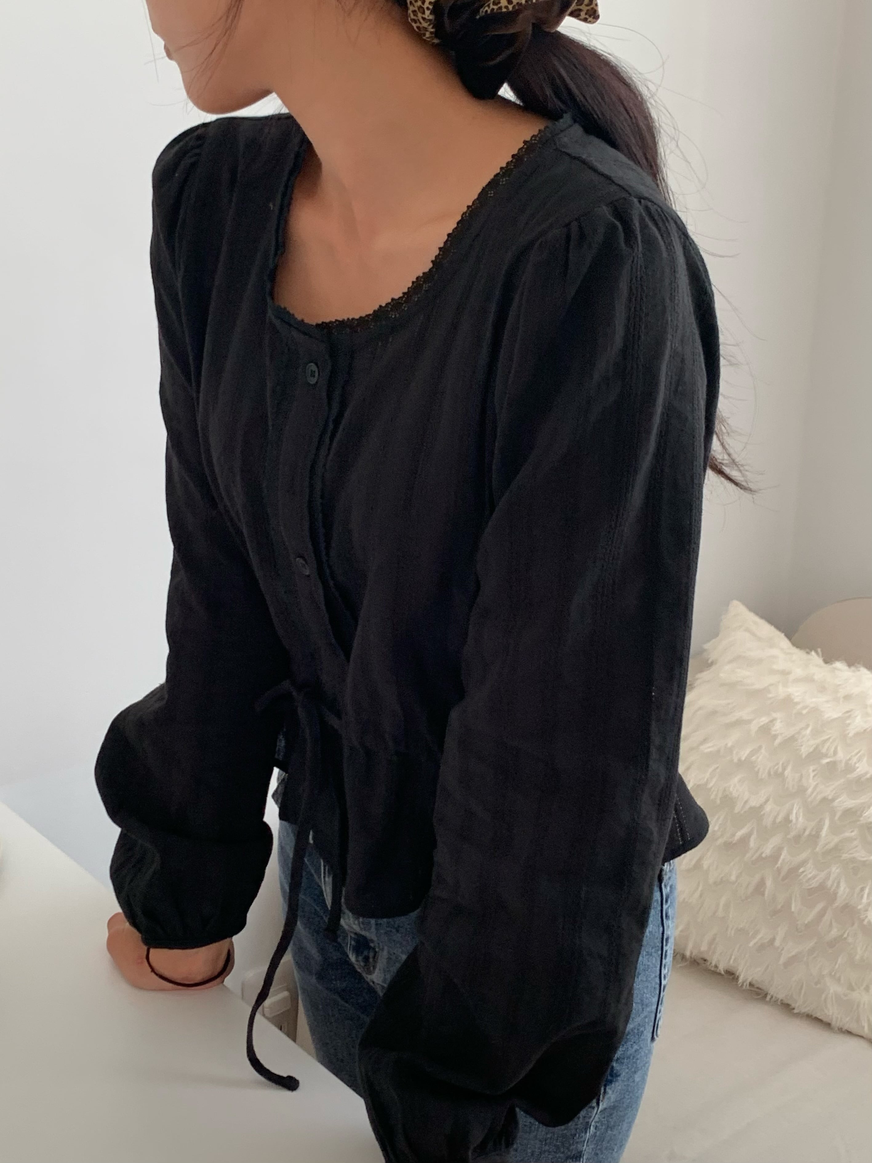 ウエスト部分を絞って結ぶことでウエスト周りが細くみえリボンが可愛らしいアイテム。襟部分はフリルが付いていて可愛らしいデザインです。レイヤードして着用することもできますし、春先にも着用することができます◎