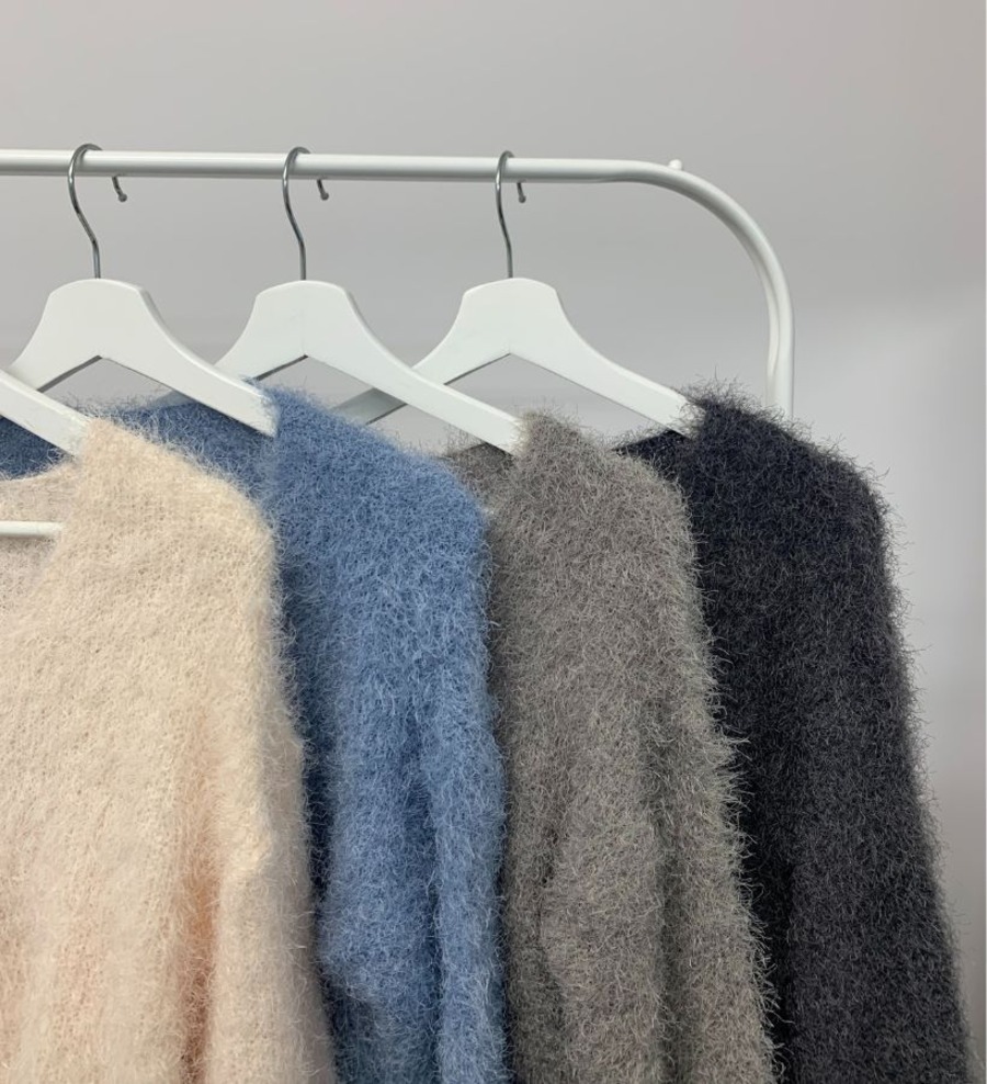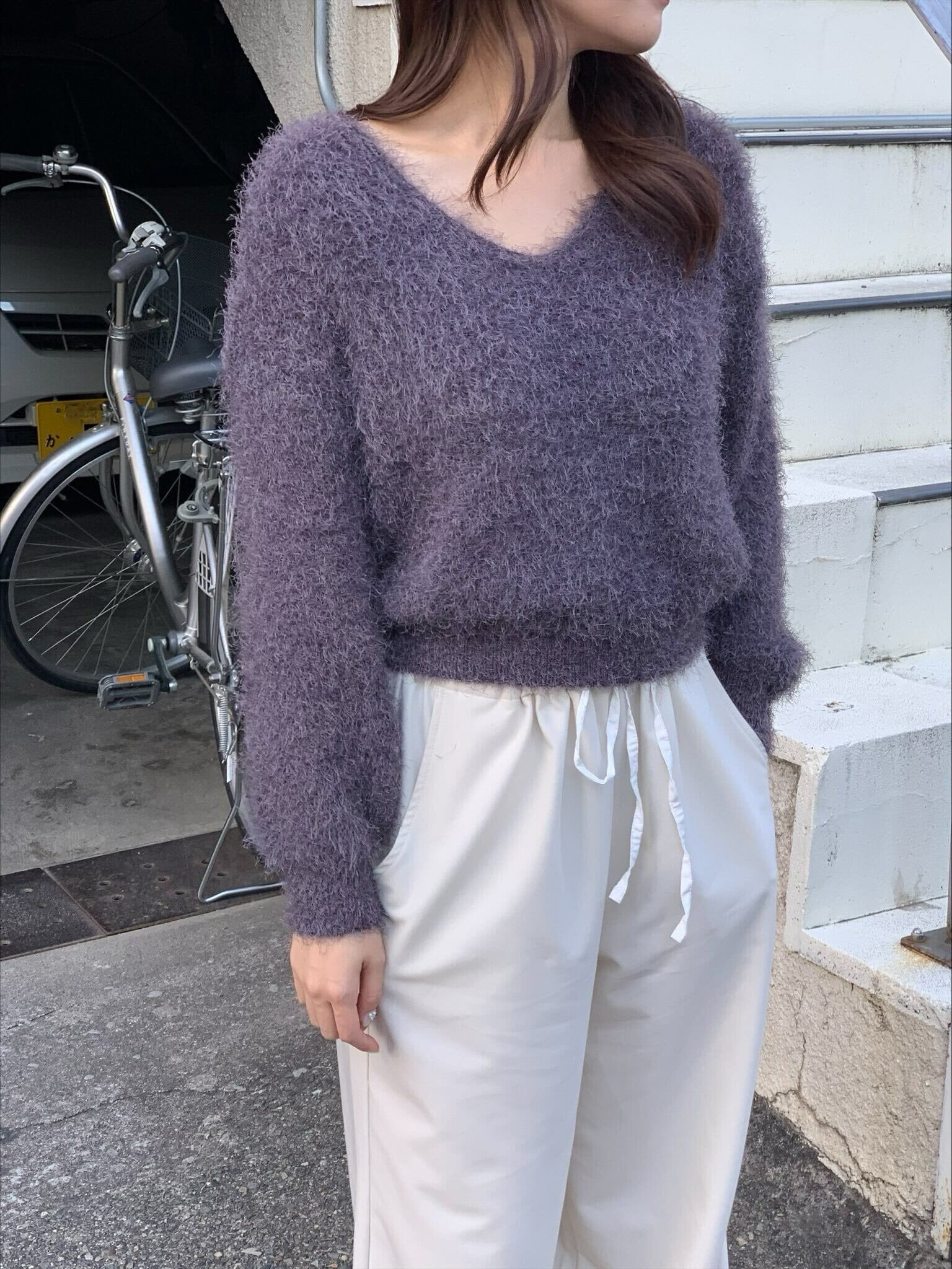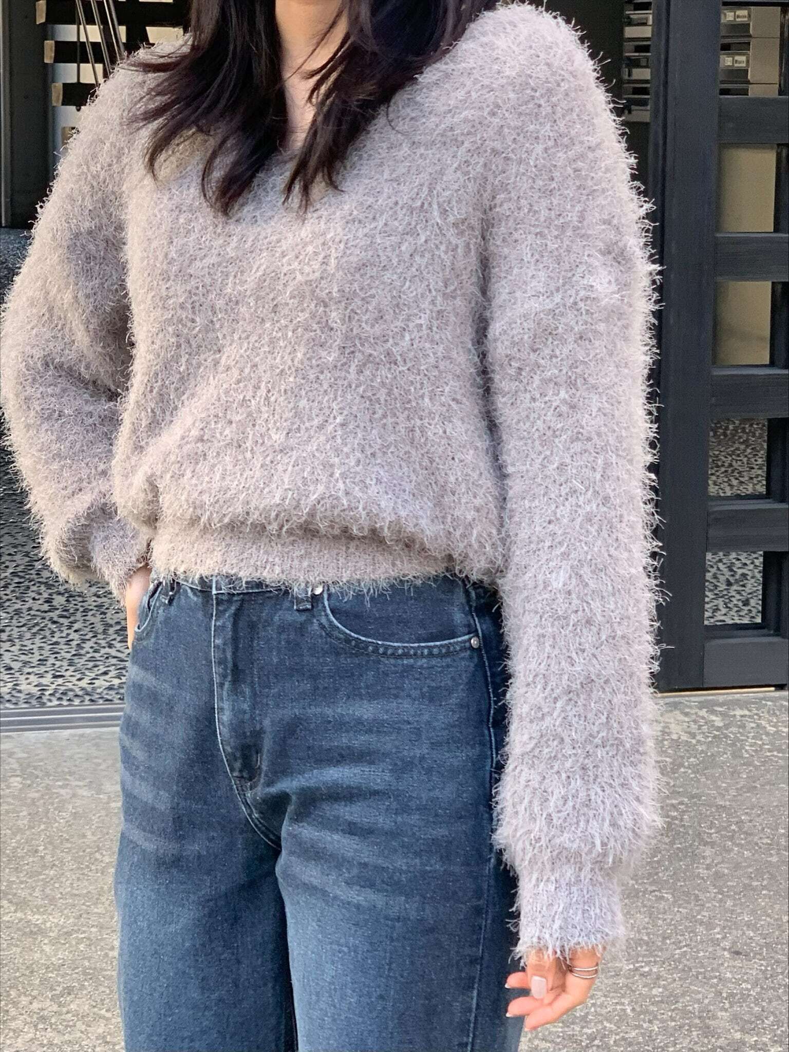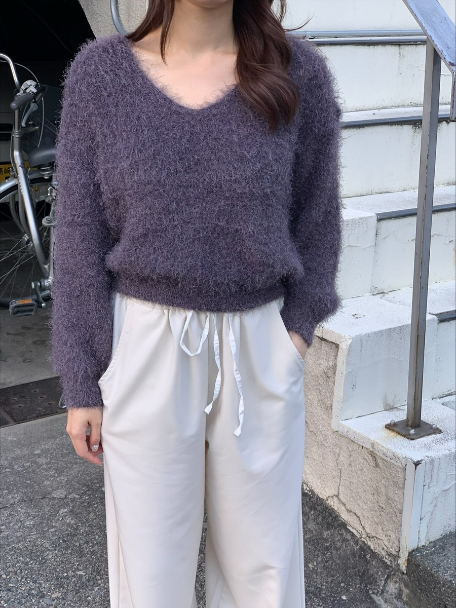 ふわふわな素材が魅力的アイテムでVネックが首元をすっきりとみせ顔回りも明るくなります。