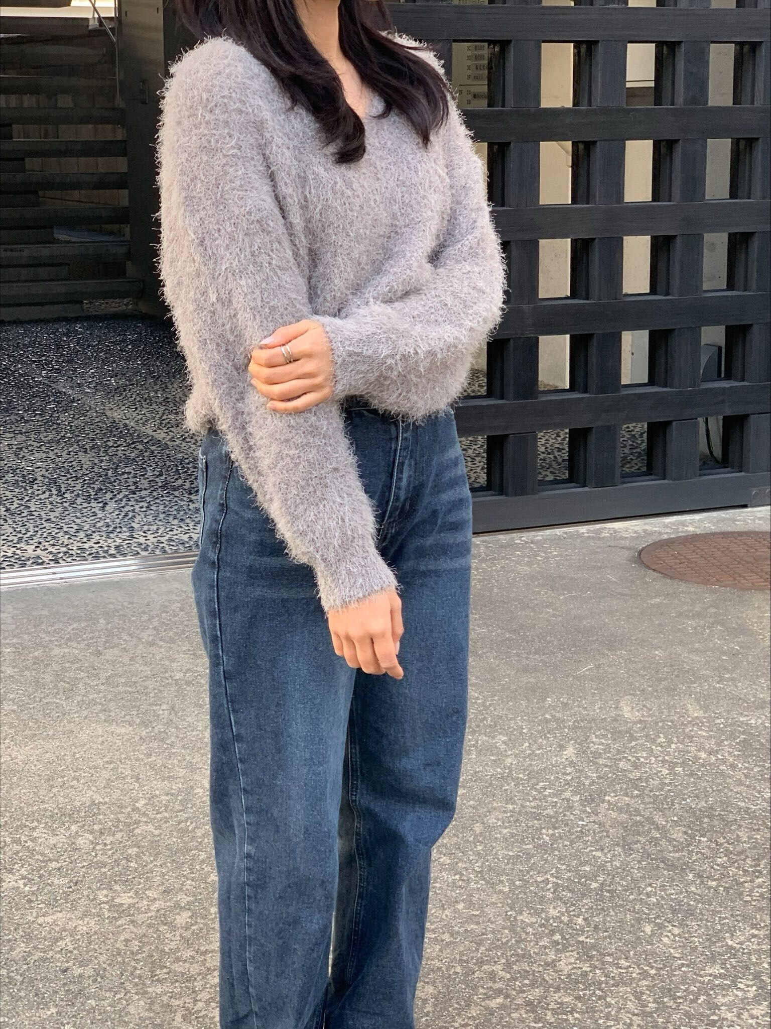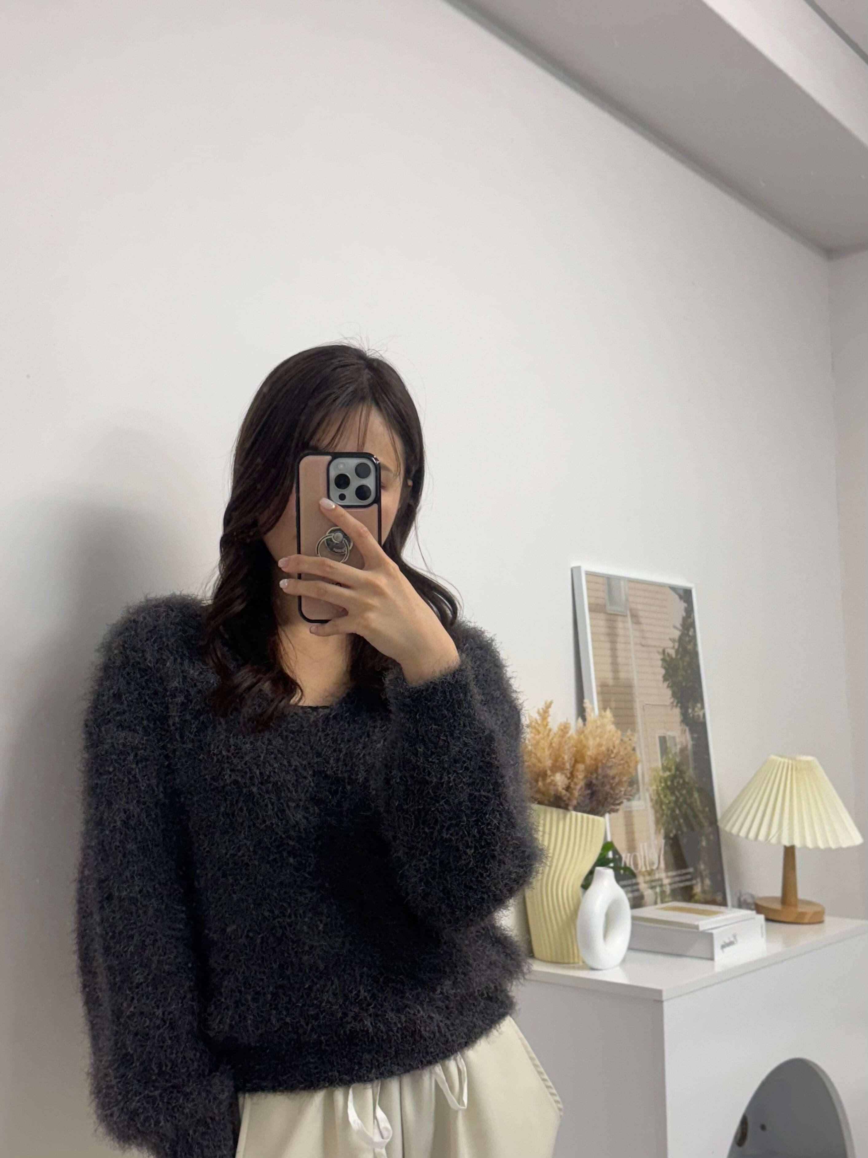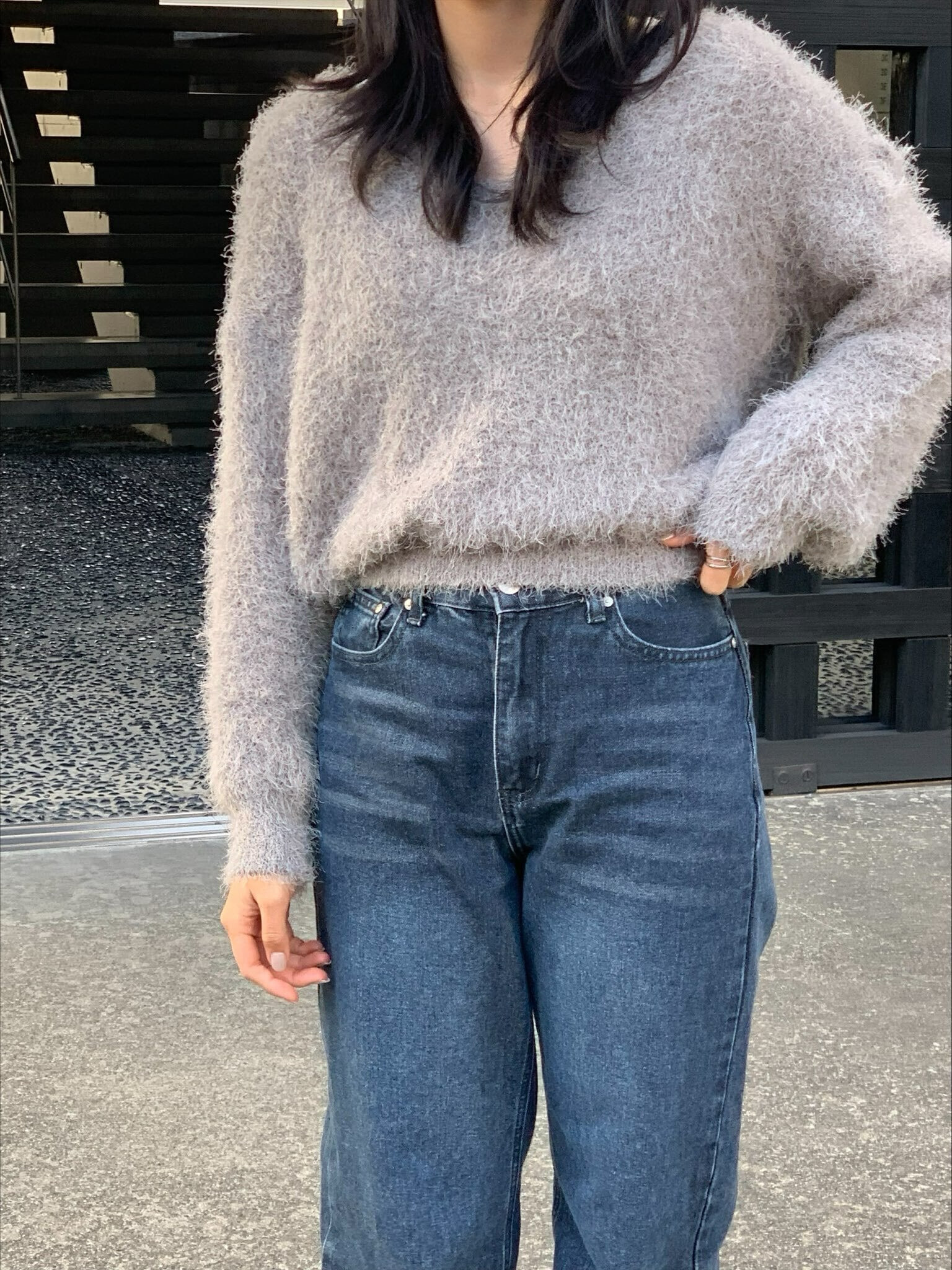 ふわふわな素材が魅力的アイテムでVネックが首元をすっきりとみせ顔回りも明るくなります。