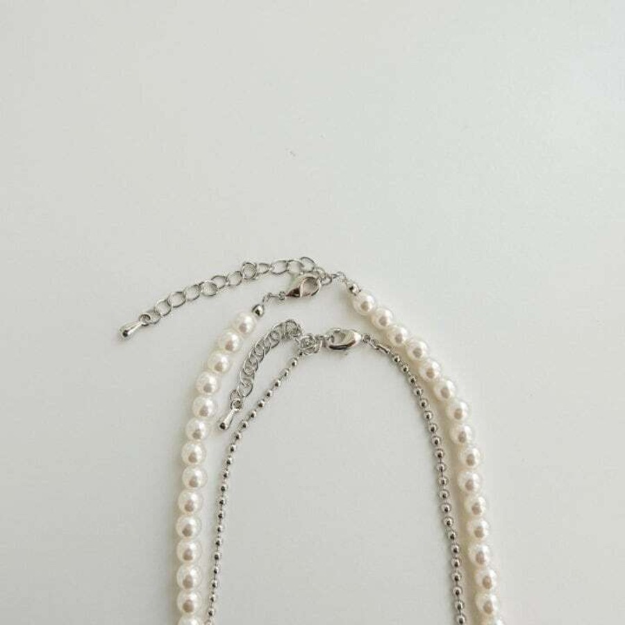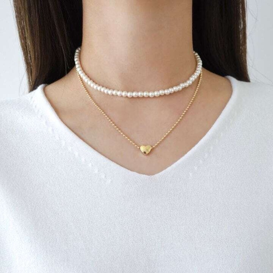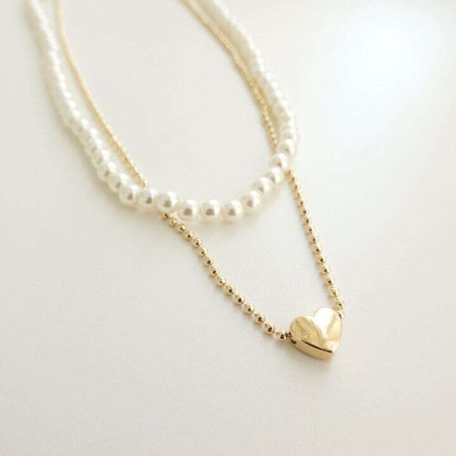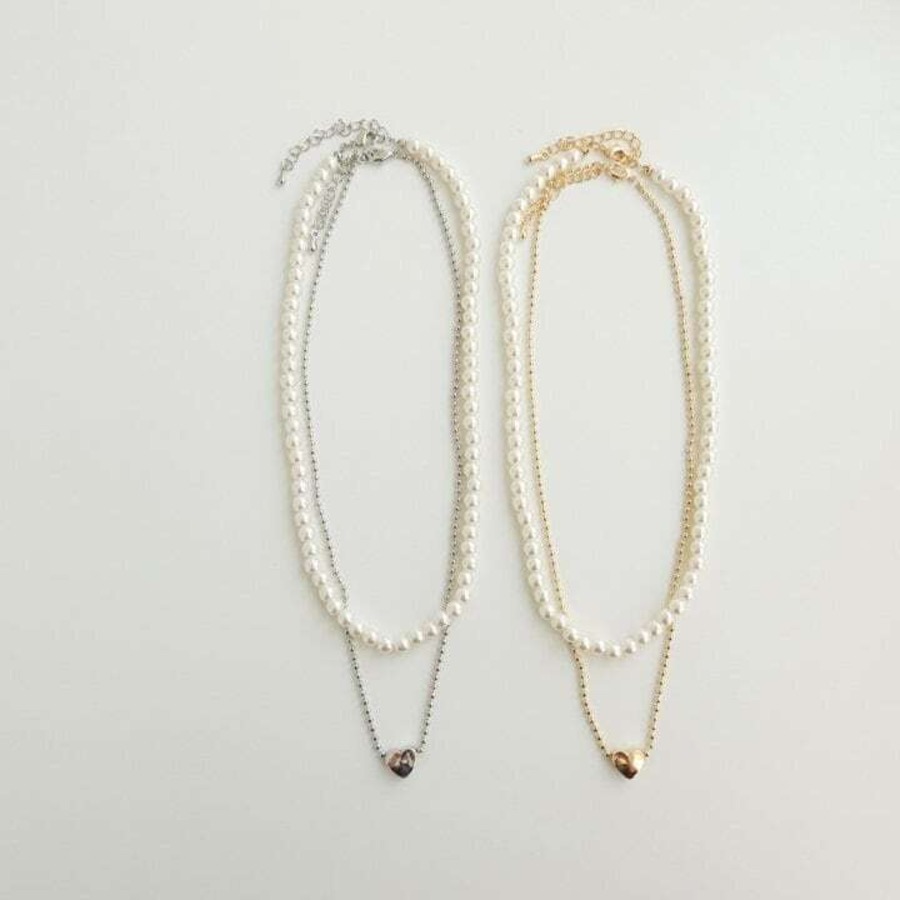 パールとセットのネックレス。ハートのチャームがポイントで華やかになります。別々で着用することができるのでスタイリングの幅も広がります。